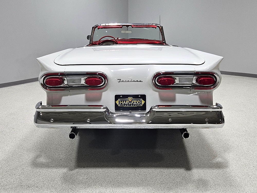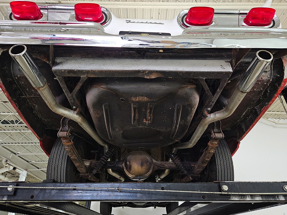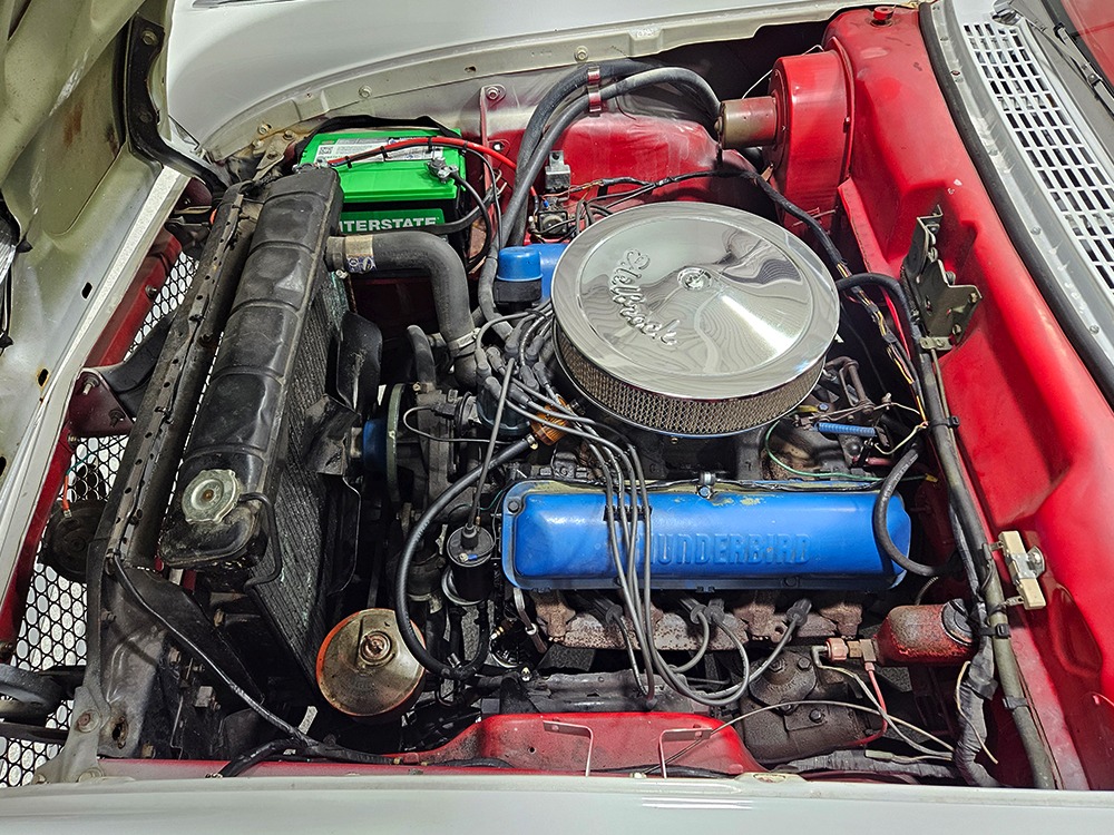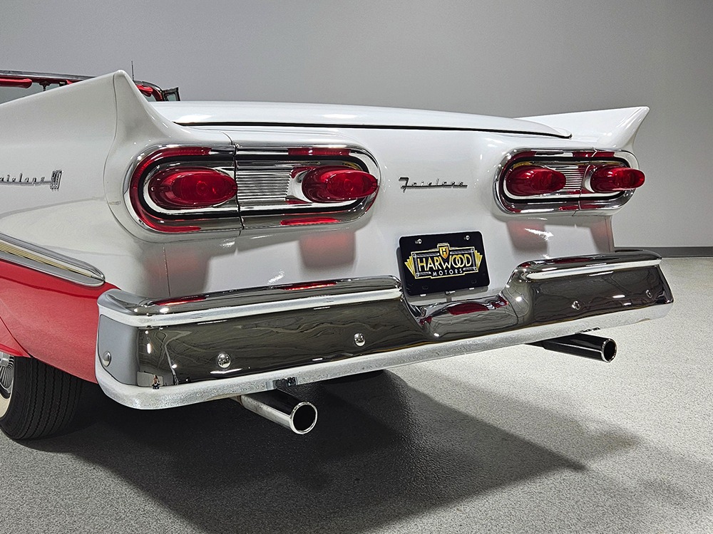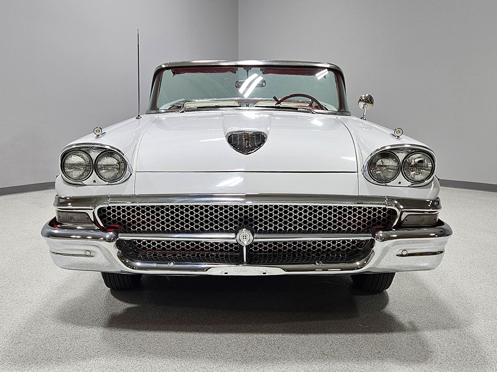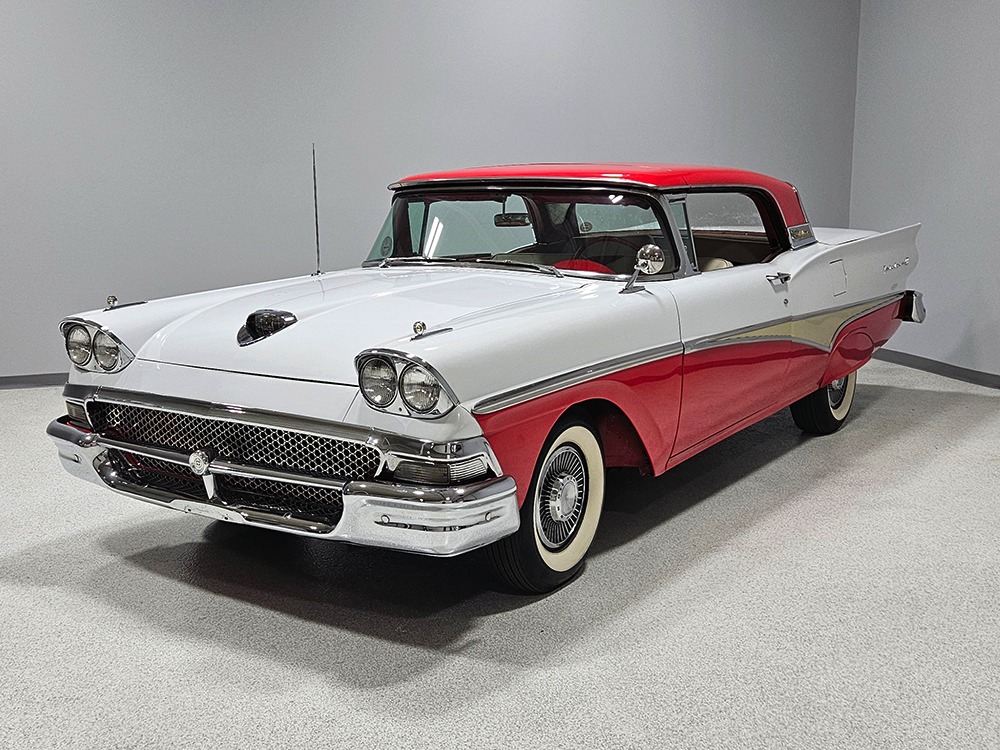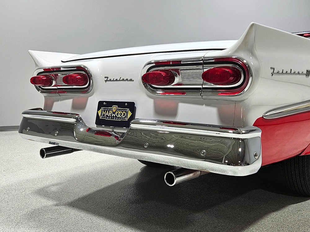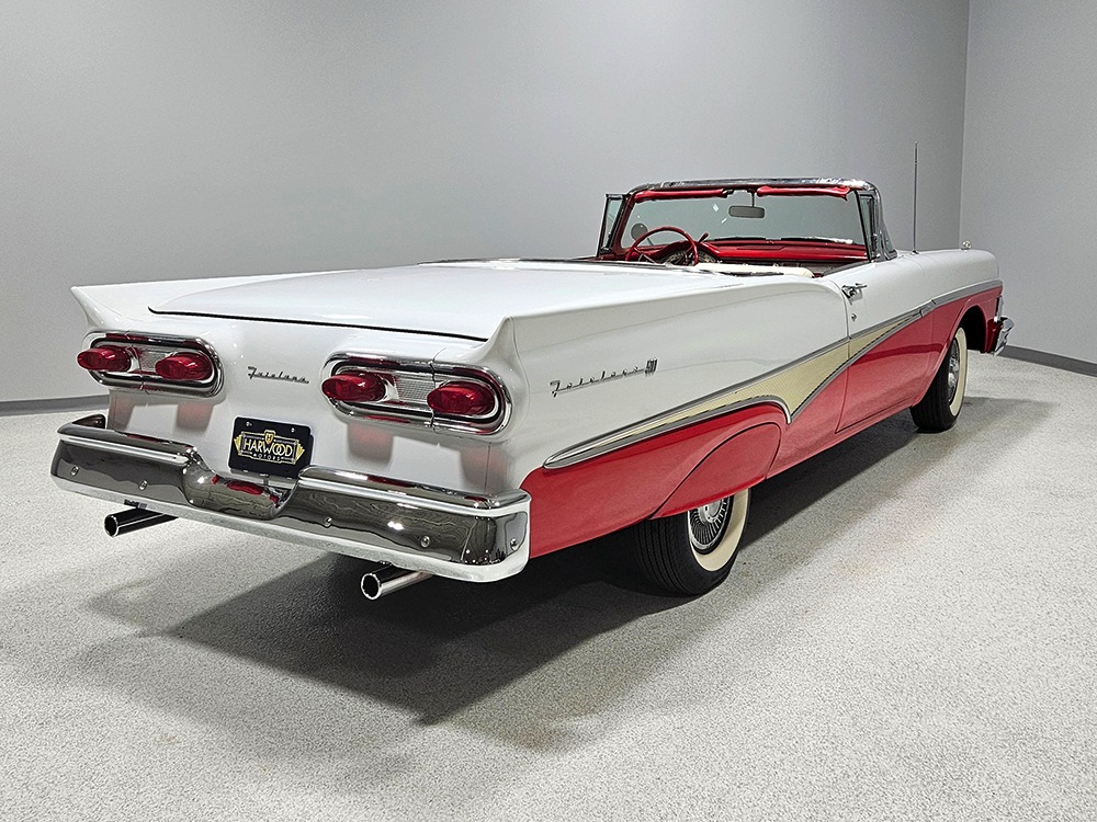 Travel is easy with Ford’s all-new-for-1958 G-code 332 cubic inch V8. Rated at 265 horsepower with a 4-barrel carburetor, it’s a good match for the Skyliner’s mass, which isn’t insignificant. Nevertheless, the strong-running FE motor never seems to work very hard and makes great V8 sounds as it goes about its business. It starts easily and after a few seconds settles into an easy idle that you can hear but not feel. It’s also finished in Ford Blue engine enamel with a chrome air cleaner and “Thunderbird” valve covers. Power steering is a nice addition on a 4200-pound convertible and most of the fittings and hardware are correct Ford pieces. Most Skyliners used Ford’s 3-speed Cruise-O-Matic automatic transmission, and that’s what you’ll find in this one as well. It’s really the right choice, and with 2.69 gears out back, it remains an effortless highway cruiser. Ford’s X-frame is incredibly robust for the big convertible and it’s in great shape with no signs of accident damage in its past. There are floor patches in the lower rear trunk, which is where water tends to collect in these cars and you won’t find many that haven’t been patched in this area. It doesn’t present any issues today and the important areas are quite solid, including the rocker areas and floors. A newer dual exhaust system with just the right rumble to it gives the Skyliner just a bit of an attitude. Also note that the brakes have been serviced, the power steering doesn’t make any unpleasant noises, and it sits on right-sized G78-14 wide whitewalls that are ideal for a 1950s cruiser.