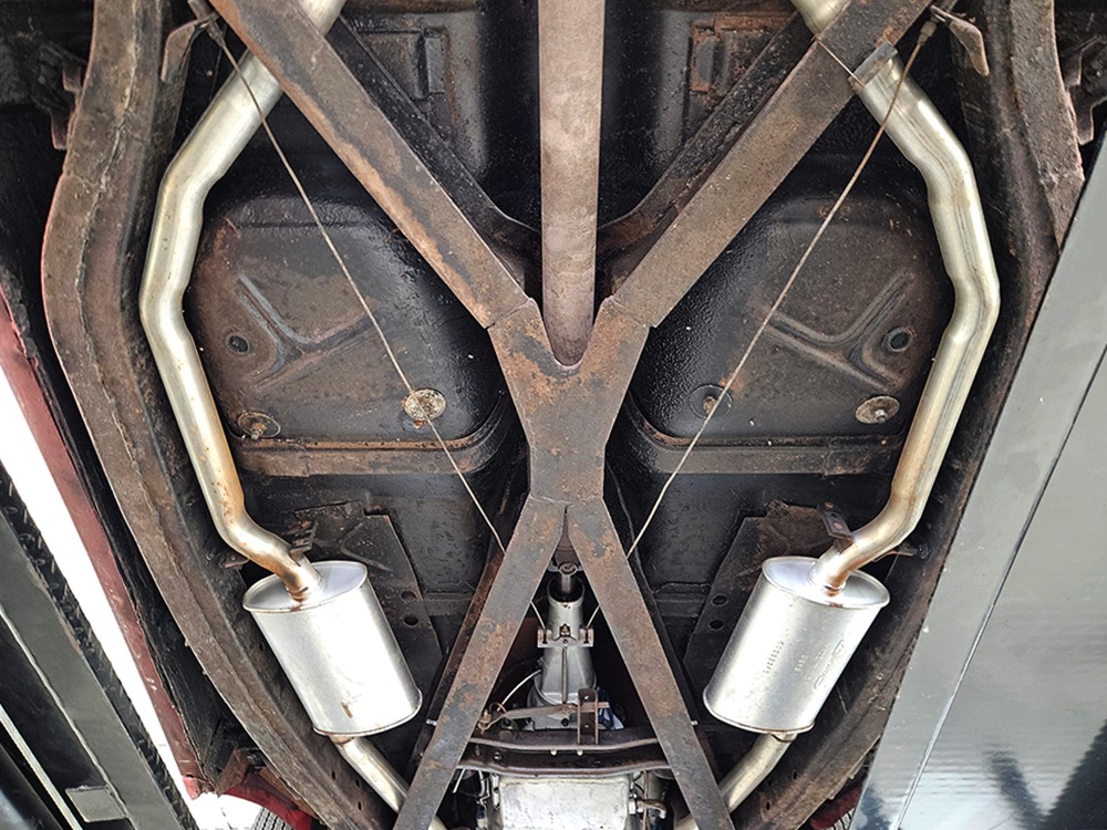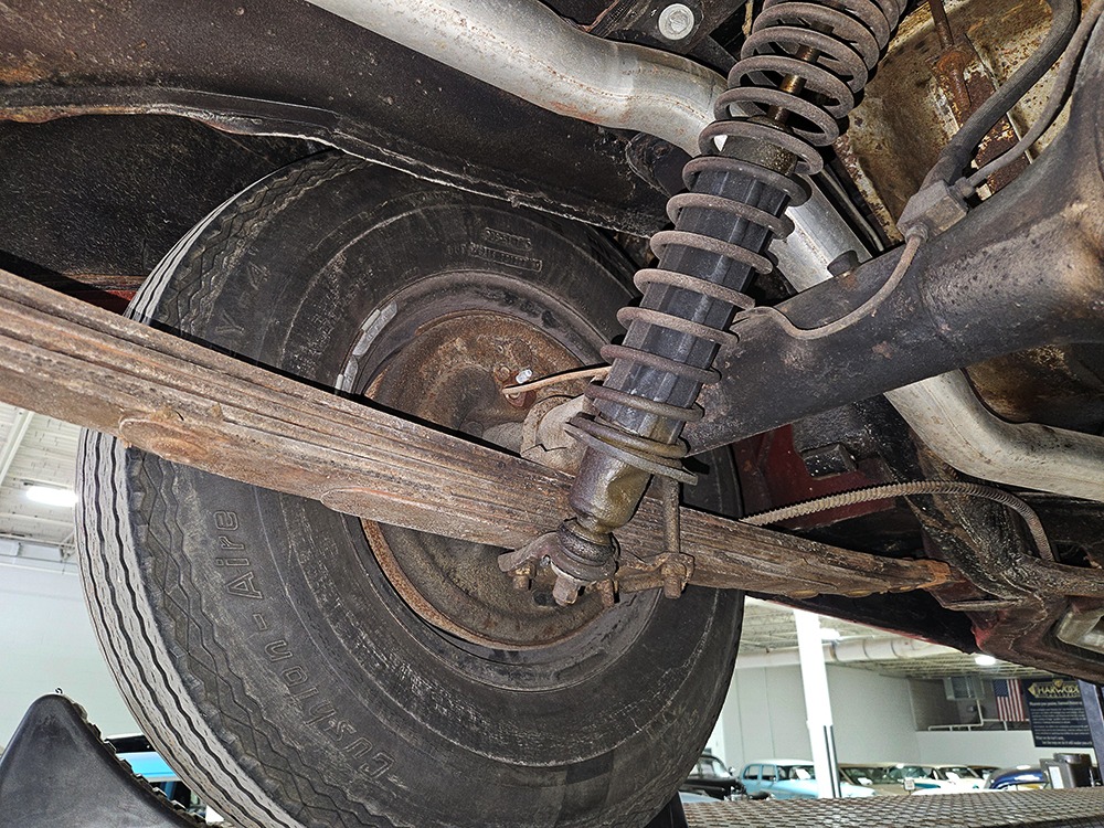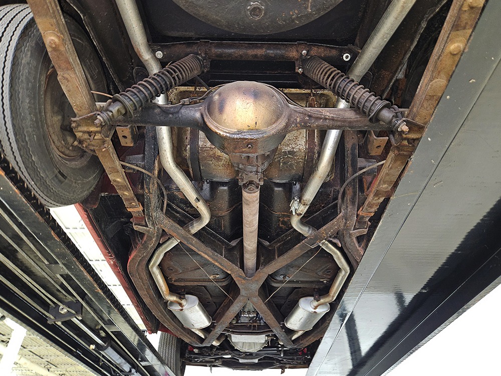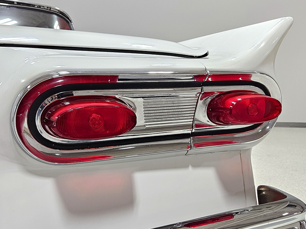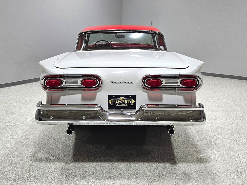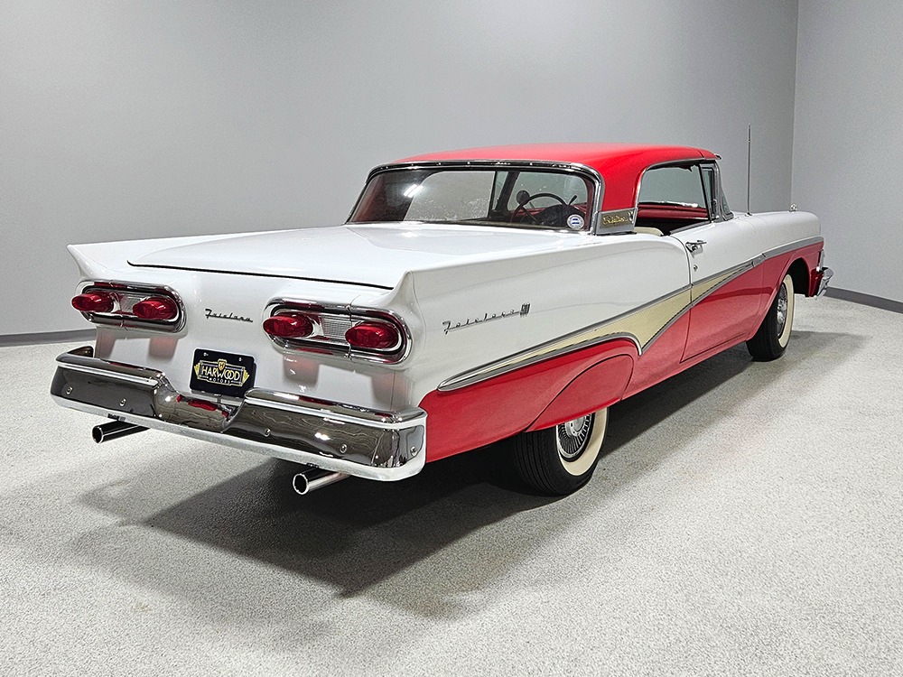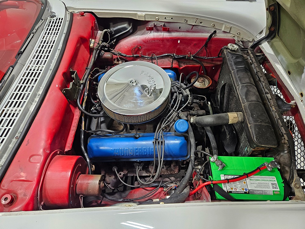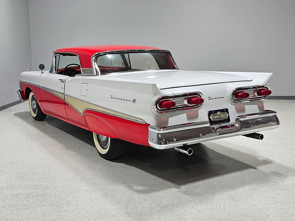 Travel is easy with Ford’s all-new-for-1958 G-code 332 cubic inch V8. Rated at 265 horsepower with a 4-barrel carburetor, it’s a good match for the Skyliner’s mass, which isn’t insignificant. Nevertheless, the strong-running FE motor never seems to work very hard and makes great V8 sounds as it goes about its business. It starts easily and after a few seconds settles into an easy idle that you can hear but not feel. It’s also finished in Ford Blue engine enamel with a chrome air cleaner and “Thunderbird” valve covers. Power steering is a nice addition on a 4200-pound convertible and most of the fittings and hardware are correct Ford pieces. Most Skyliners used Ford’s 3-speed Cruise-O-Matic automatic transmission, and that’s what you’ll find in this one as well. It’s really the right choice, and with 2.69 gears out back, it remains an effortless highway cruiser. Ford’s X-frame is incredibly robust for the big convertible and it’s in great shape with no signs of accident damage in its past. There are floor patches in the lower rear trunk, which is where water tends to collect in these cars and you won’t find many that haven’t been patched in this area. It doesn’t present any issues today and the important areas are quite solid, including the rocker areas and floors. A newer dual exhaust system with just the right rumble to it gives the Skyliner just a bit of an attitude. Also note that the brakes have been serviced, the power steering doesn’t make any unpleasant noises, and it sits on right-sized G78-14 wide whitewalls that are ideal for a 1950s cruiser.