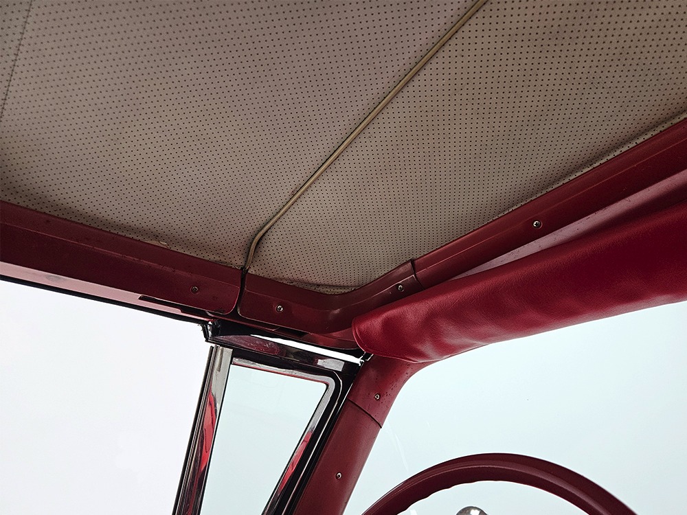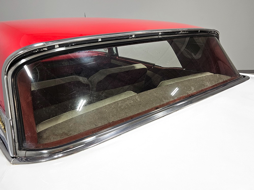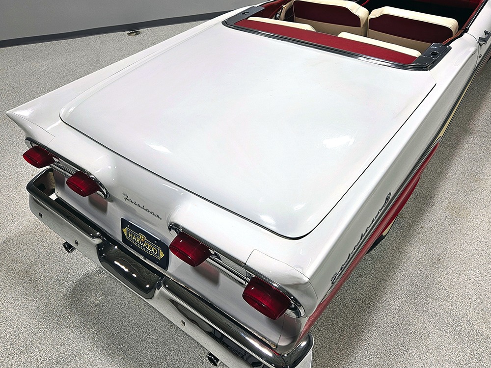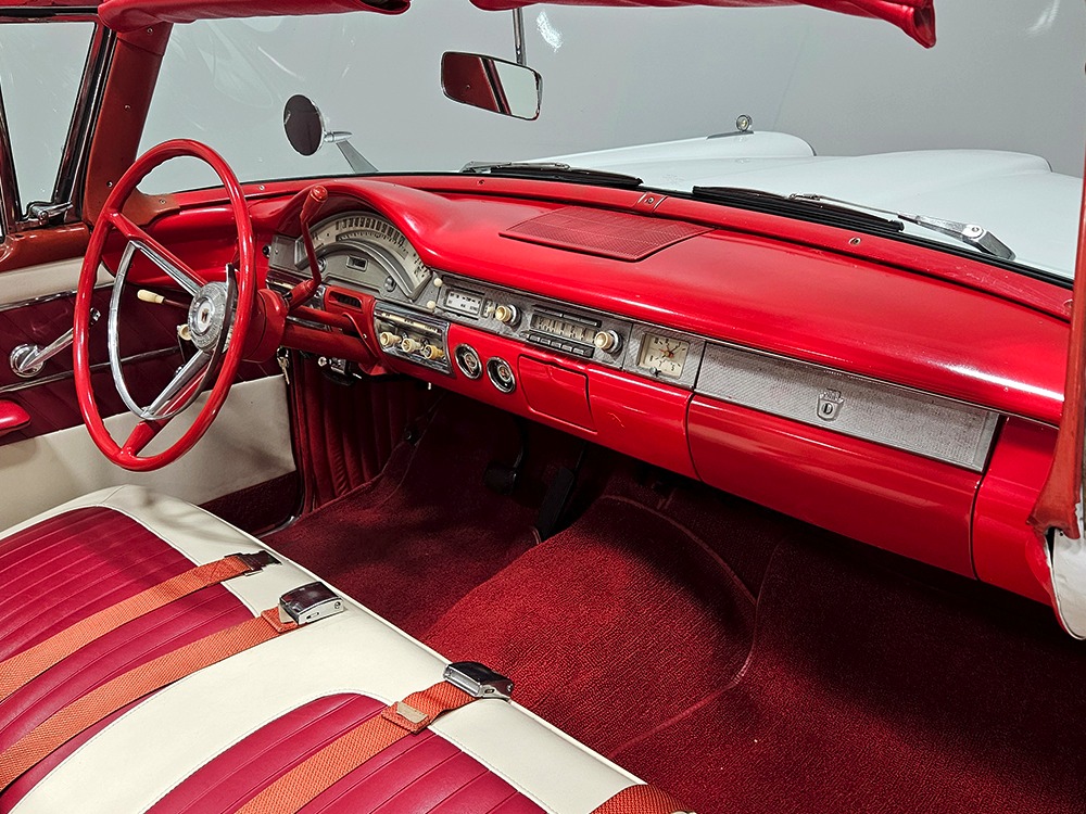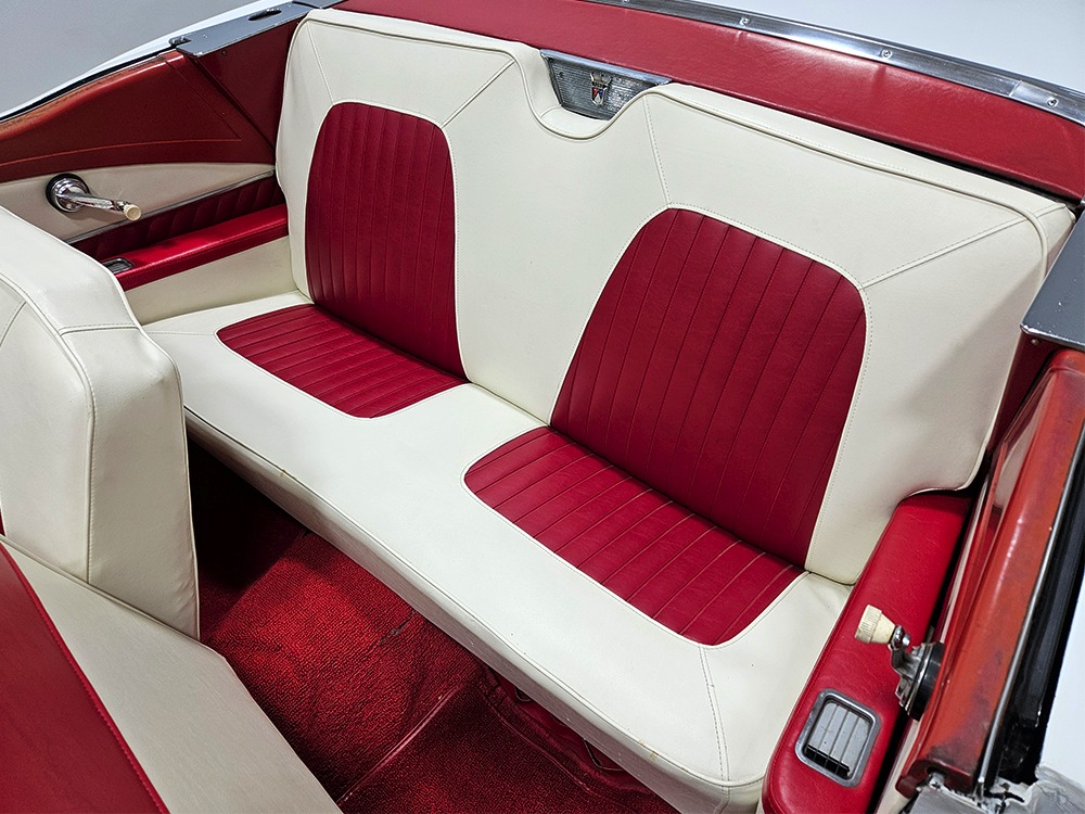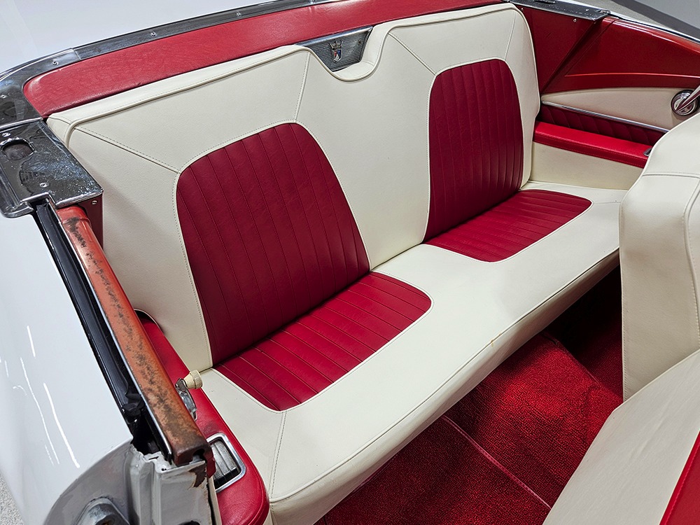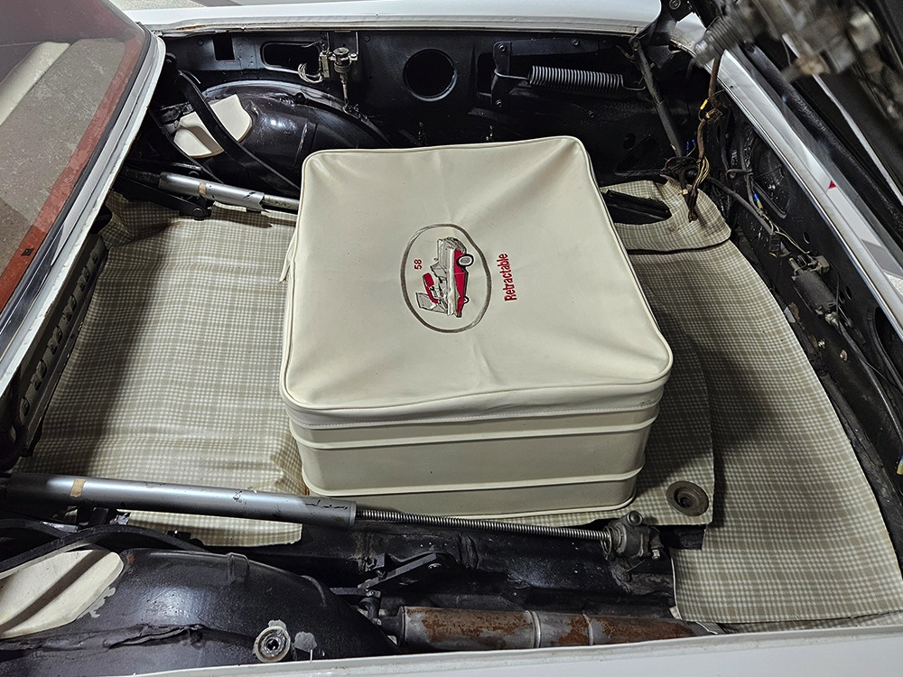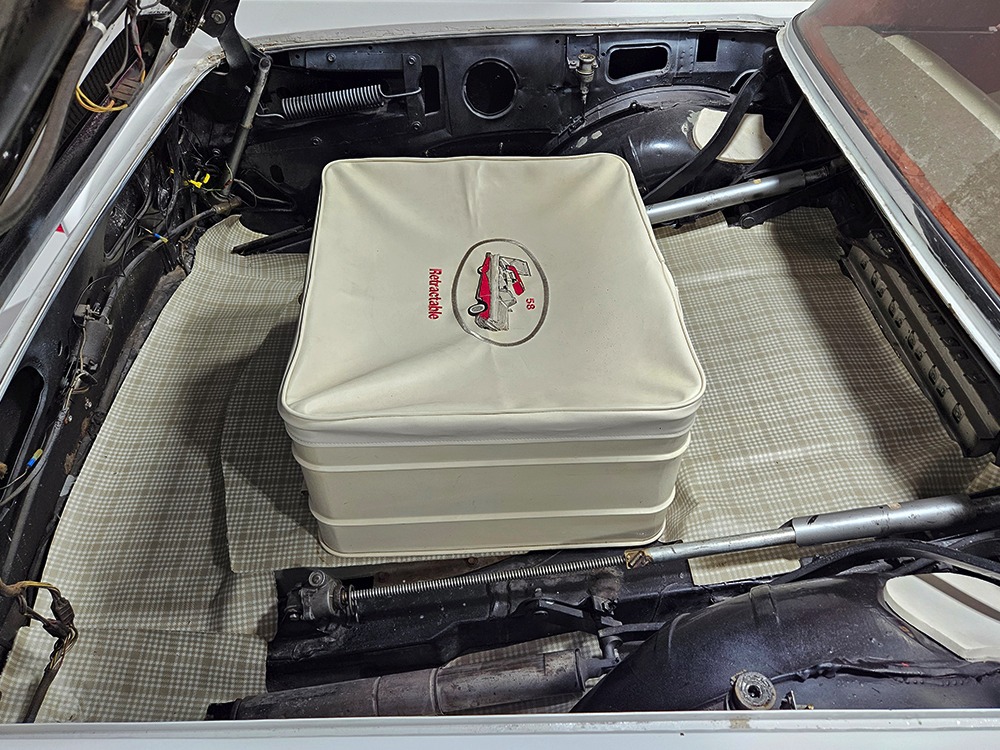 It sports correct red and white vinyl upholstery that matches the bodywork and adds to the Retractable’s upscale image. Most importantly, the top has been recently serviced, and all seven motors, four lift jacks, a series of relays, ten limit switches, ten solenoids, four locking mechanisms for the roof and two locking mechanisms for the trunk lid, and a total of 610 feet of wiring are all in excellent health. Touch the rocker switch under the dash to release the header then pull the knob and the whole beautiful mechanical system springs into action and makes the top disappear in about 30 seconds. The only place you might need to compromise is in the trunk, where there’s a lot of space with the top up but only a small cooler-sized box for luggage if you intend to travel with the top down.