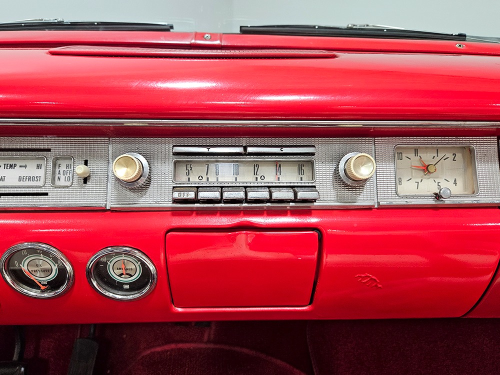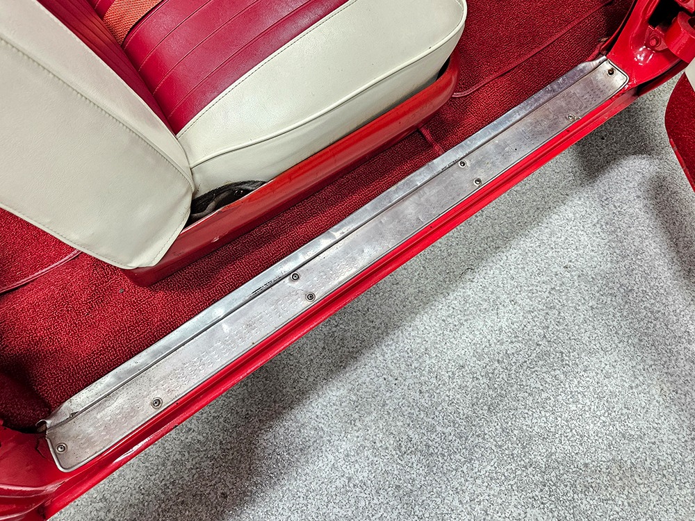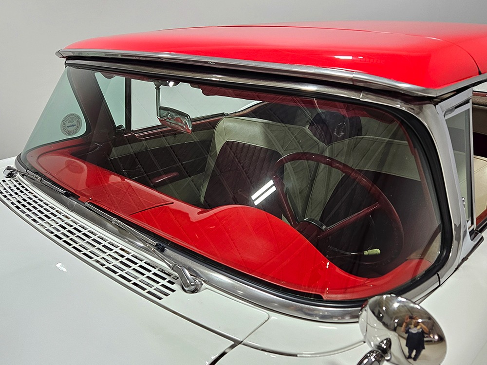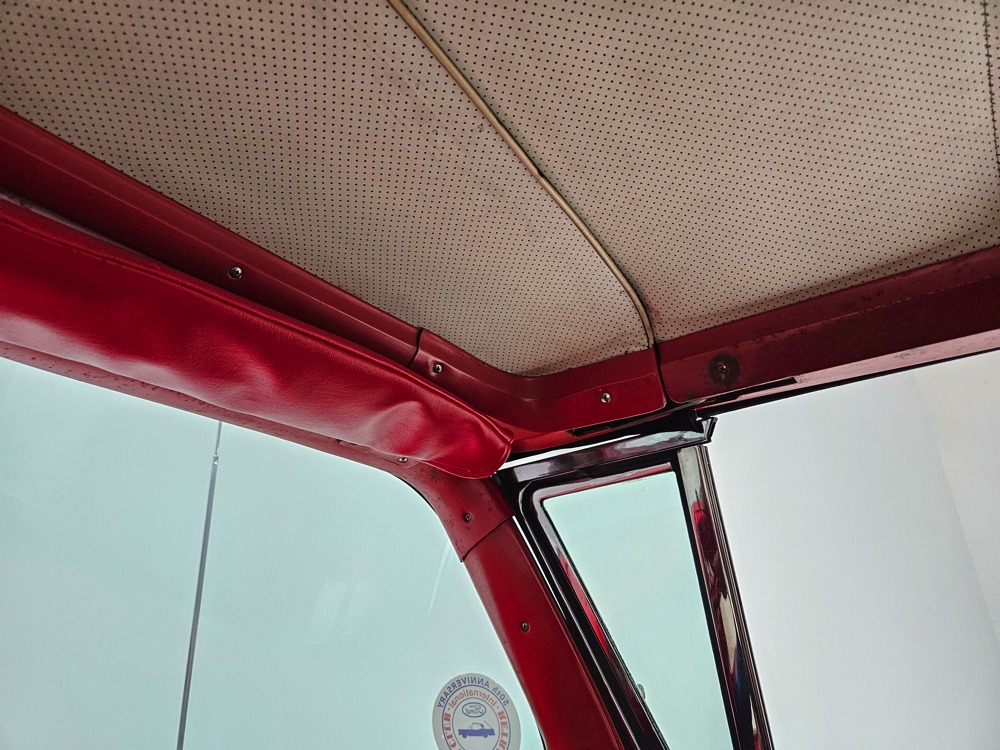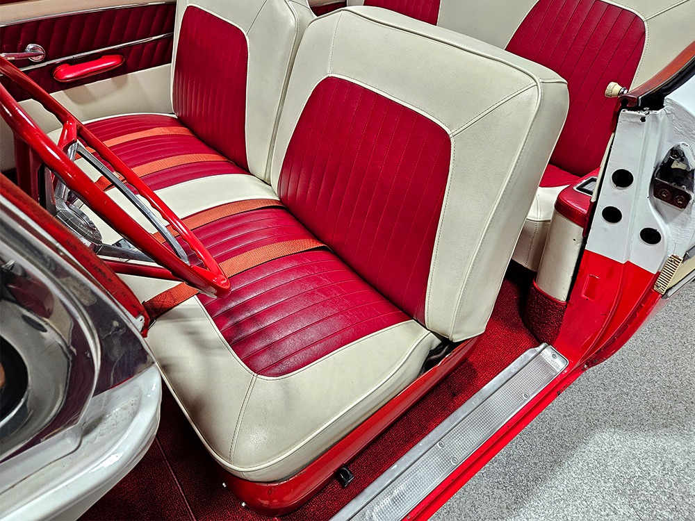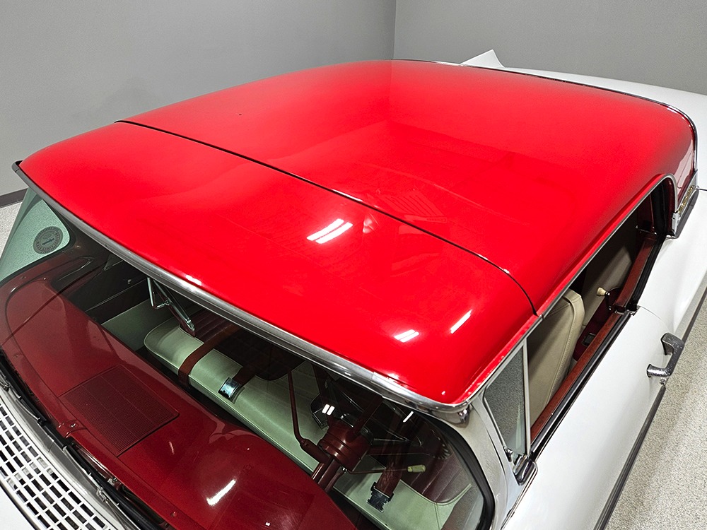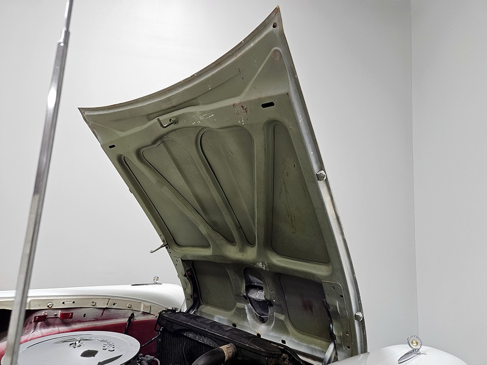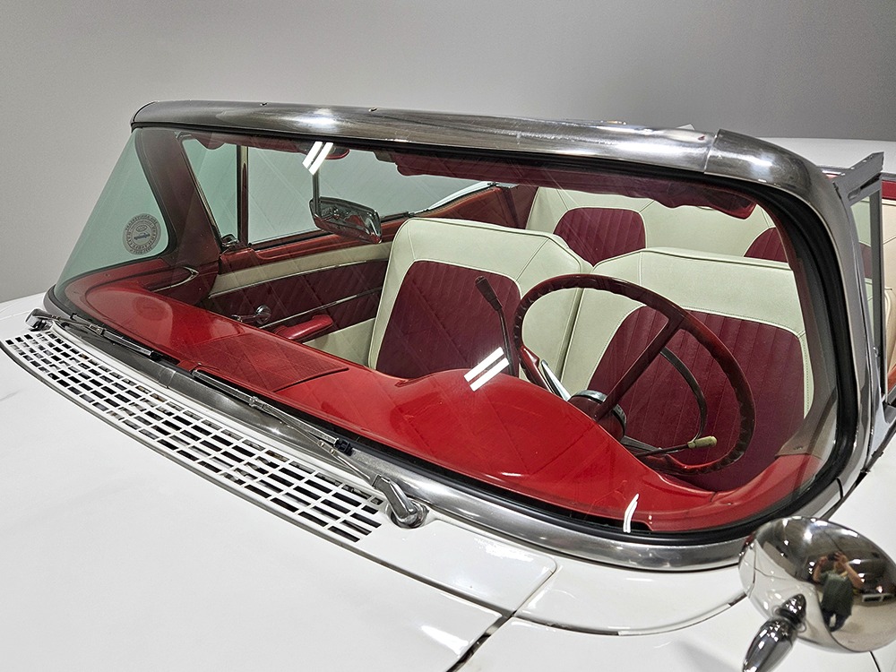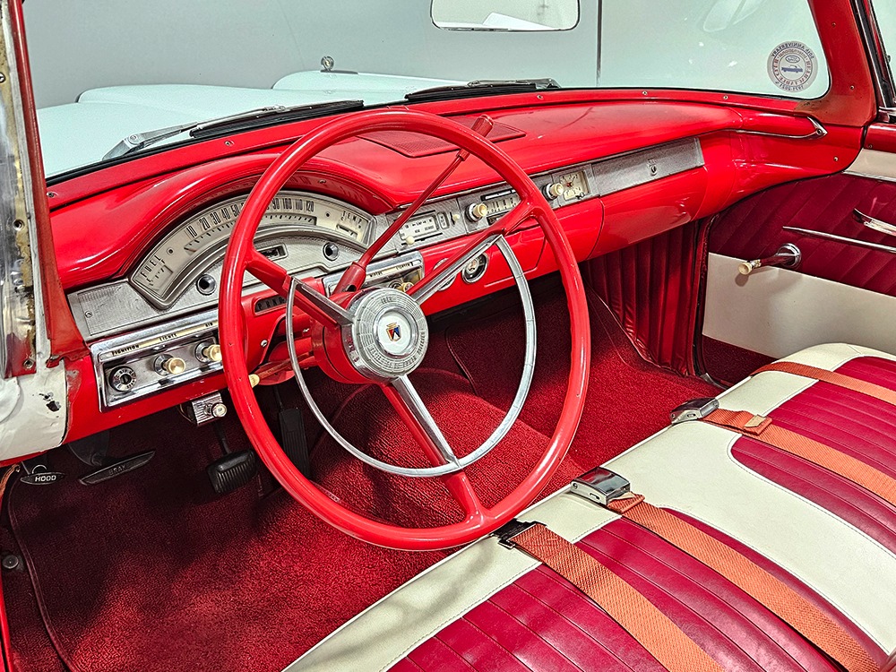 It sports correct red and white vinyl upholstery that matches the bodywork and adds to the Retractable’s upscale image. Most importantly, the top has been recently serviced, and all seven motors, four lift jacks, a series of relays, ten limit switches, ten solenoids, four locking mechanisms for the roof and two locking mechanisms for the trunk lid, and a total of 610 feet of wiring are all in excellent health. Touch the rocker switch under the dash to release the header then pull the knob and the whole beautiful mechanical system springs into action and makes the top disappear in about 30 seconds. The only place you might need to compromise is in the trunk, where there’s a lot of space with the top up but only a small cooler-sized box for luggage if you intend to travel with the top down.