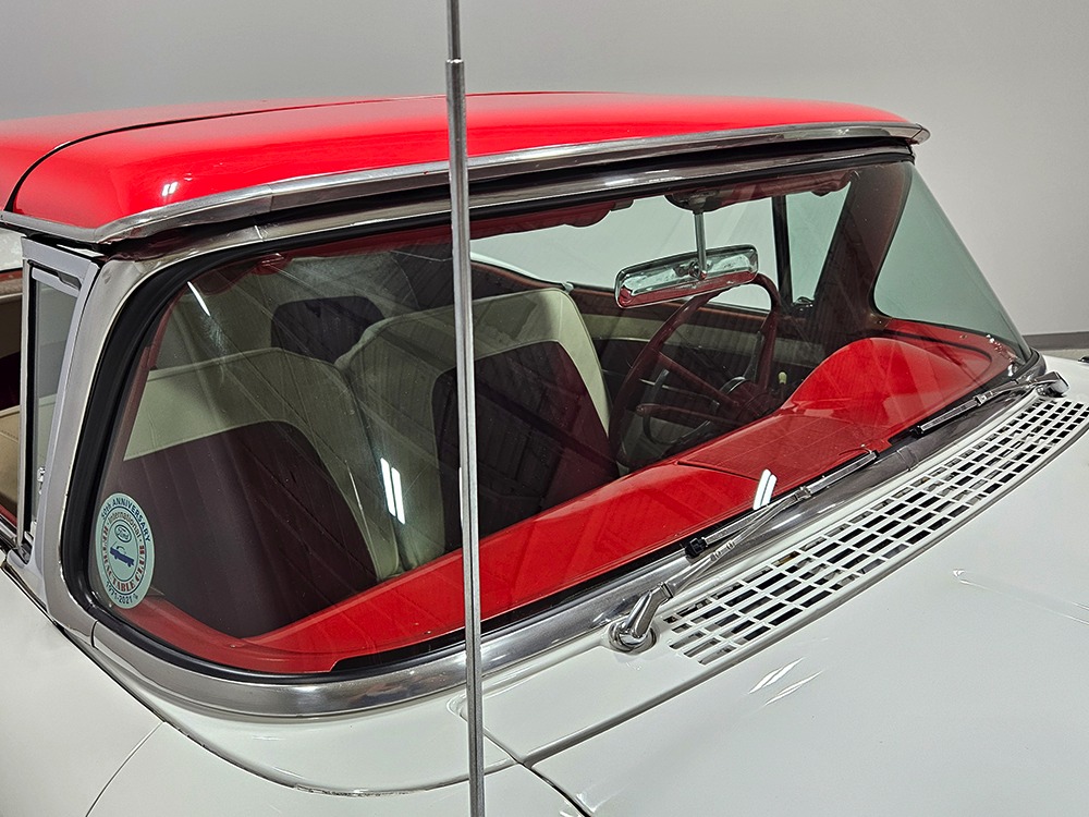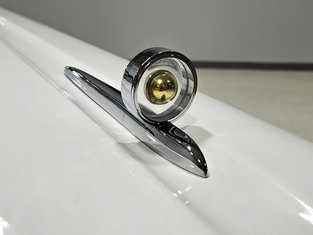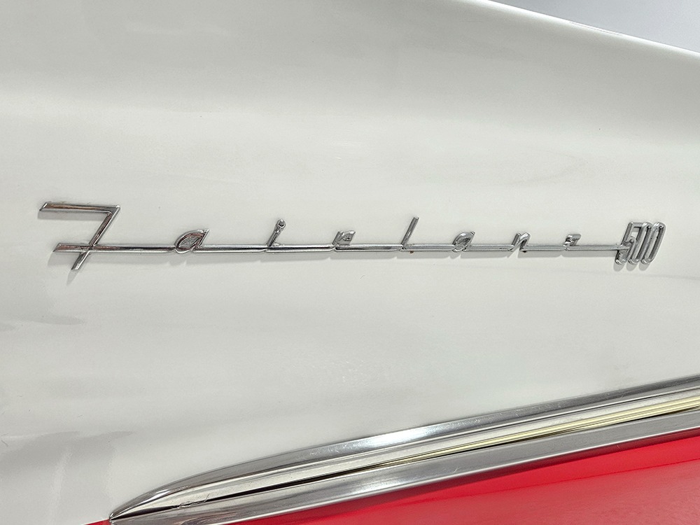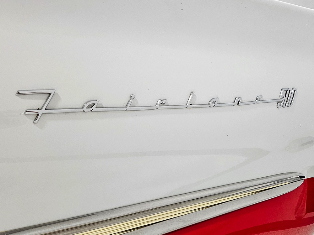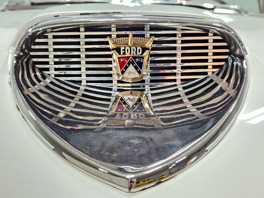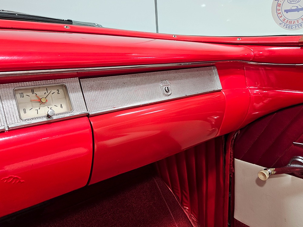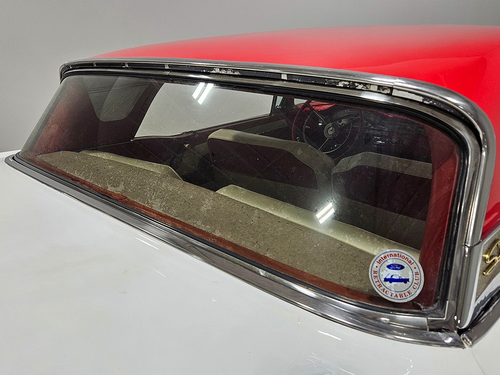 The Retractable is an icon of ‘50s tech and style, and they always look best wearing flashy two-tone paint combinations like this car’s Colonial White over Torch Red. It’s crisp, clean, and bright, and you have to admit, you’re not buying a Retractable because it’s subtle. It’s a mostly original car that’s holding up well and thanks to a recent repaint, this Ford remains a one-car parade. Experts will note that this one was originally Raven Black, but there’s just no trace of the black paint anywhere, suggesting it was a thorough job when the time came to change colors. There’s an appropriate shine to the paint, not too modern and perfect but just right for a car that you’re going to drive. Panel fit is good, including the deck lid, which snugs itself down properly, and the doors which don’t sag a bit. There are a few minor issues, but none of them should stop you from enjoying the car. As a product of the ‘50s, there’s a lot of chrome and stainless trim, including Ford’s distinctive side spear with the gold anodized insert. All of it remains in good to excellent condition, including the massive grille up front and unique stainless quarter trim with gold anodized inserts.