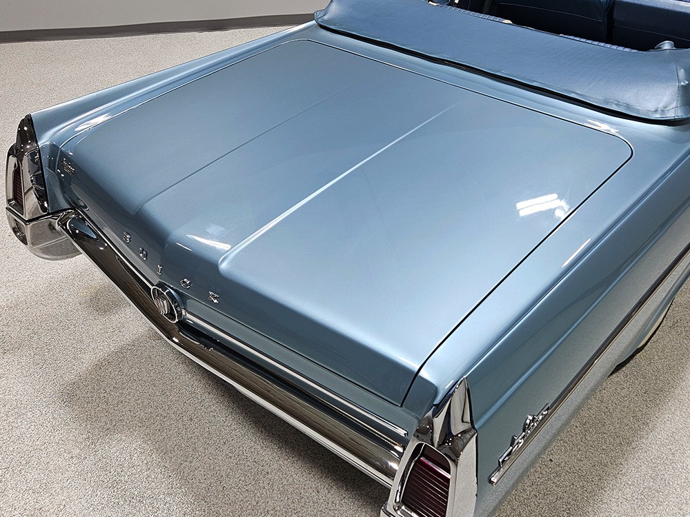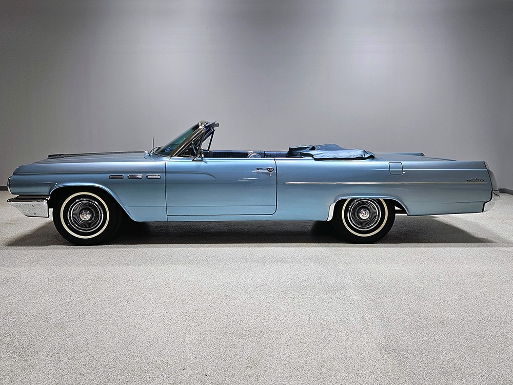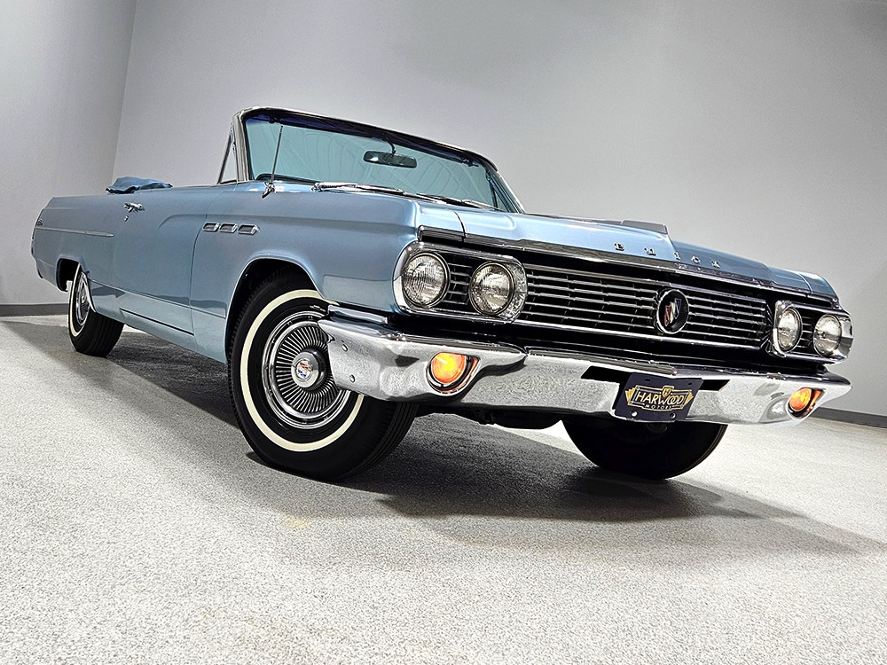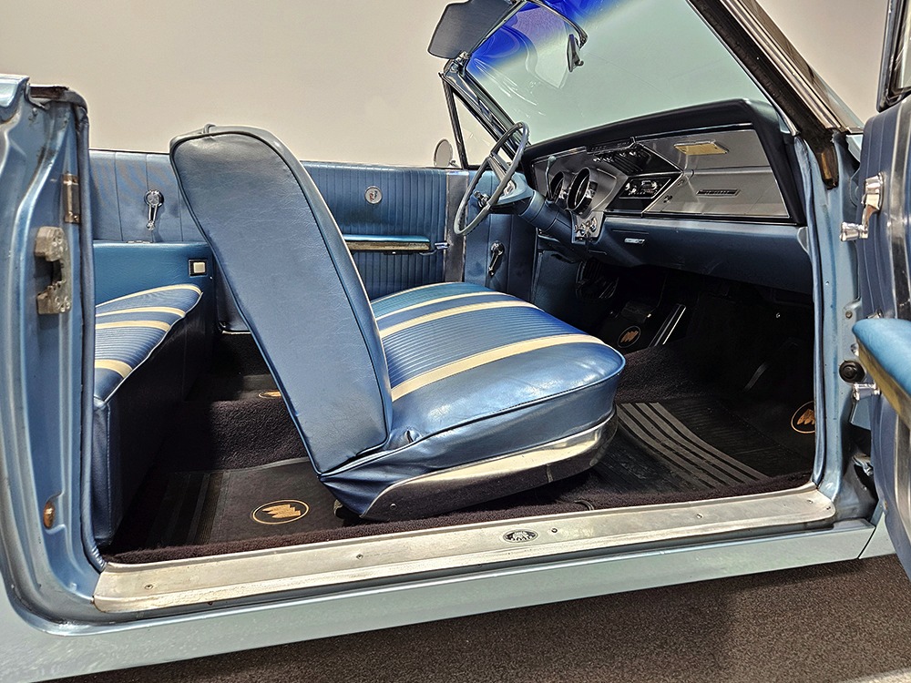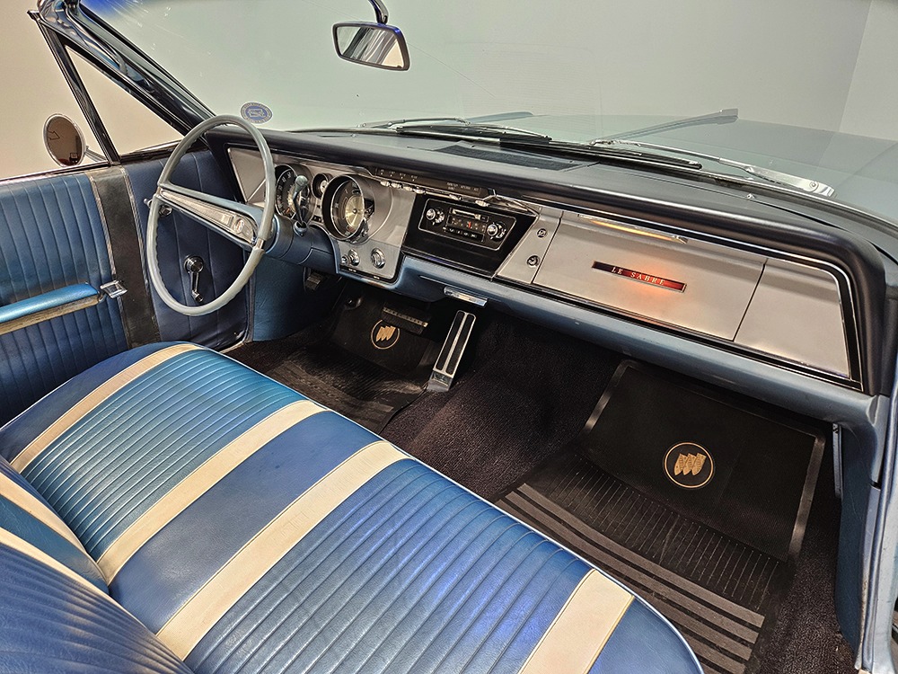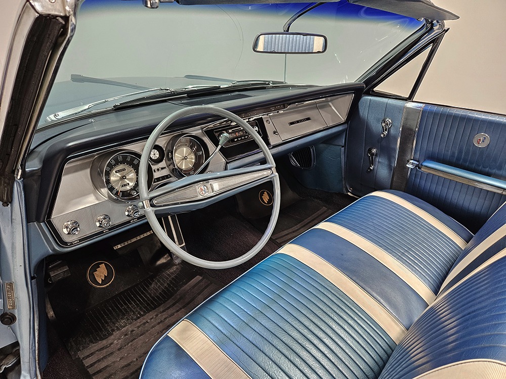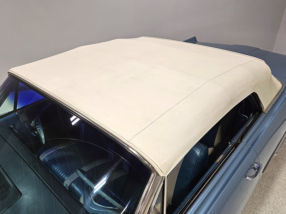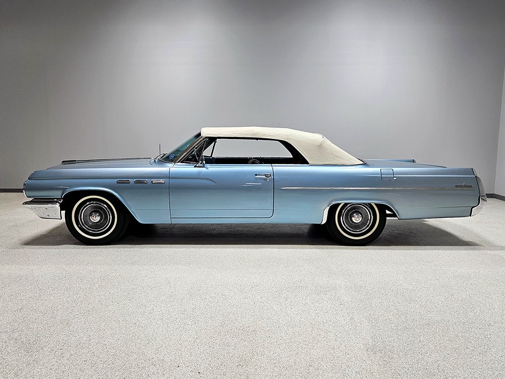 Buick knew who they were in 1963. The full-sized lineup of cars included some serious luxury backed by performance that was quiet and understated, yet impressive. The Lesabre was the mid-range model, offering full-sized comfort without the full-sized luxury price. This handsome convertible was exactly what thousands of bank presidents and senior advertising execs drove in 1963—upscale yet not excessively flashy. In this car’s case, the paint is an older repaint in the original Marlin Blue and it still shows rather well. Bodywork is quite good and the doors close with a solid sound that you’d all but forgotten was possible on a convertible. As a car that has never been fully apart, it has a robust feeling that’s difficult to restore back into a car once it’s been disassembled. There’s a nice shine to the finish, the body gaps are quite good, and the icy blue suits the large ragtop rather well. There’s still plenty of chrome on a 1963 Buick, all of which is in excellent condition—even the faux “venti-ports” on the front fenders show minimal pitting, which is very unusual. For a mostly original car, it's in fantastic shape!