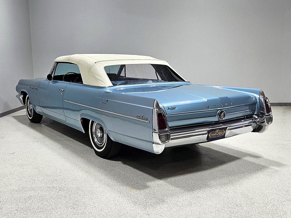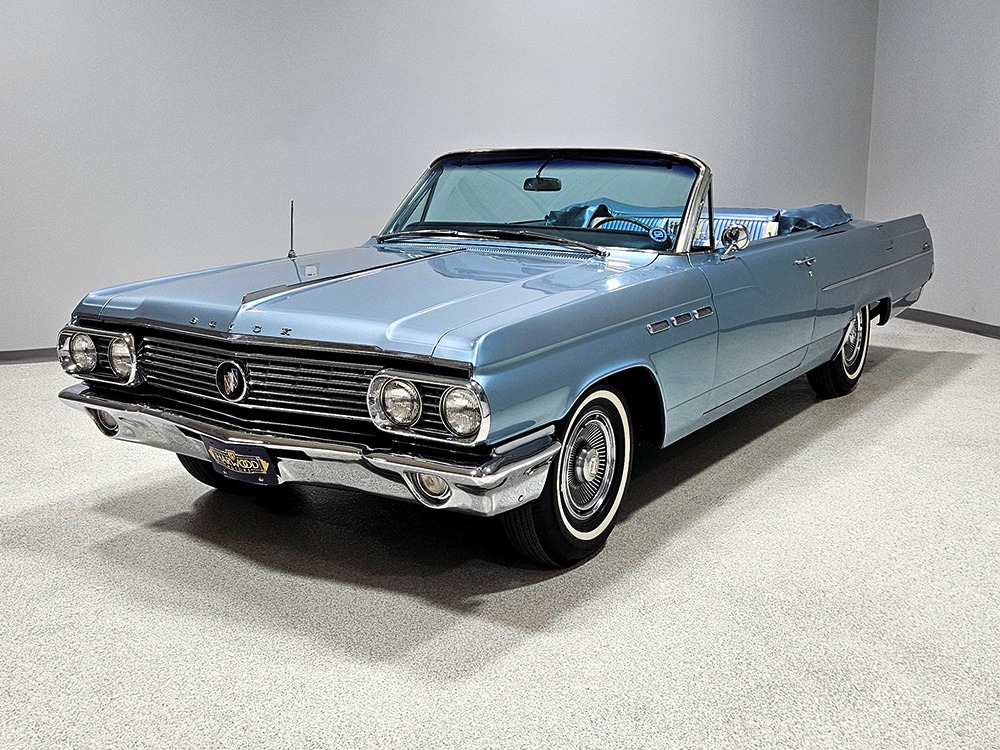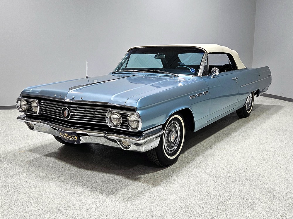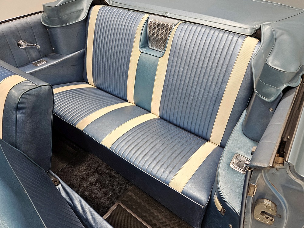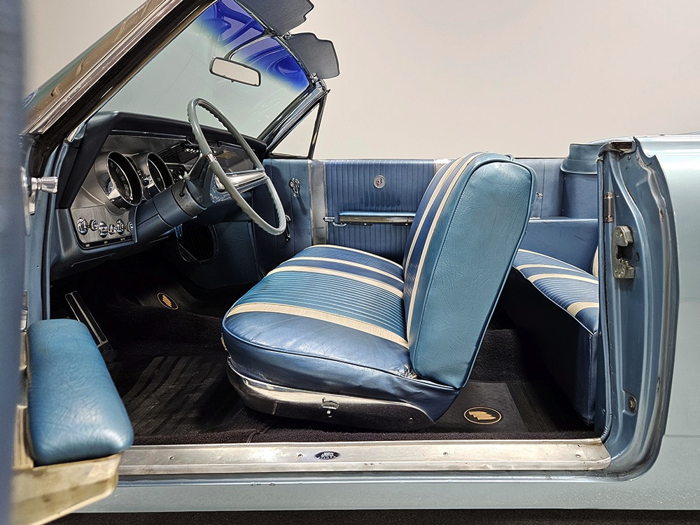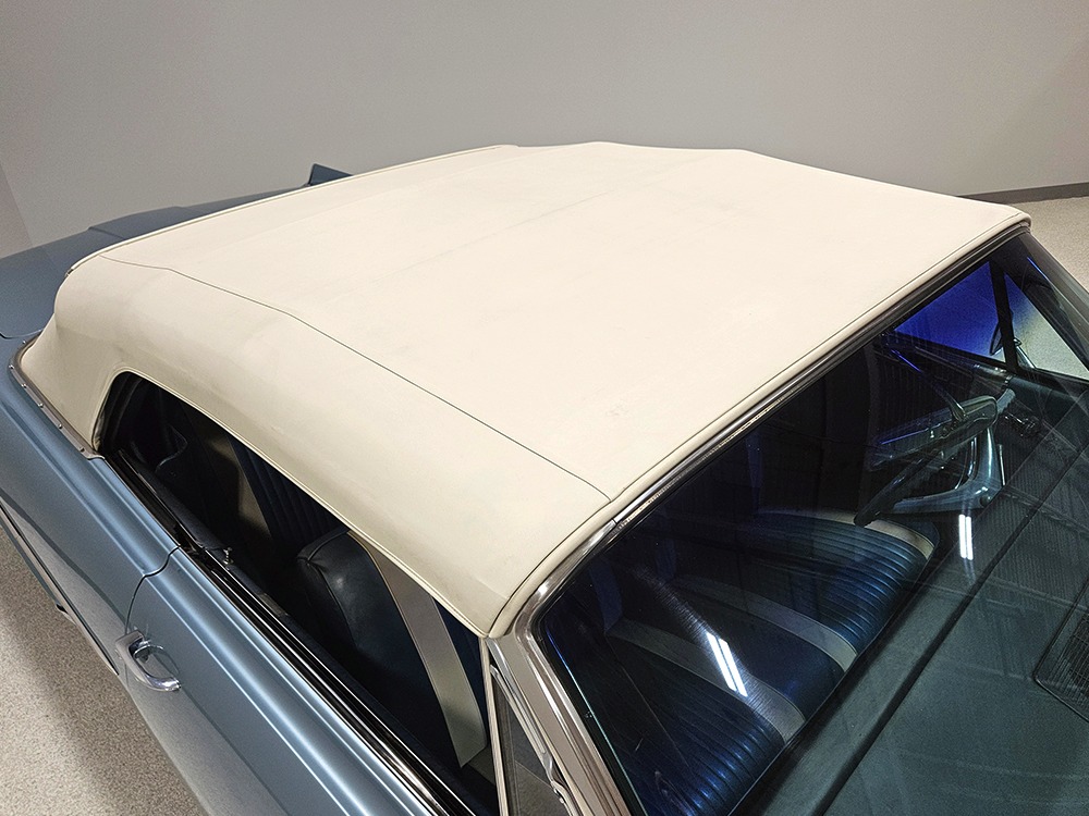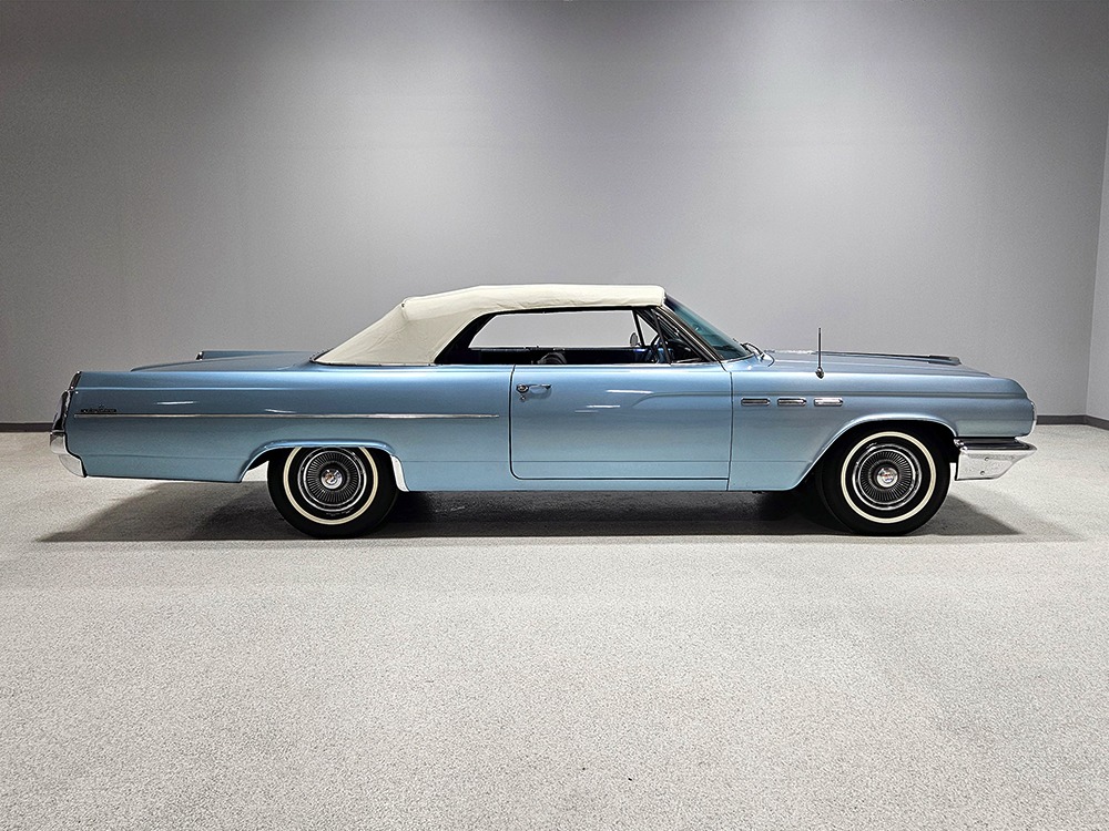 Buick knew who they were in 1963. The full-sized lineup of cars included some serious luxury backed by performance that was quiet and understated, yet impressive. The Lesabre was the mid-range model, offering full-sized comfort without the full-sized luxury price. This handsome convertible was exactly what thousands of bank presidents and senior advertising execs drove in 1963—upscale yet not excessively flashy. In this car’s case, the paint is an older repaint in the original Marlin Blue and it still shows rather well. Bodywork is quite good and the doors close with a solid sound that you’d all but forgotten was possible on a convertible. As a car that has never been fully apart, it has a robust feeling that’s difficult to restore back into a car once it’s been disassembled. There’s a nice shine to the finish, the body gaps are quite good, and the icy blue suits the large ragtop rather well. There’s still plenty of chrome on a 1963 Buick, all of which is in excellent condition—even the faux “venti-ports” on the front fenders show minimal pitting, which is very unusual. For a mostly original car, it's in fantastic shape!