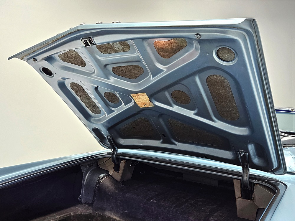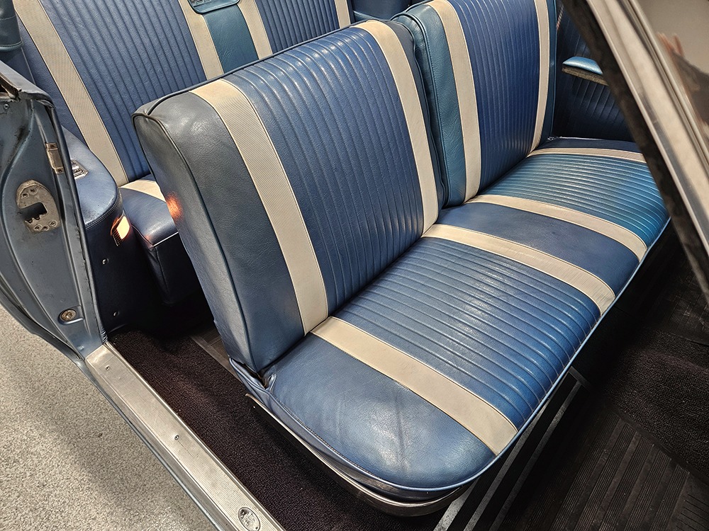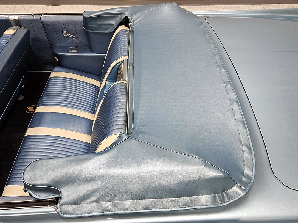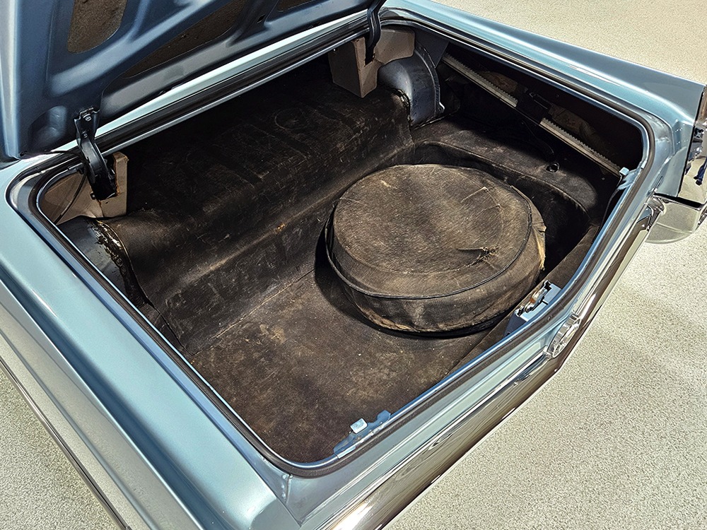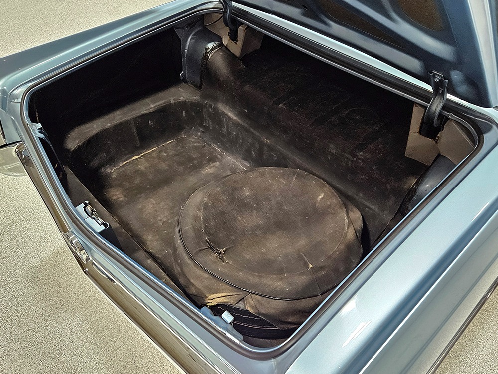 The two-tone blue and white interior is likewise very nicely preserved. The carpets are newer, but the rest appears to be factory-issue and holding up well. There’s a small split in the driver’s seat down near the seatback hinge, but that’s pretty much it for demerits. The door panels are beautifully detailed and shockingly, the steering wheel isn’t falling apart. Nice! The big, round gauges are crisp and easy to read, and to be honest, we were somewhat relieved to see that this car has crank windows and no A/C, two things that almost always break on big luxury liners like this, making it a no-hassles car that’s ready to enjoy. The white power convertible top is neatly fitted and powers itself up and down without any issues, and there’s a matching blue boot to give it a finished look. The massive trunk isn’t fully finished, but some of the original cardboard bulkheads are still in place and there’s a full-sized spare with cover still in place.