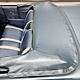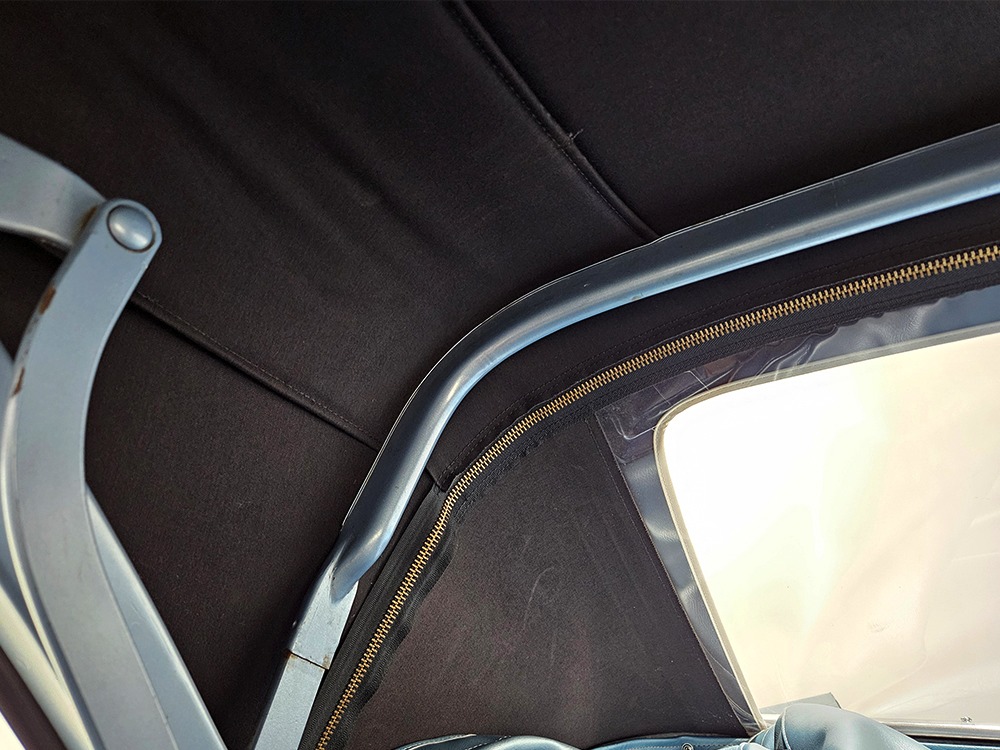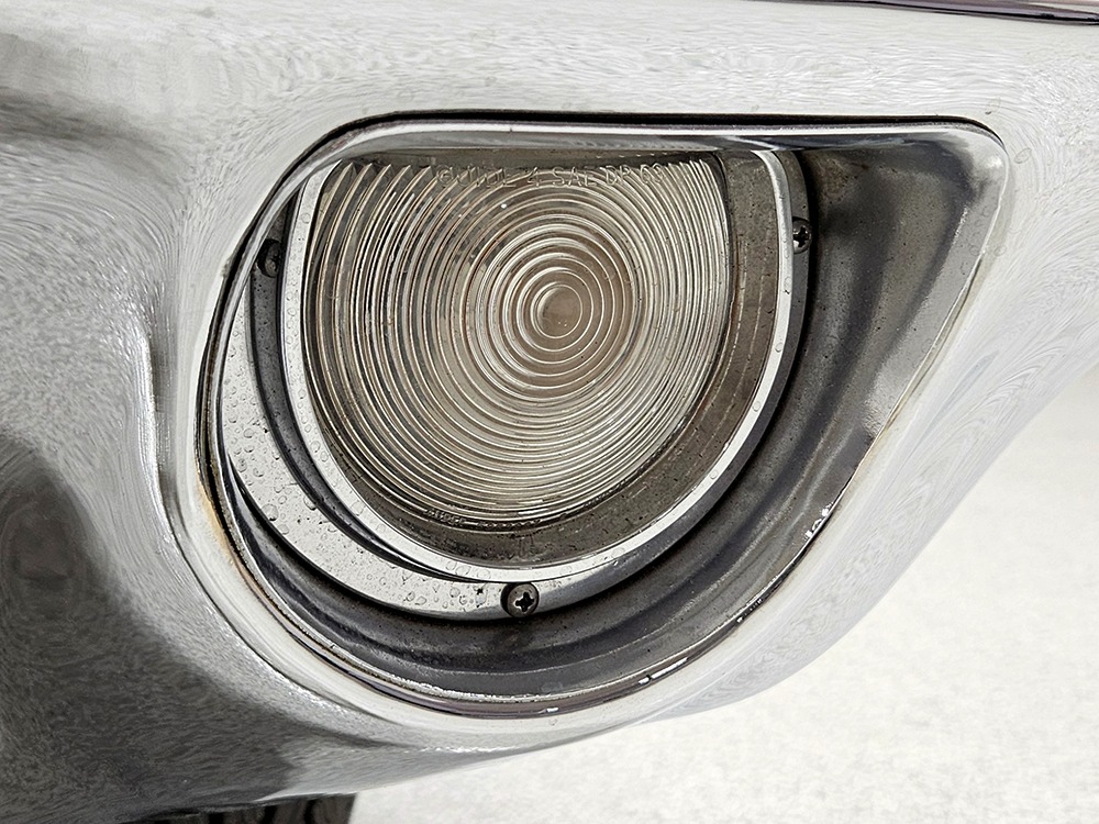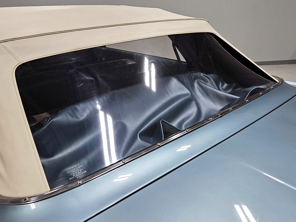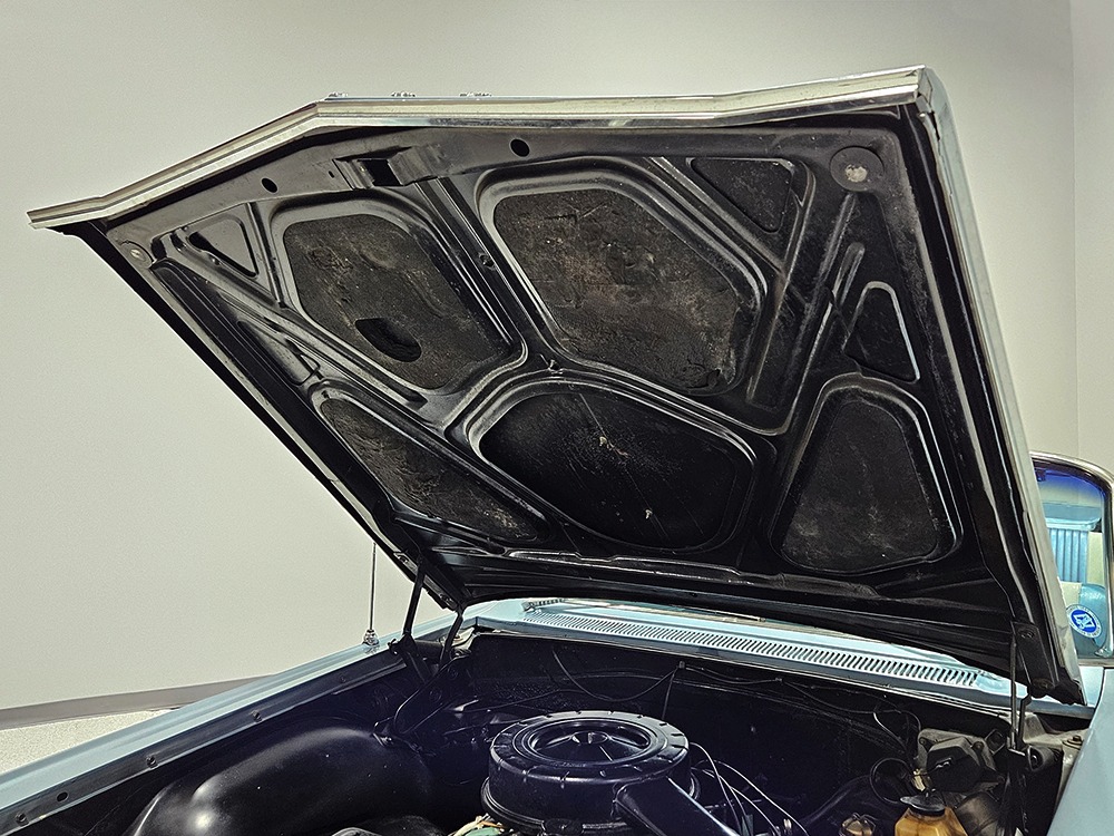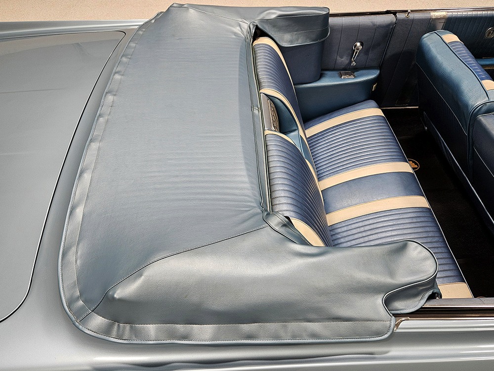 The two-tone blue and white interior is likewise very nicely preserved. The carpets are newer, but the rest appears to be factory-issue and holding up well. There’s a small split in the driver’s seat down near the seatback hinge, but that’s pretty much it for demerits. The door panels are beautifully detailed and shockingly, the steering wheel isn’t falling apart. Nice! The big, round gauges are crisp and easy to read, and to be honest, we were somewhat relieved to see that this car has crank windows and no A/C, two things that almost always break on big luxury liners like this, making it a no-hassles car that’s ready to enjoy. The white power convertible top is neatly fitted and powers itself up and down without any issues, and there’s a matching blue boot to give it a finished look. The massive trunk isn’t fully finished, but some of the original cardboard bulkheads are still in place and there’s a full-sized spare with cover still in place.