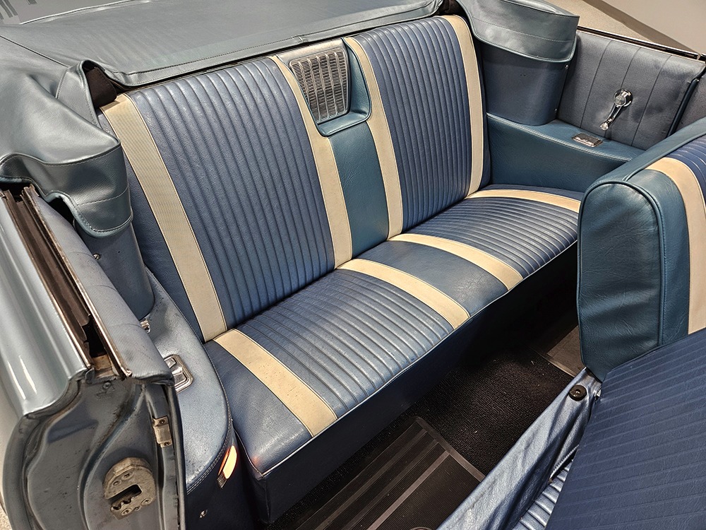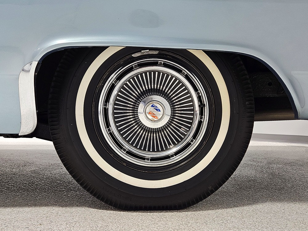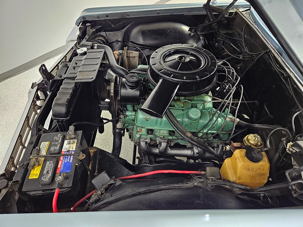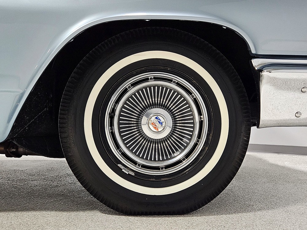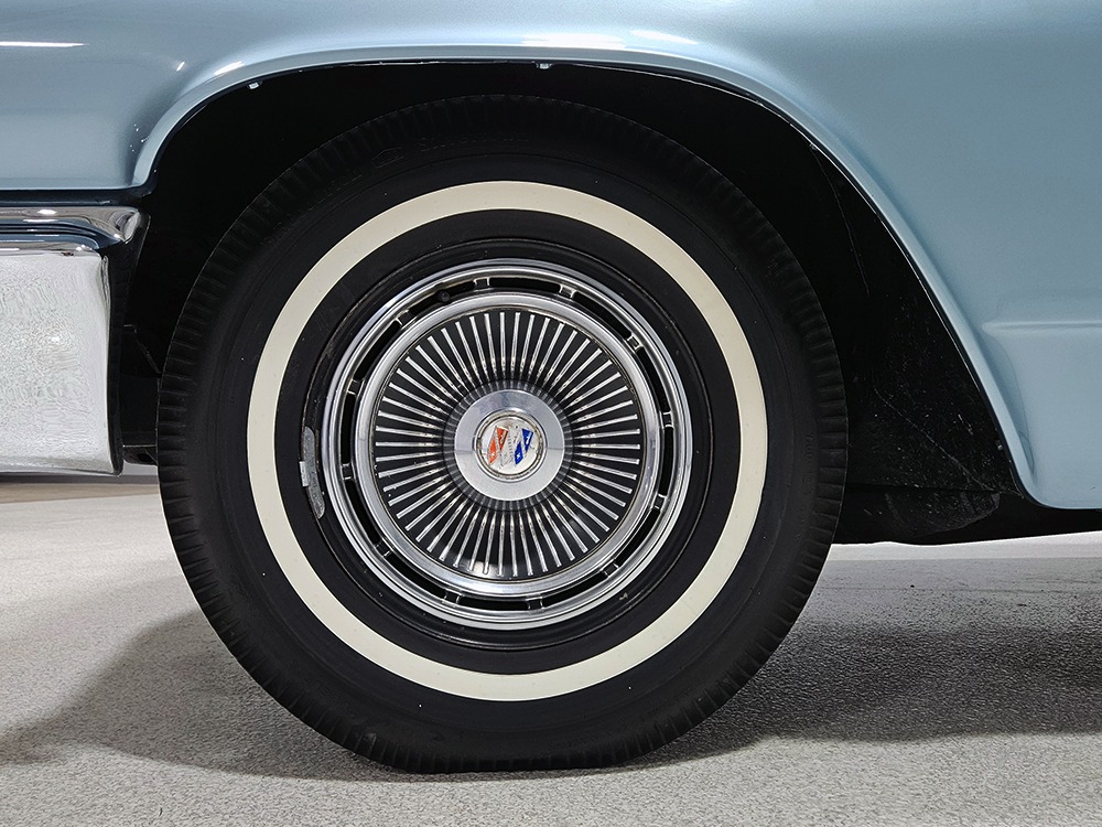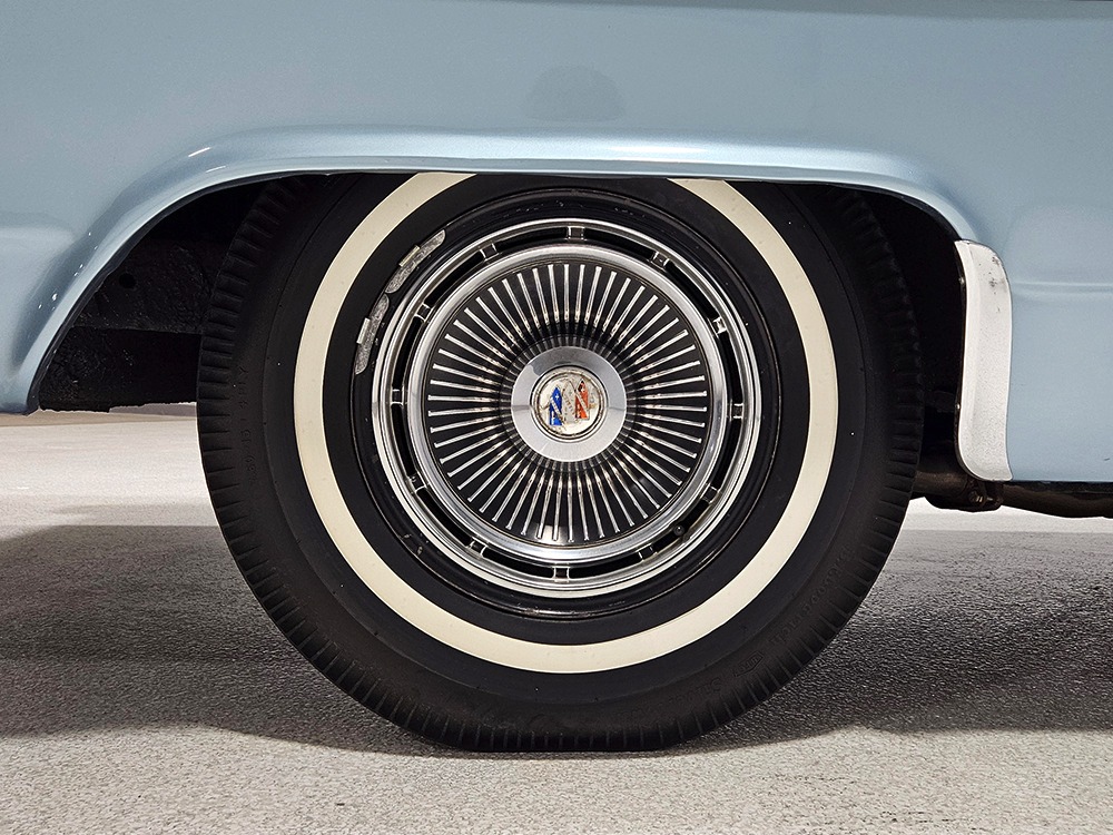 Buick’s 401 cubic inch “Nailhead” V8 is the epitome of smooth, effortless luxury power. It starts easily and idles with a muscular hum that’s quite appropriate. And combined with the DynaFlow automatic transmission, power delivery is seamless. The LeSabre came standard with a 2-barrel carburetor and single exhaust, making it reasonably efficient without sacrificing that big wave of torque that made the Nailhead famous. It’s neatly dressed in Buick Turquoise engine enamel with that big, black air cleaner on top, so it presents well when you open the hood. It also runs beautifully, pulling the big ragtop around with enthusiasm, living up to its reputation as a torque factory. Details like the alternator, belts and hoses, and other small parts are recent, so it is 100% ready to hit the road. The undercarriage is original and shows plenty of use, but the floors are solid and the trunk pan is in excellent shape. The exhaust system has a hushed sound that’s appropriate for a luxury cruiser like this and giant finned aluminum brake drums provide impressive stopping power. It sits on factory steel wheels and hubcaps with recent 7.60-15 BFGoodrich Silvertown whitewalls that look period perfect.