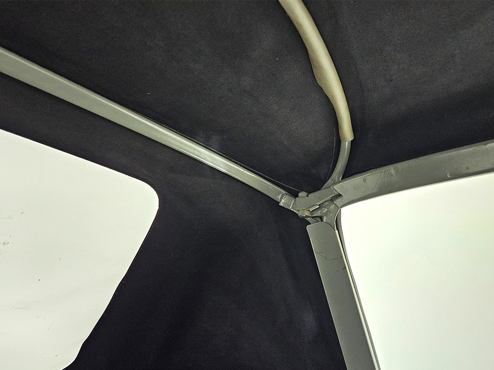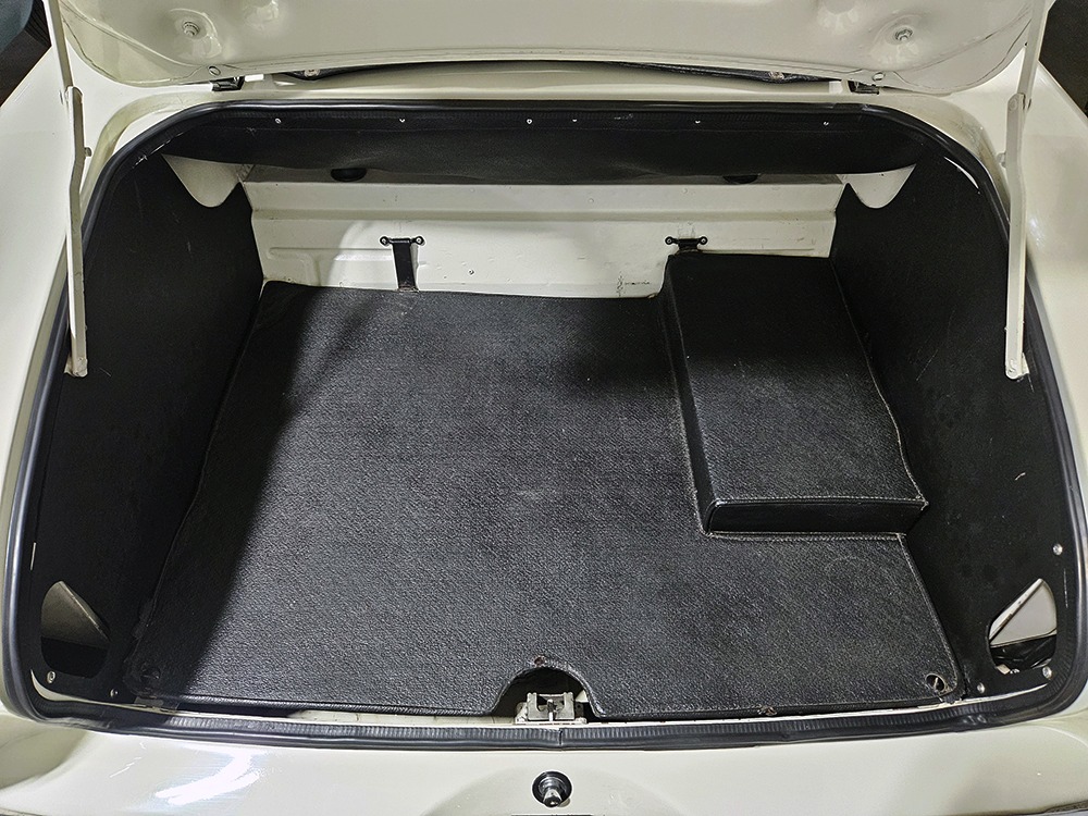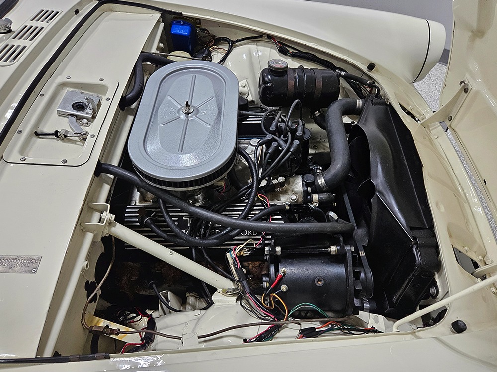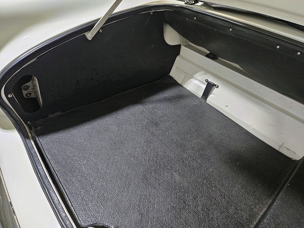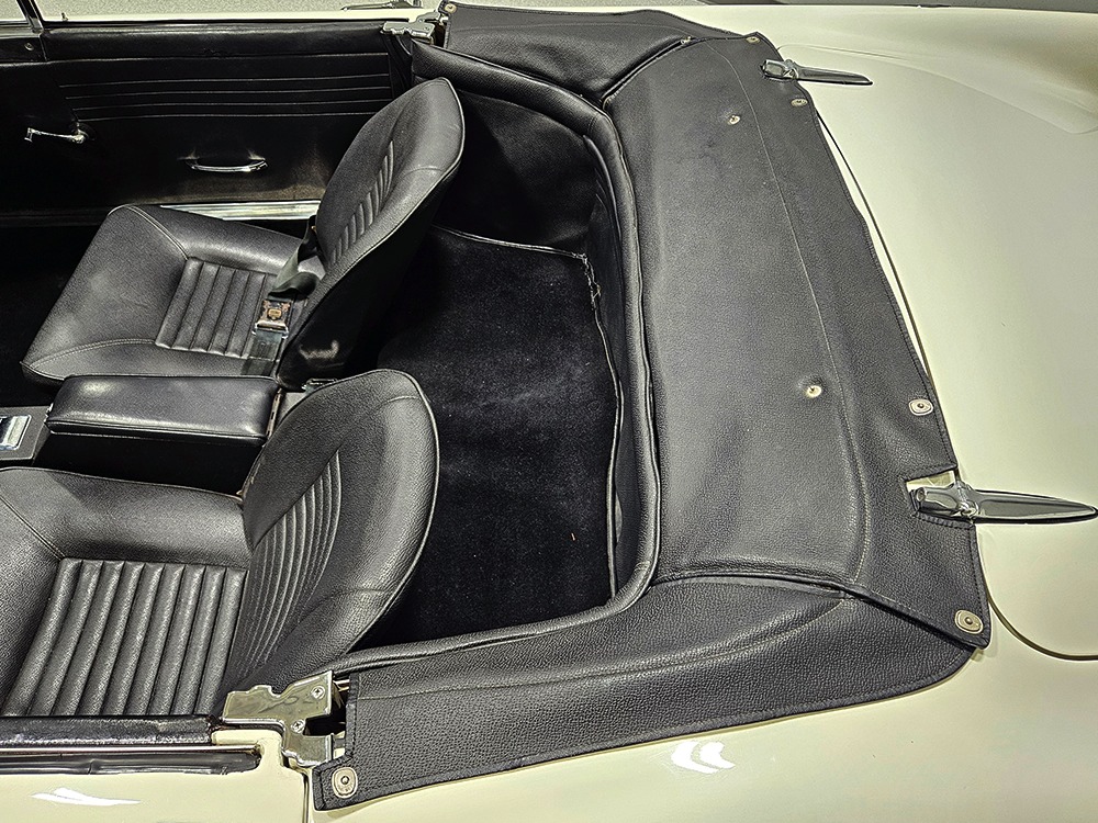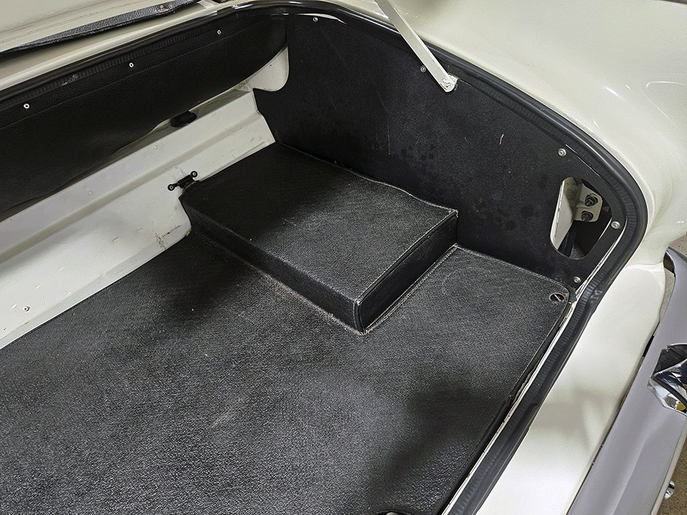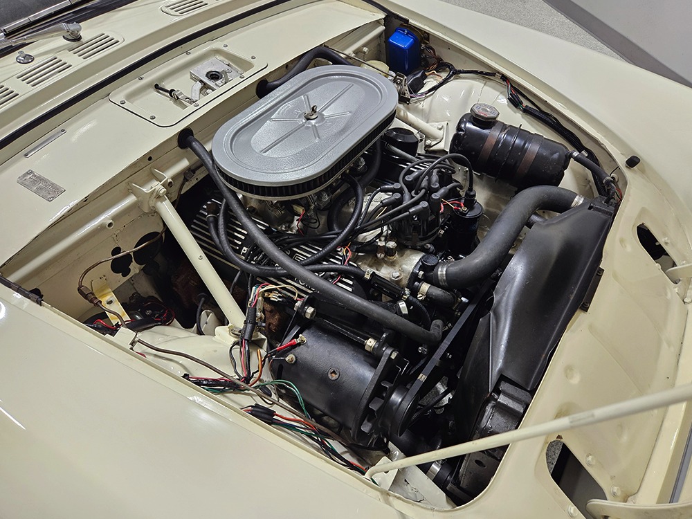 The interior is mostly original and holding up quite well, another hallmark of the mild California climate. The carpets have been replaced, the lovely wood steering wheel was rebuilt by Ken Corbin, and both the speedometer and tachometer have been recently rebuilt by West Valley Instruments. Slide into the bucket seat and you’ll find that it’s easy to get comfortable, although big shoes or boots are probably a mistake since the pedals are pretty tight. The wide array of instruments monitor the warmed-over small block Ford under the hood and all of the various switches, dials, and lights work properly. There’s a Hurst cue ball shifter on top of a short-shift linkage for the HEH-E Toploader close-ratio 4-speed, making missed shifts a thing of the past, even in the heat of combat. A new Robins top was installed in 2011, along with a correct boot, although we’d argue that the top is for emergency use only—Tigers always look best top down. And there’s a surprisingly large trunk that has a correct mat and side panels, plus a correct spare and jack assembly stowed underneath, along with the battery.