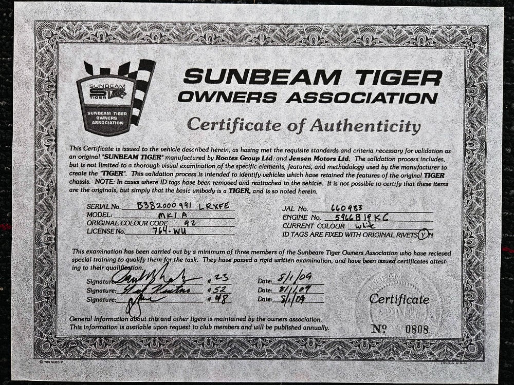 Documentation includes the STOA Certificate of Authenticity (this is a real Tiger), written history, photos, receipts, and more. Spare parts include the original 260 engine block (although it has already been over-bored so it may not be usable without being sleeved), original LAT headers, brake servo, windshield washer mount, fuel pump, and other small parts, all available at the new owner’s discretion.
