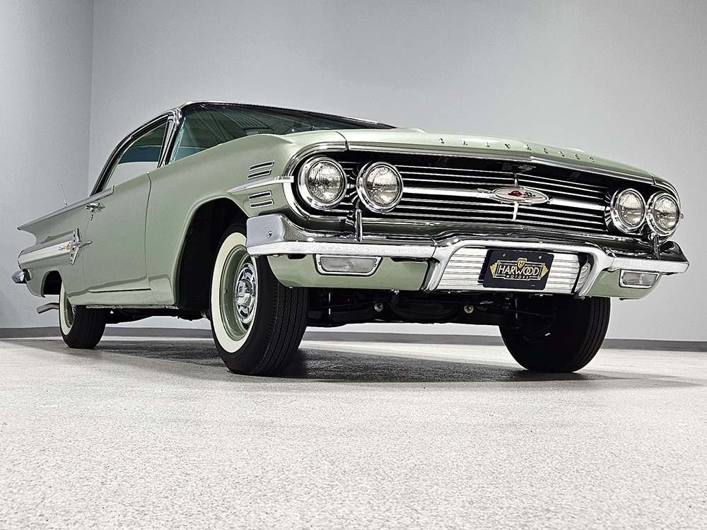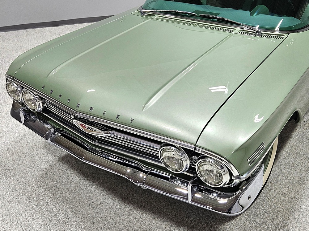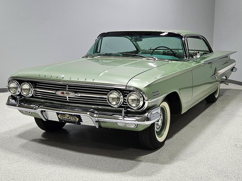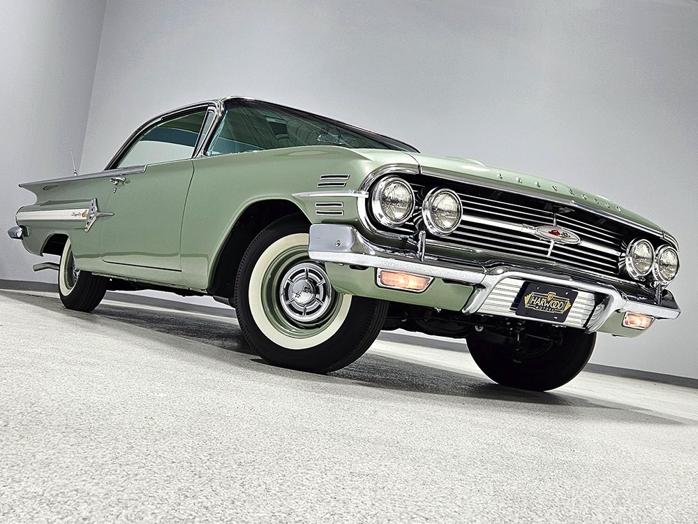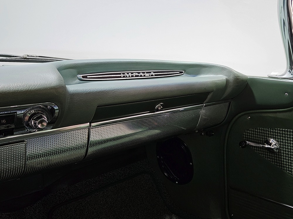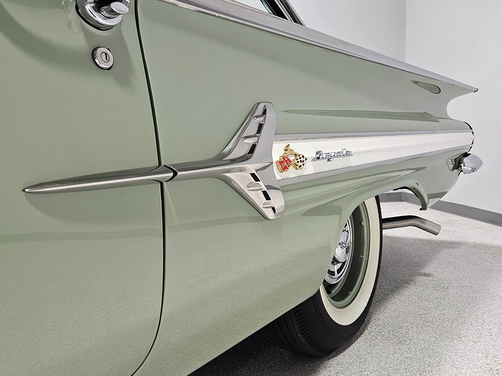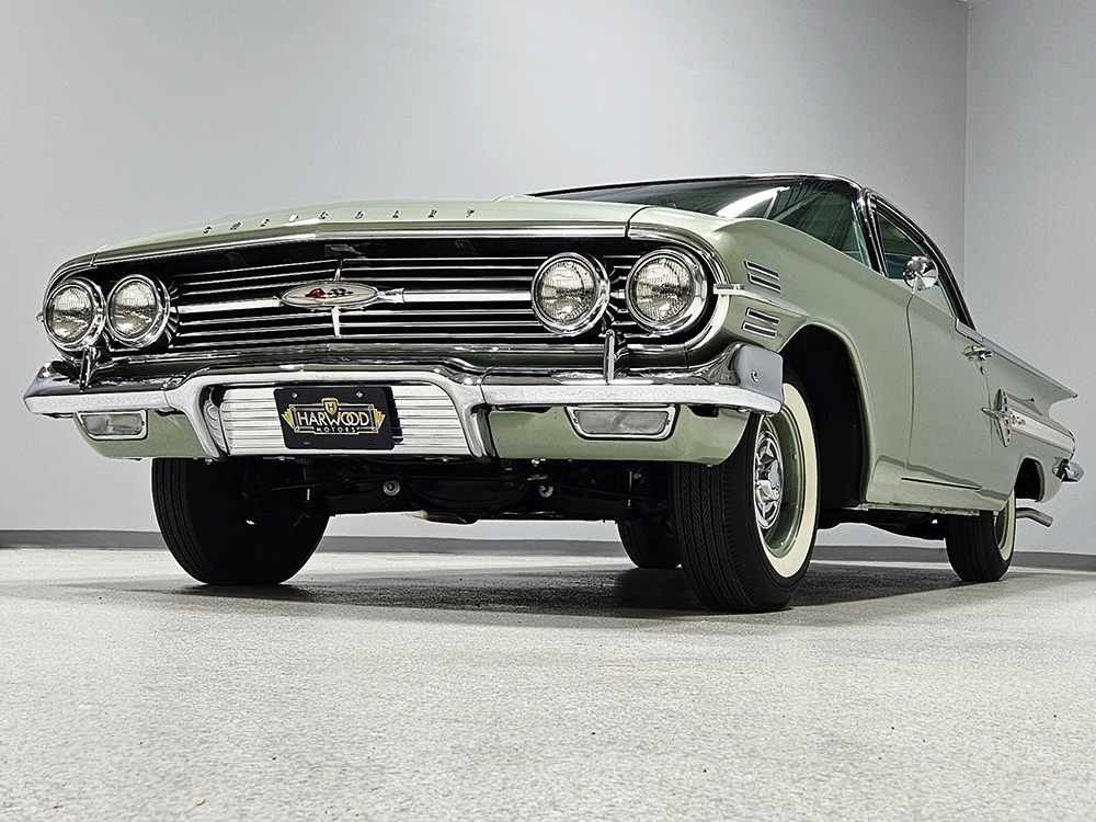 This sublime Cascade Green and Ermine White 1960 Chevrolet Impala sport coupe was restored by the technical advisor to the Vintage Chevrolet Club of America. That means he’s an expert on these cars, and it shows everywhere you look. The car has won every possible award such a car can win, including AACA national first prizes and VCCA first place trophies. Workmanship is outstanding, and yes, it’s a real high-performance 348/4-speed car, making it so much sweeter. And it’s not red! The handsome 1960 Chevrolet bodywork works especially well on the sport coupe, giving it a long, low look that suits its high-performance mission. Fit and finish are exemplary, with doors that close with a final-sounding THUNK and exacting gaps throughout that are probably better than new. Checking the trim tag, you’ll quickly see that Cascade Green is this car’s original color and it gives this car a subtle attitude that might even make it a bit of a sleeper—nobody will expect that sledgehammer powerplant under the hood. The slash of Ermine White on the quarters accentuates that awesome jet-inspired trim, and all the stainless has been polished to a high shine worthy of the show field. All the chrome was restored to show standards and even little details like the T3 headlight bulbs ensure that this car is still competitive at a very high level. This is easily the best we’ve ever featured.