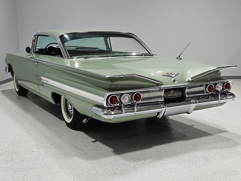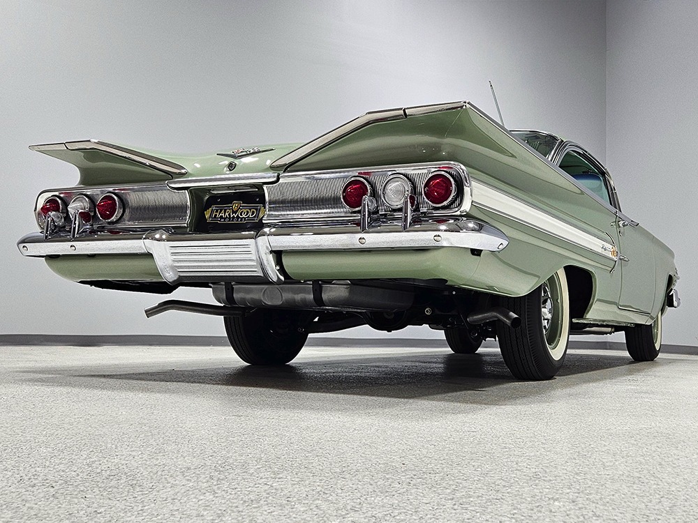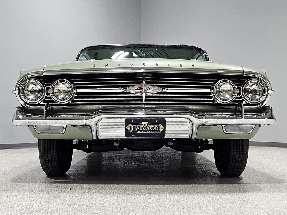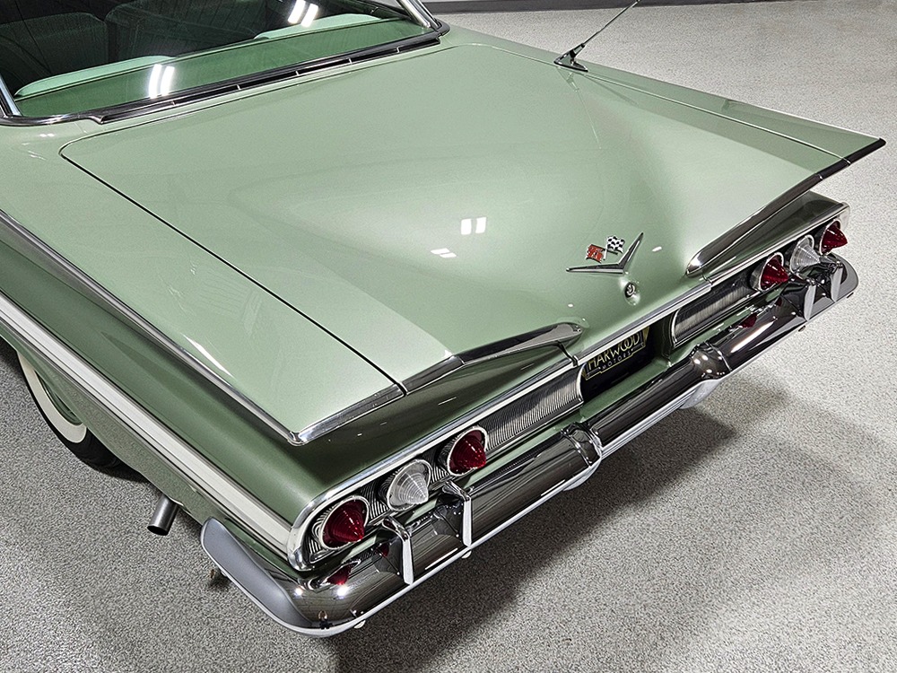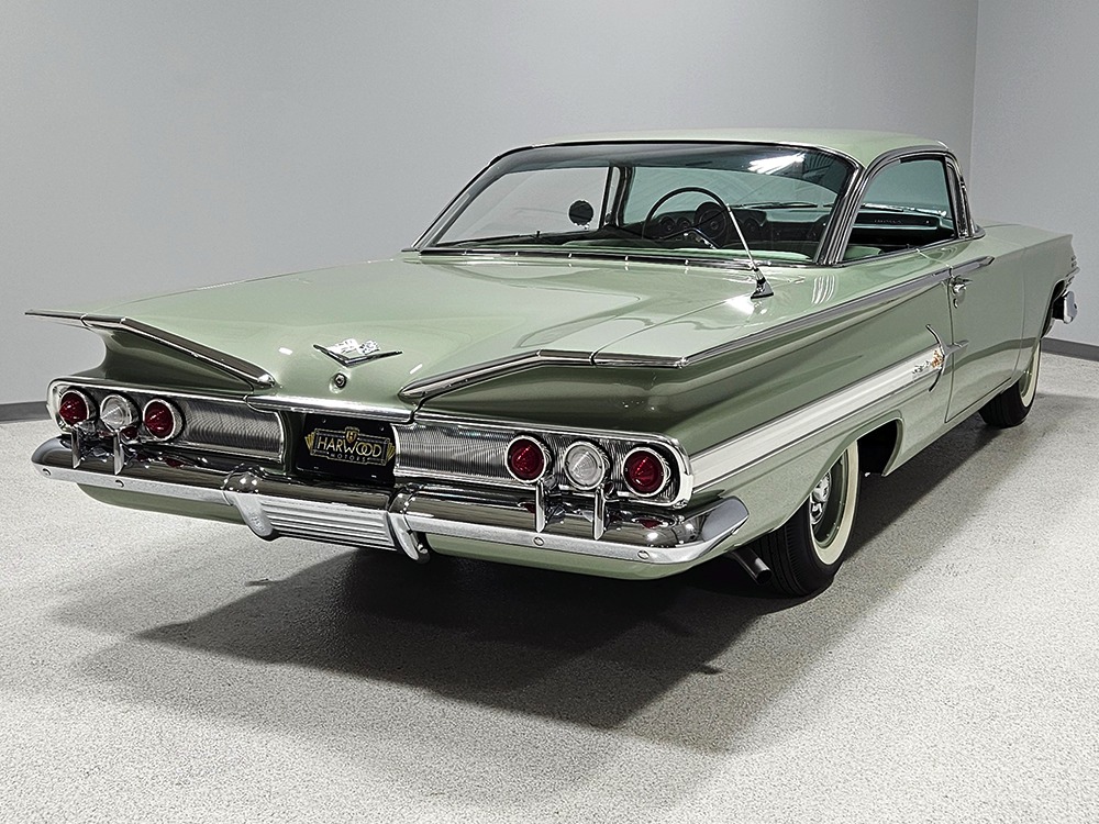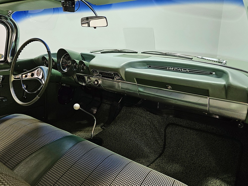 This sublime Cascade Green and Ermine White 1960 Chevrolet Impala sport coupe was restored by the technical advisor to the Vintage Chevrolet Club of America. That means he’s an expert on these cars, and it shows everywhere you look. The car has won every possible award such a car can win, including AACA national first prizes and VCCA first place trophies. Workmanship is outstanding, and yes, it’s a real high-performance 348/4-speed car, making it so much sweeter. And it’s not red! The handsome 1960 Chevrolet bodywork works especially well on the sport coupe, giving it a long, low look that suits its high-performance mission. Fit and finish are exemplary, with doors that close with a final-sounding THUNK and exacting gaps throughout that are probably better than new. Checking the trim tag, you’ll quickly see that Cascade Green is this car’s original color and it gives this car a subtle attitude that might even make it a bit of a sleeper—nobody will expect that sledgehammer powerplant under the hood. The slash of Ermine White on the quarters accentuates that awesome jet-inspired trim, and all the stainless has been polished to a high shine worthy of the show field. All the chrome was restored to show standards and even little details like the T3 headlight bulbs ensure that this car is still competitive at a very high level. This is easily the best we’ve ever featured.
