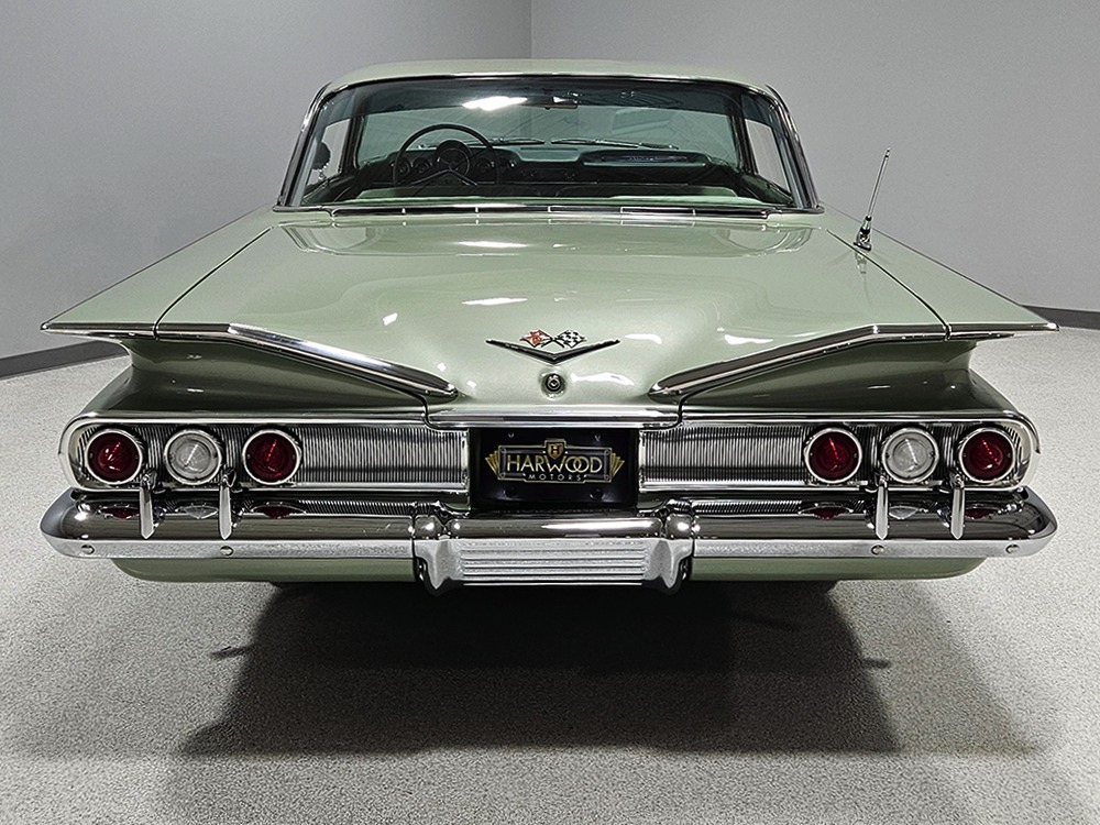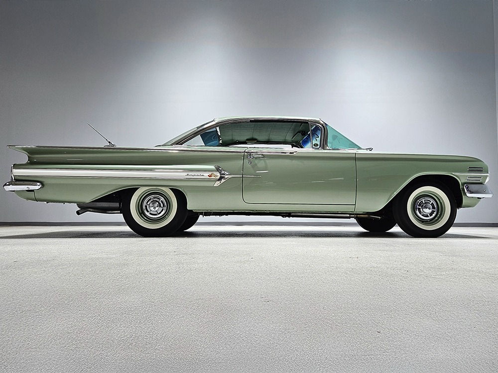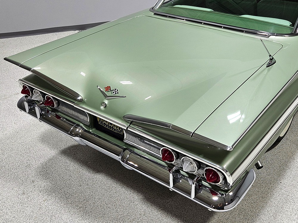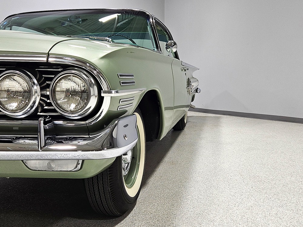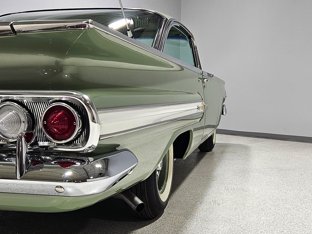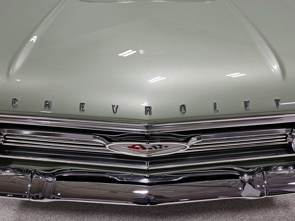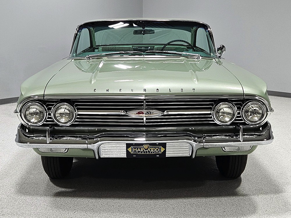 This sublime Cascade Green and Ermine White 1960 Chevrolet Impala sport coupe was restored by the technical advisor to the Vintage Chevrolet Club of America. That means he’s an expert on these cars, and it shows everywhere you look. The car has won every possible award such a car can win, including AACA national first prizes and VCCA first place trophies. Workmanship is outstanding, and yes, it’s a real high-performance 348/4-speed car, making it so much sweeter. And it’s not red! The handsome 1960 Chevrolet bodywork works especially well on the sport coupe, giving it a long, low look that suits its high-performance mission. Fit and finish are exemplary, with doors that close with a final-sounding THUNK and exacting gaps throughout that are probably better than new. Checking the trim tag, you’ll quickly see that Cascade Green is this car’s original color and it gives this car a subtle attitude that might even make it a bit of a sleeper—nobody will expect that sledgehammer powerplant under the hood. The slash of Ermine White on the quarters accentuates that awesome jet-inspired trim, and all the stainless has been polished to a high shine worthy of the show field. All the chrome was restored to show standards and even little details like the T3 headlight bulbs ensure that this car is still competitive at a very high level. This is easily the best we’ve ever featured.