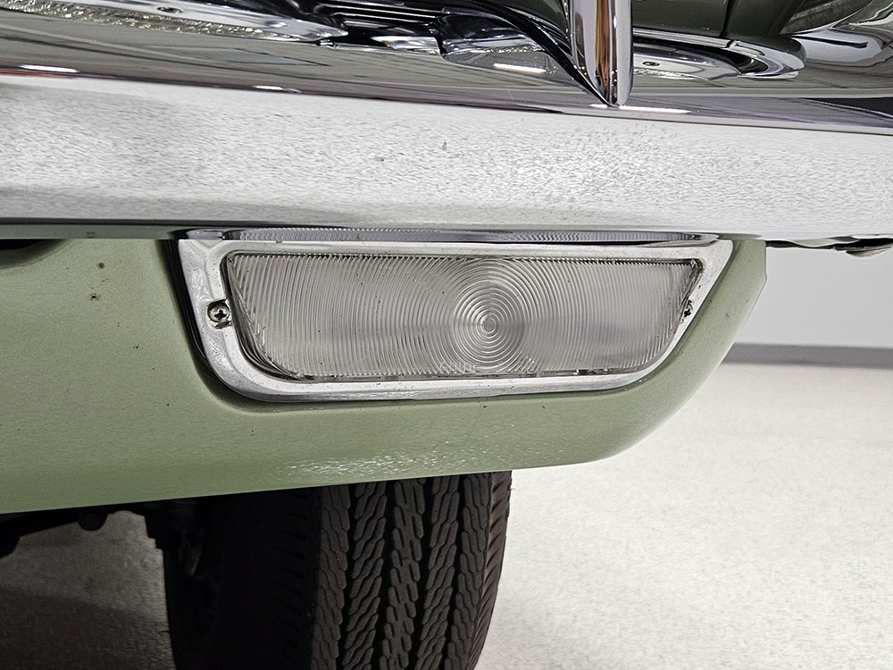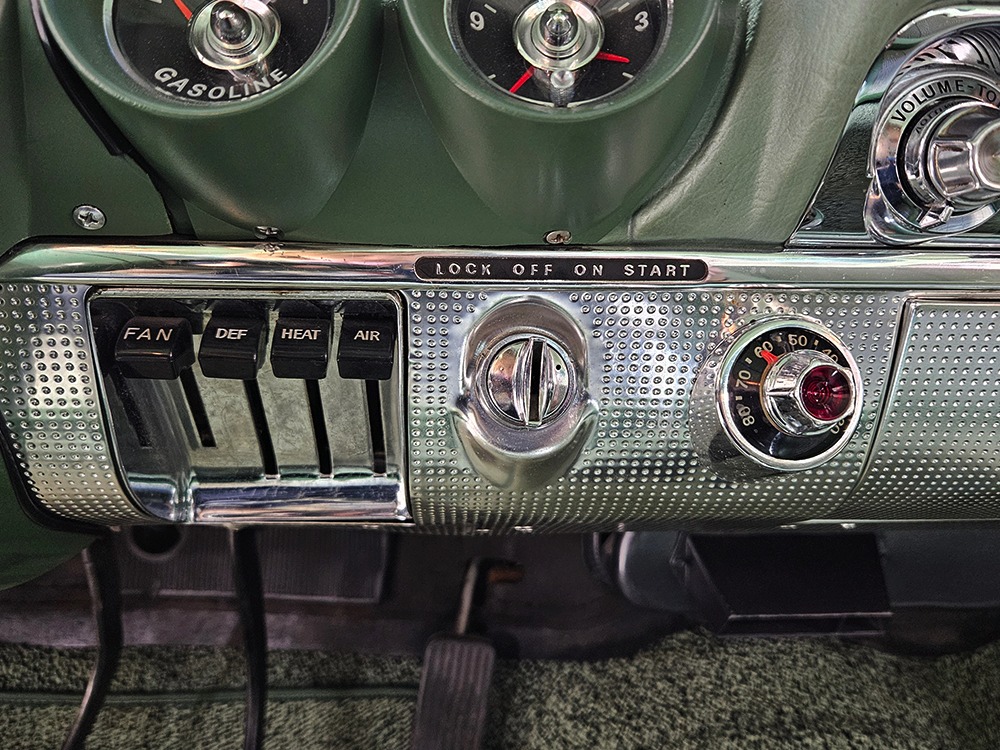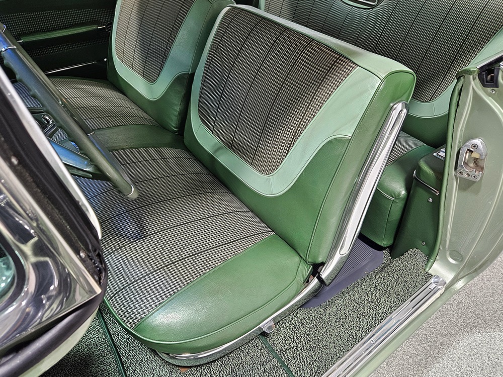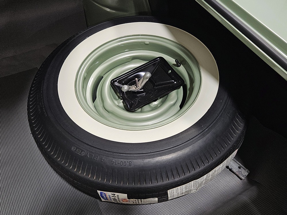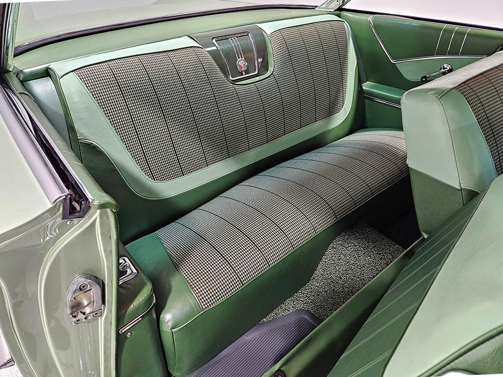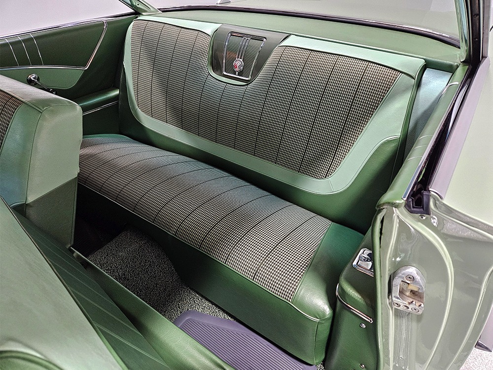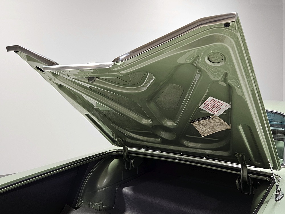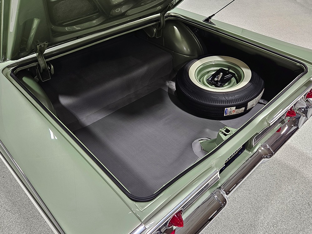 The two-tone green and white interior is likewise correct for this car and has been expertly reproduced. Everything you can see or touch is new and there are virtually zero signs of use beyond some wear on the matching driver’s floor mat. The wide bench seat is all-day comfortable and it’s always awesome to see a 4-speed shifter sticking up in a full-sized cruiser like this. The two-tone steering wheel has been restored, all the gauges are bright and fully operational, and it features accessories like a speed minder, 4-way hazard switch, and a compass above the rear-view mirror, all factory-approved. There’s also an optional AM radio in the center of the dash, which, of course, works like it should. The headliner is taut and well-tailored, and the chrome trim pieces are just as nice as the exterior parts. The trunk is correctly finished with a fitted mat, correct jacking decals, and a full-sized spare with jack assembly.