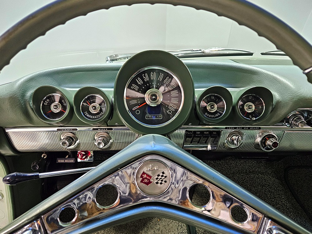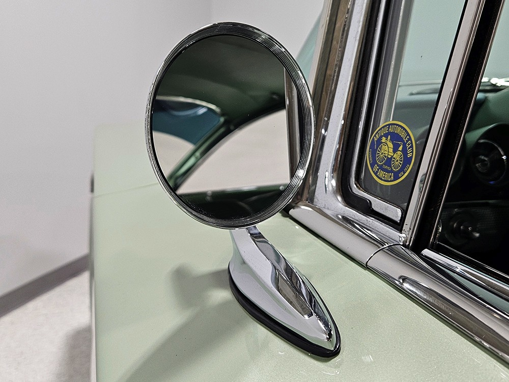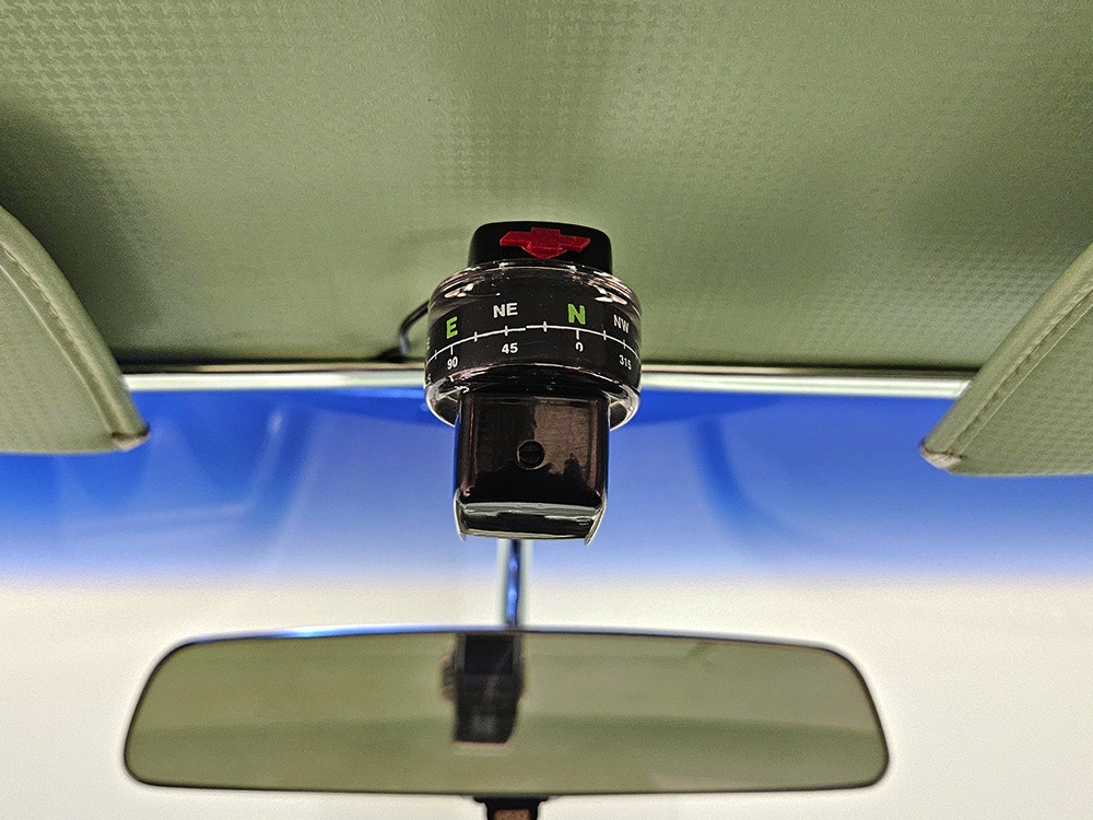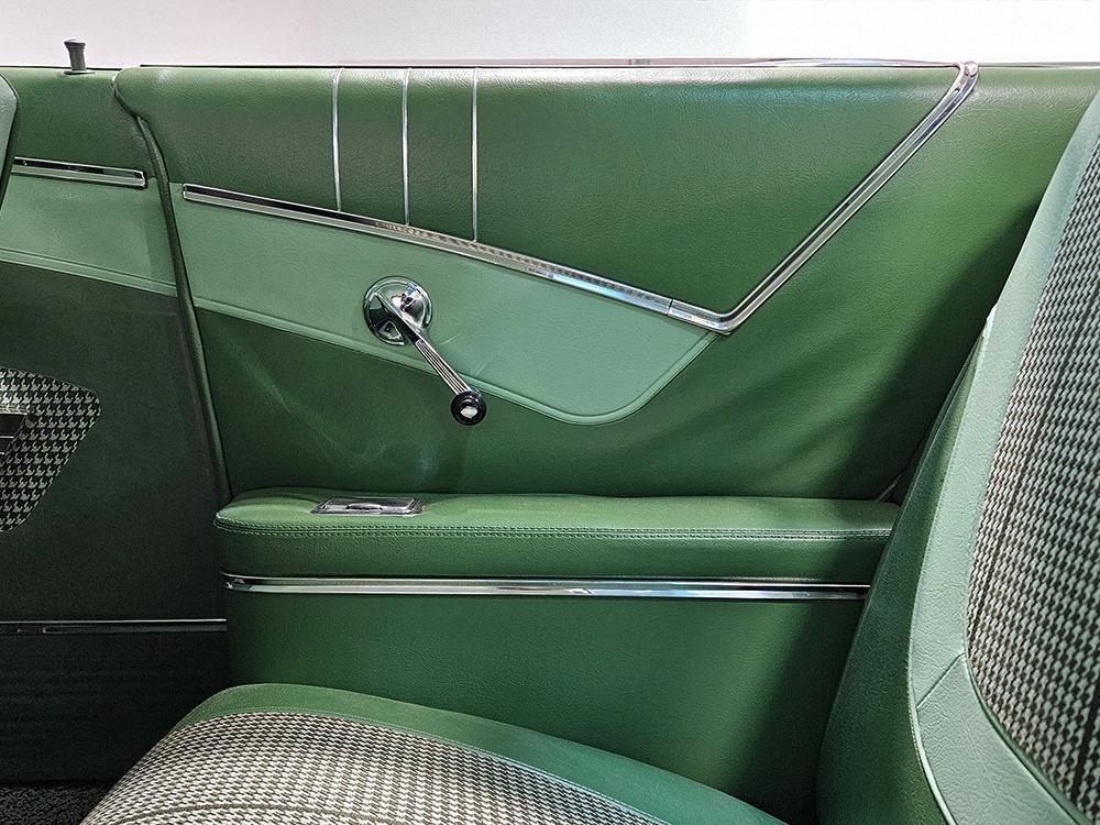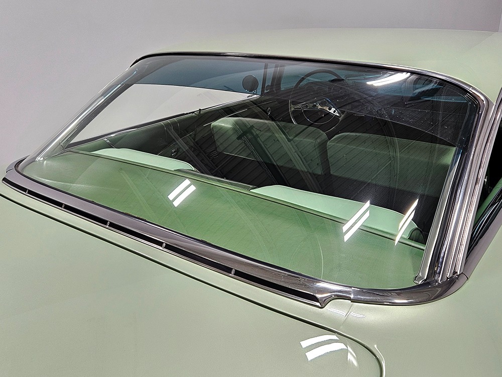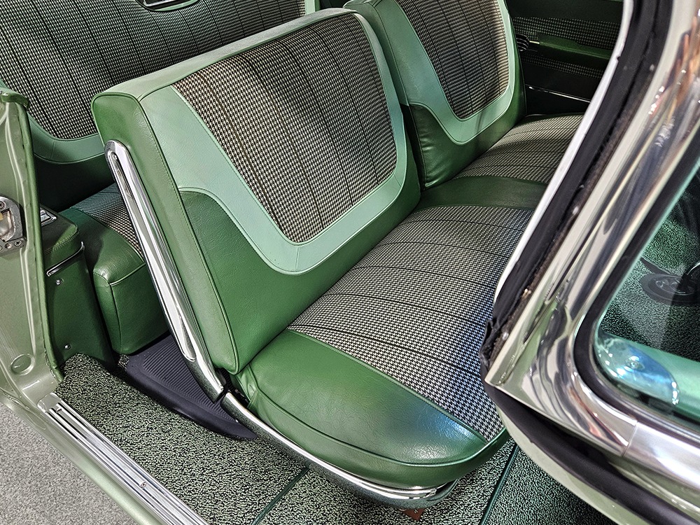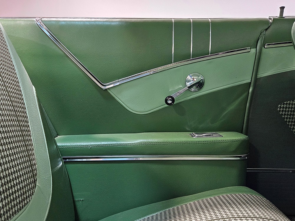The two-tone green and white interior is likewise correct for this car and has been expertly reproduced. Everything you can see or touch is new and there are virtually zero signs of use beyond some wear on the matching driver’s floor mat. The wide bench seat is all-day comfortable and it’s always awesome to see a 4-speed shifter sticking up in a full-sized cruiser like this. The two-tone steering wheel has been restored, all the gauges are bright and fully operational, and it features accessories like a speed minder, 4-way hazard switch, and a compass above the rear-view mirror, all factory-approved. There’s also an optional AM radio in the center of the dash, which, of course, works like it should. The headliner is taut and well-tailored, and the chrome trim pieces are just as nice as the exterior parts. The trunk is correctly finished with a fitted mat, correct jacking decals, and a full-sized spare with jack assembly.