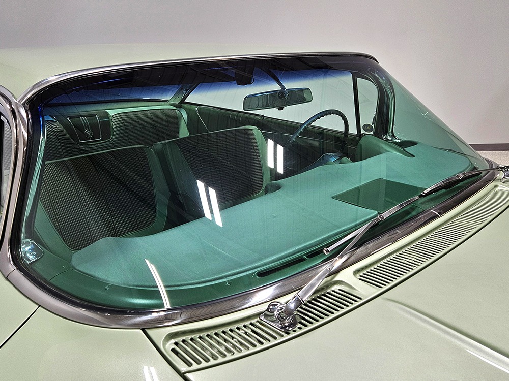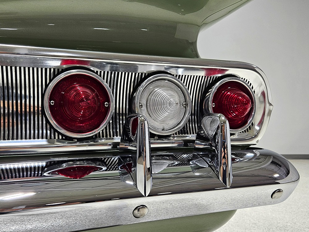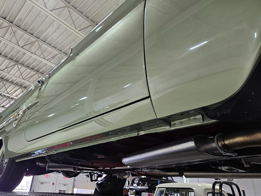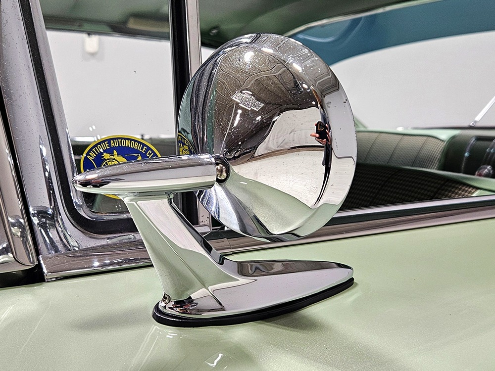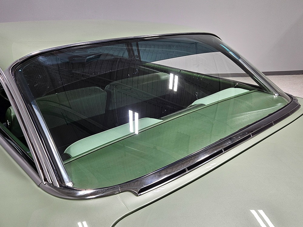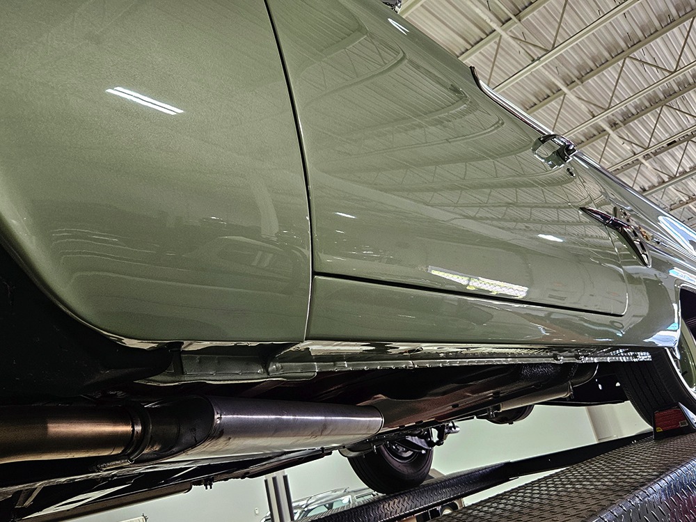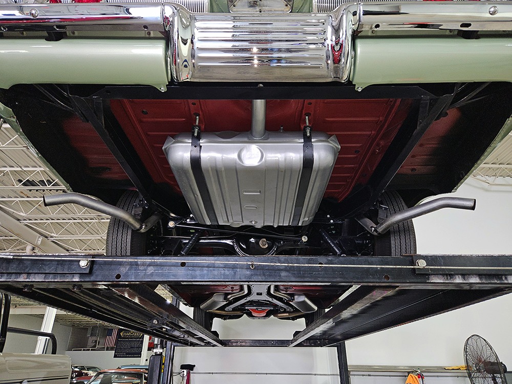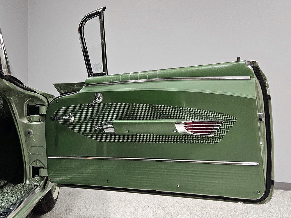 The two-tone green and white interior is likewise correct for this car and has been expertly reproduced. Everything you can see or touch is new and there are virtually zero signs of use beyond some wear on the matching driver’s floor mat. The wide bench seat is all-day comfortable and it’s always awesome to see a 4-speed shifter sticking up in a full-sized cruiser like this. The two-tone steering wheel has been restored, all the gauges are bright and fully operational, and it features accessories like a speed minder, 4-way hazard switch, and a compass above the rear-view mirror, all factory-approved. There’s also an optional AM radio in the center of the dash, which, of course, works like it should. The headliner is taut and well-tailored, and the chrome trim pieces are just as nice as the exterior parts. The trunk is correctly finished with a fitted mat, correct jacking decals, and a full-sized spare with jack assembly.