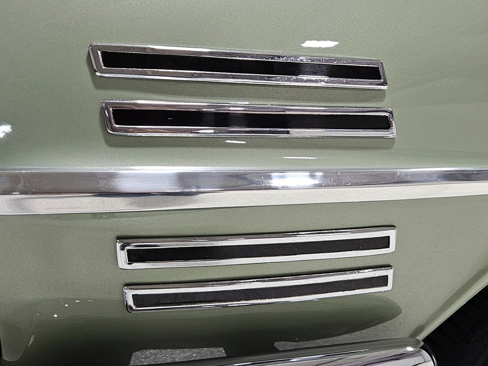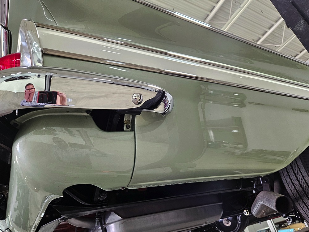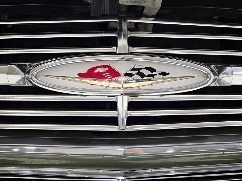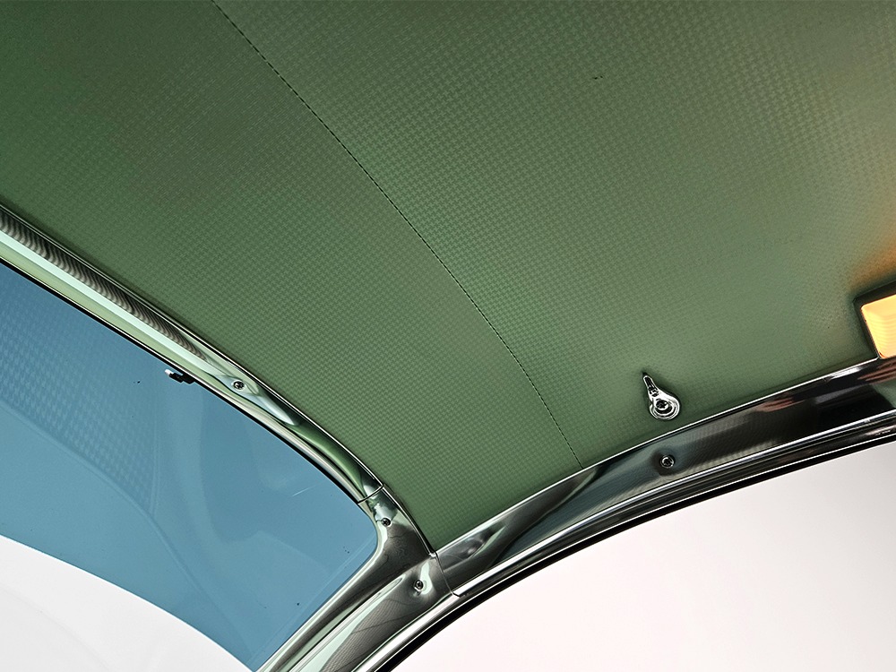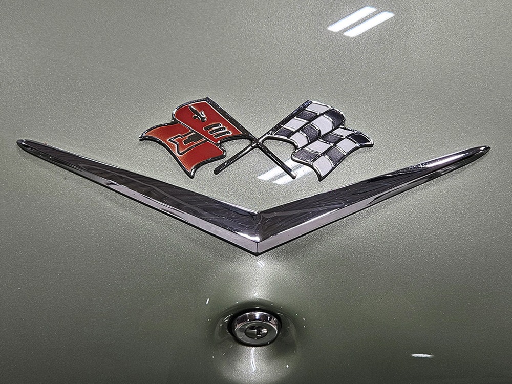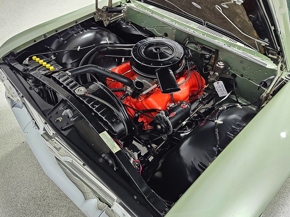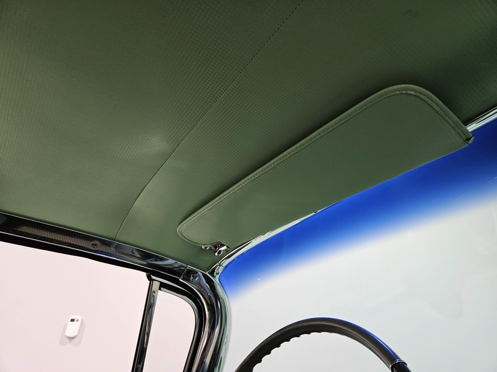 The two-tone green and white interior is likewise correct for this car and has been expertly reproduced. Everything you can see or touch is new and there are virtually zero signs of use beyond some wear on the matching driver’s floor mat. The wide bench seat is all-day comfortable and it’s always awesome to see a 4-speed shifter sticking up in a full-sized cruiser like this. The two-tone steering wheel has been restored, all the gauges are bright and fully operational, and it features accessories like a speed minder, 4-way hazard switch, and a compass above the rear-view mirror, all factory-approved. There’s also an optional AM radio in the center of the dash, which, of course, works like it should. The headliner is taut and well-tailored, and the chrome trim pieces are just as nice as the exterior parts. The trunk is correctly finished with a fitted mat, correct jacking decals, and a full-sized spare with jack assembly.