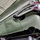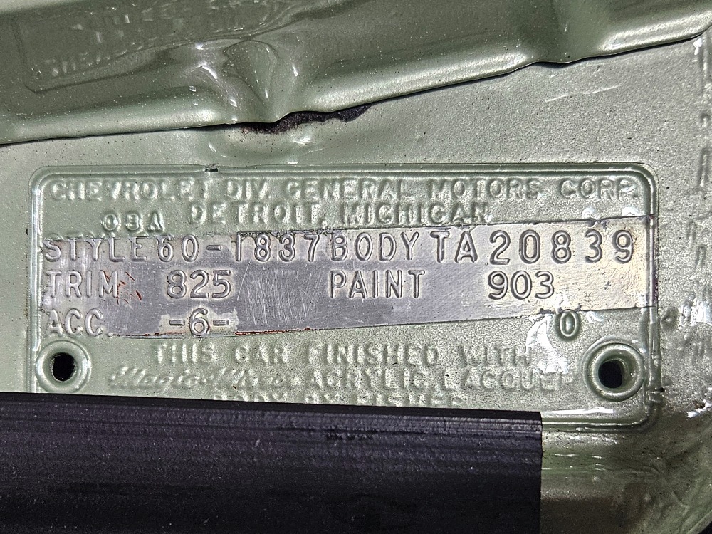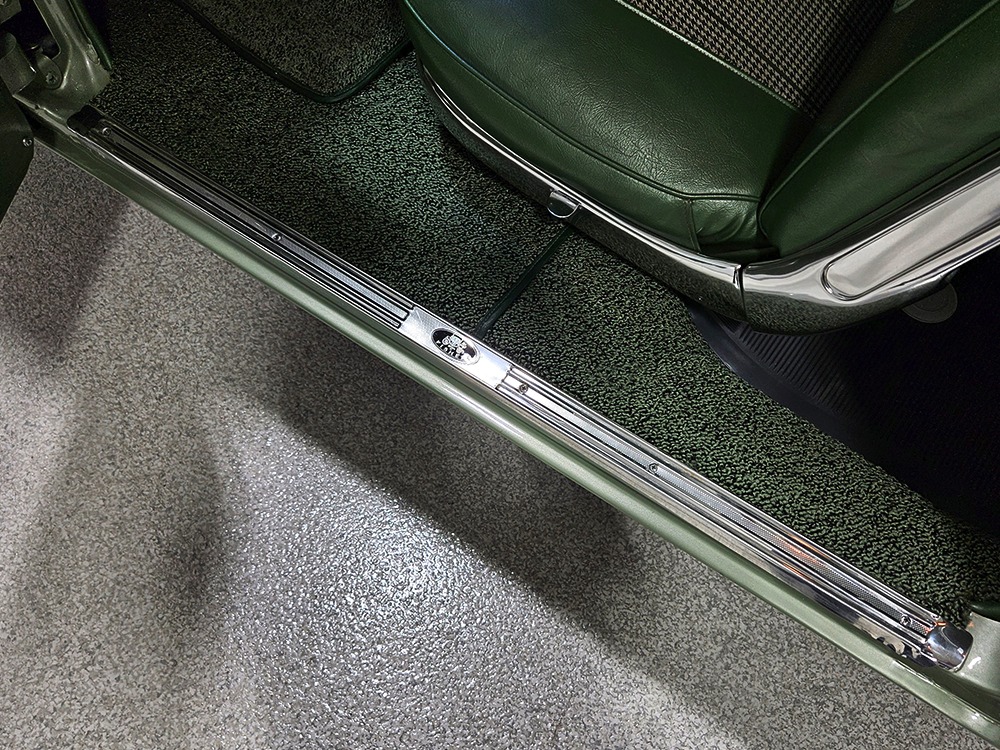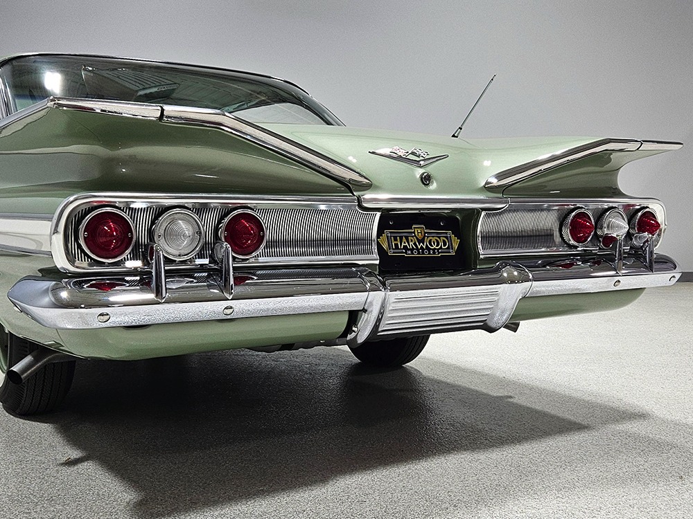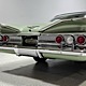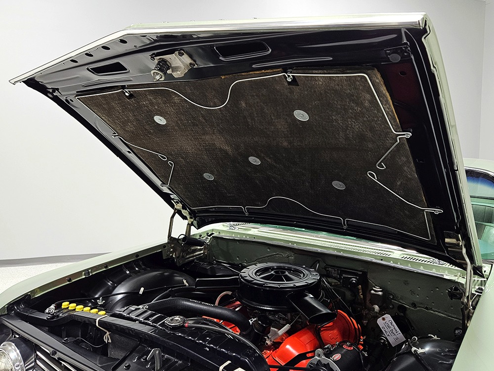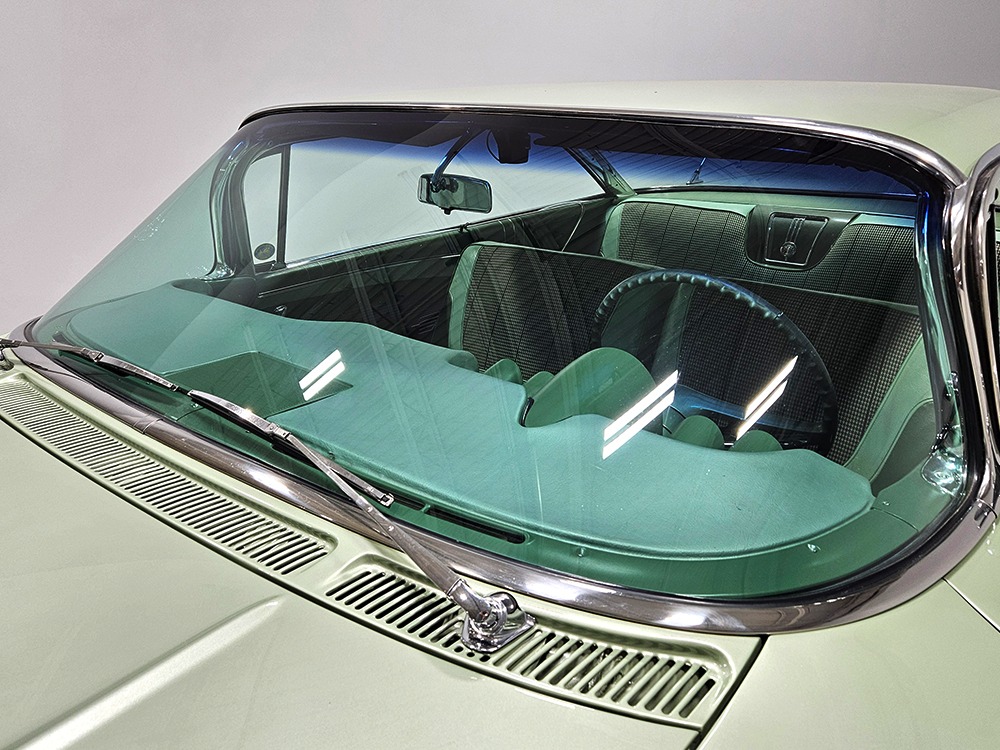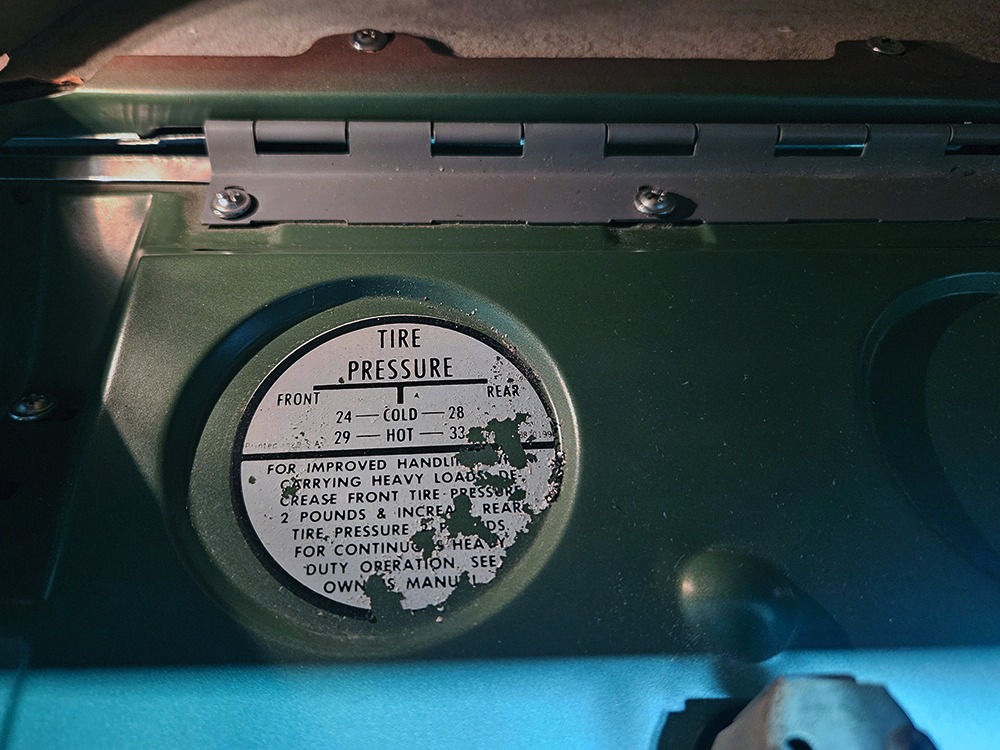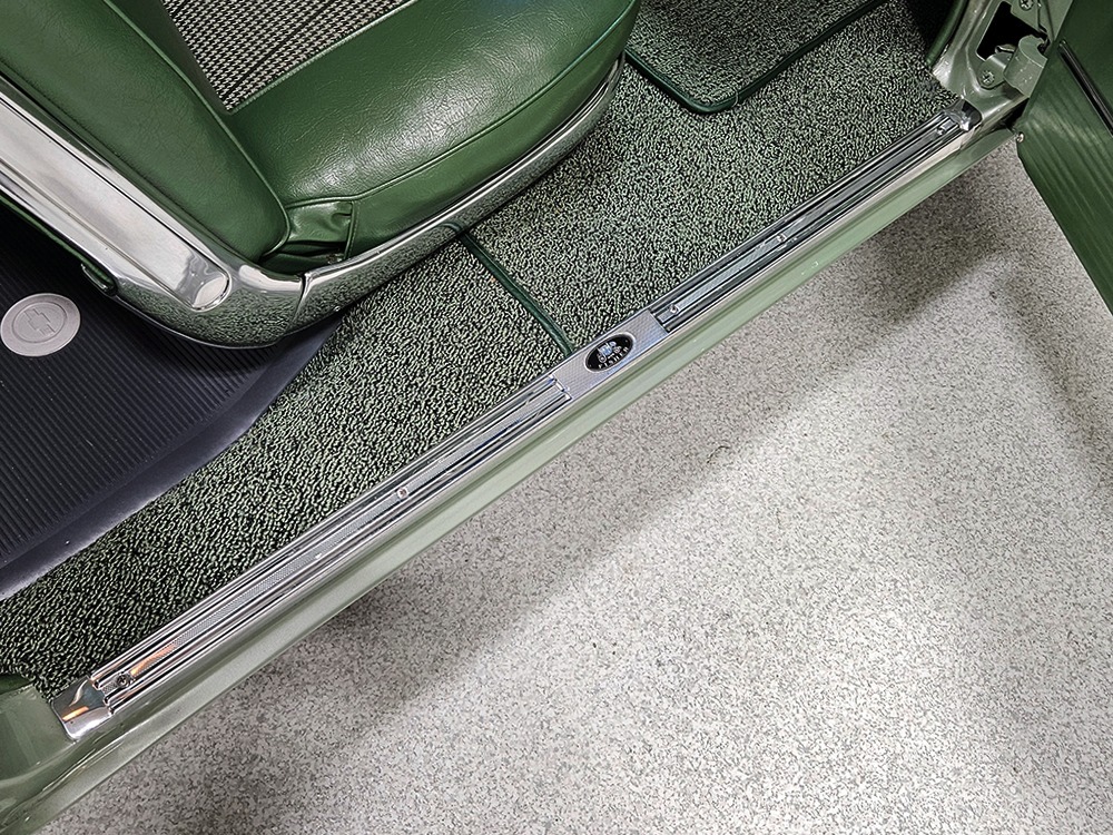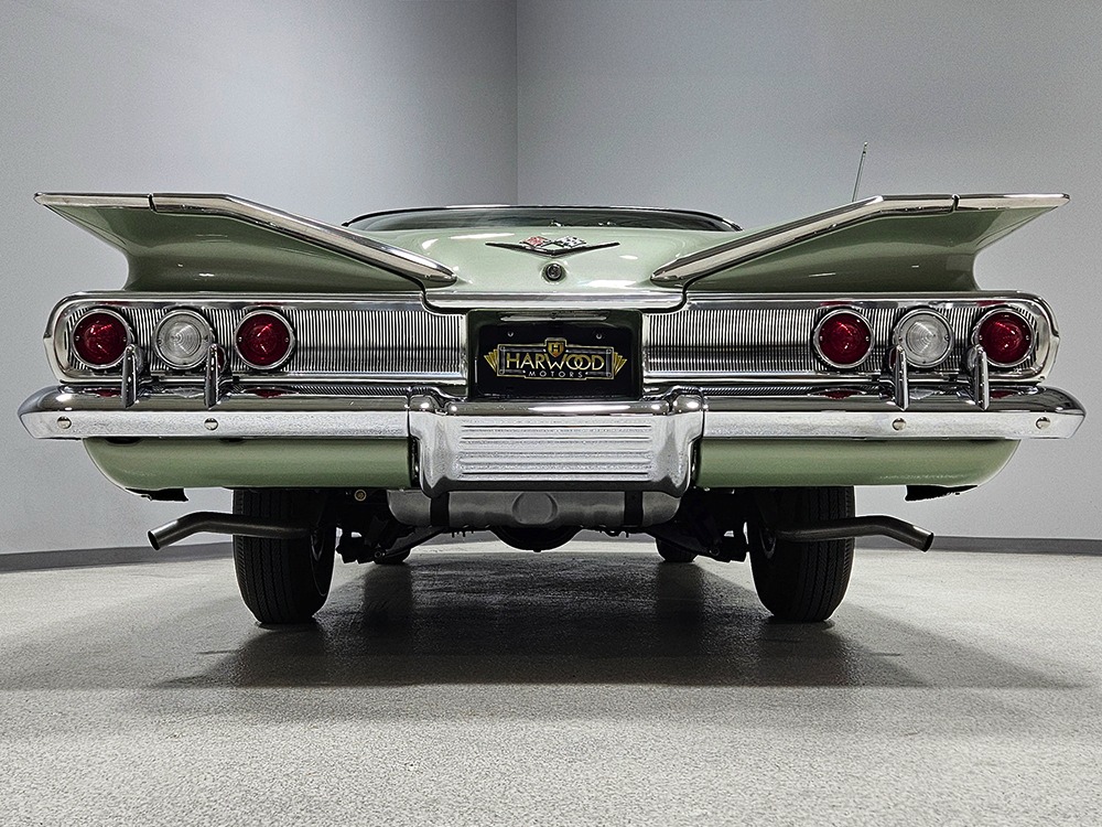 The two-tone green and white interior is likewise correct for this car and has been expertly reproduced. Everything you can see or touch is new and there are virtually zero signs of use beyond some wear on the matching driver’s floor mat. The wide bench seat is all-day comfortable and it’s always awesome to see a 4-speed shifter sticking up in a full-sized cruiser like this. The two-tone steering wheel has been restored, all the gauges are bright and fully operational, and it features accessories like a speed minder, 4-way hazard switch, and a compass above the rear-view mirror, all factory-approved. There’s also an optional AM radio in the center of the dash, which, of course, works like it should. The headliner is taut and well-tailored, and the chrome trim pieces are just as nice as the exterior parts. The trunk is correctly finished with a fitted mat, correct jacking decals, and a full-sized spare with jack assembly.