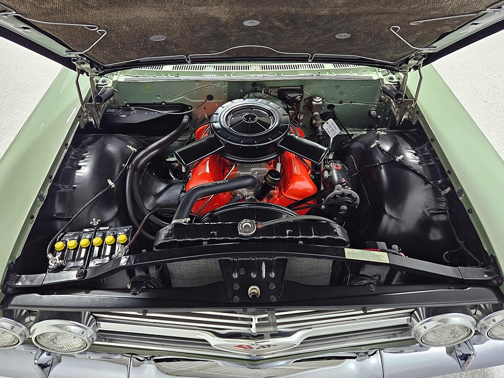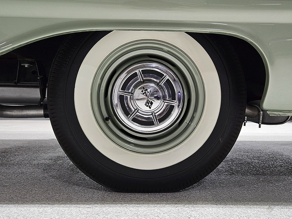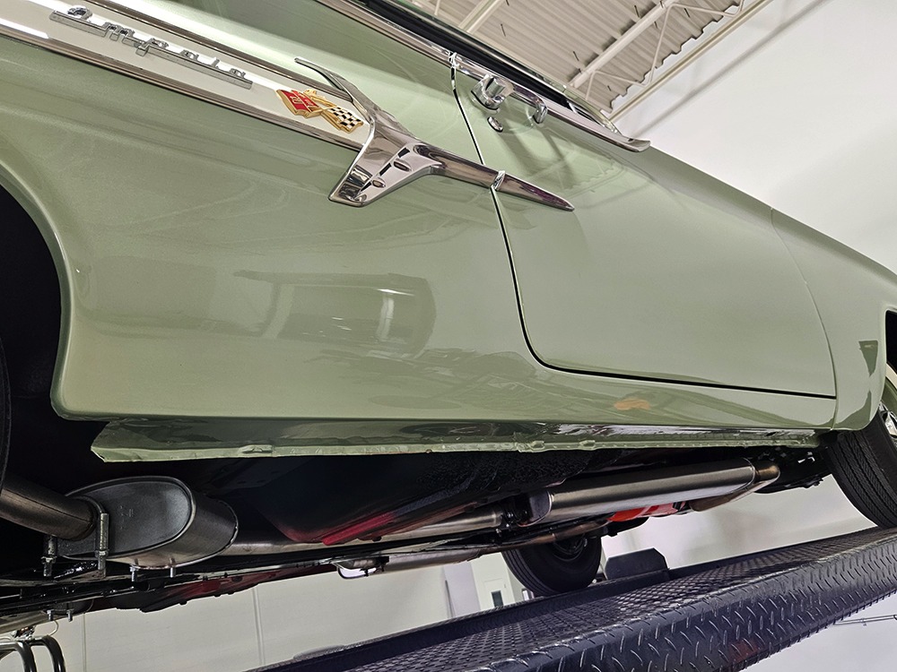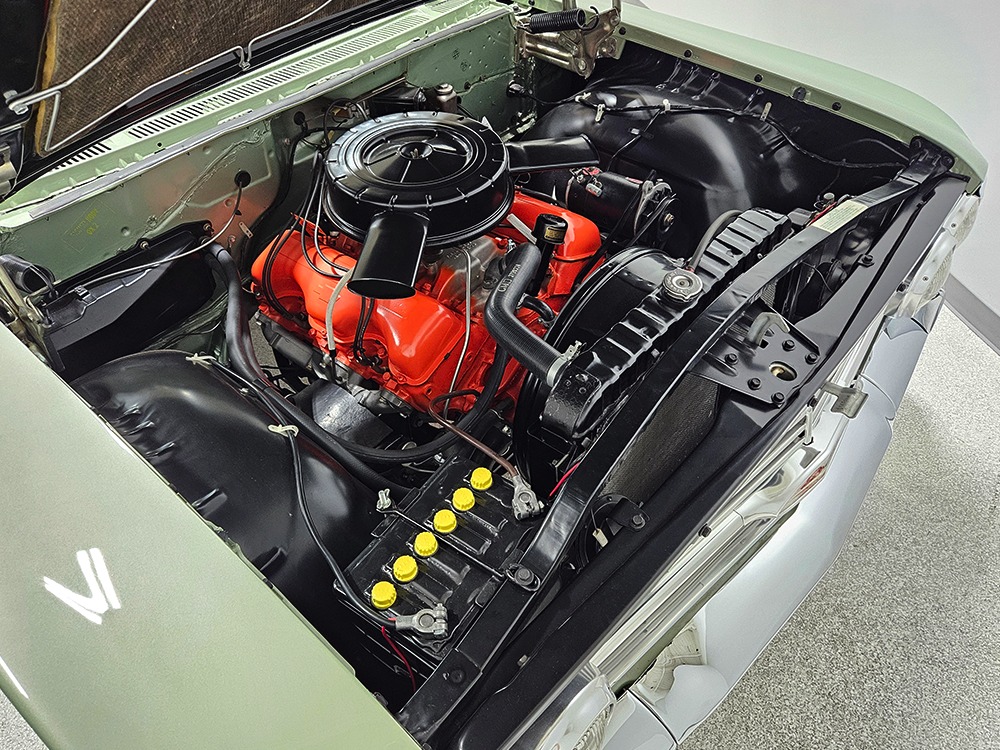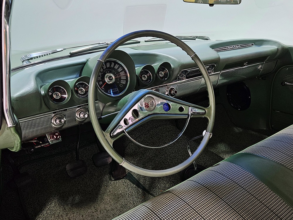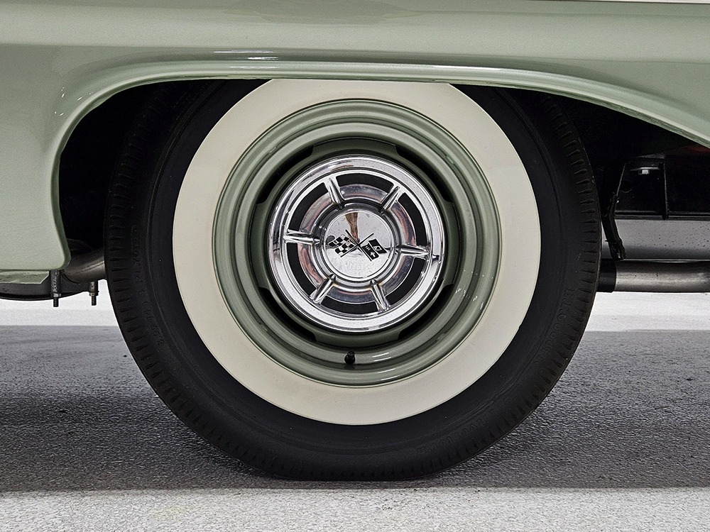 But it’s the engine that really matters with this car. It’s a correct FJ-coded engine, which means it’s a 348 cubic inch V8 with 11.25:1 compression, solid lifters, and a 4-barrel carburetor, which all add up to 340 horsepower—one of the most potent engines you could buy in 1960. It has been fully rebuilt with a more user-friendly 10:1 compression ratio for today’s fuels, and it runs superbly. It starts easily and once it’s off the choke, it pulls the big Imp around with genuine authority. There’s easy torque all over the map and it’s impeccably smooth, which you might not expect from something with this much firepower. All the little details are correct, from the dual-point distributor to the Carter AFB carburetor to the 2.5-inch exhaust manifolds, which are unique to the high-performance engines. It’s also correctly detailed with Chevy Orange paint on the block and valve covers, that big dual-snorkel air cleaner, and little things like the tower hose clamps, GM-stamped radiator hoses, and tar top battery. It shouldn’t be a surprise that this car is a multiple prize winner. The transmission is a correct wide-ratio T-10 with an aluminum tailshaft and a Corvette bellhousing, just like it was in 1960 and there are 3.36 gears out back, making this a comfortable cruiser in any environment. The undercarriage is highly detailed and shows quite well, including the authentic exhaust system with mufflers and resonators, as original. New spiral-type shocks are fitted, there are new bushings and hardware throughout, and the brake system has been fully rebuilt. It sits on color-matched 14-inch steel wheels with correct hubcaps and a set of 8.00-14 BFGoodrich Silvertown wide whitewalls.