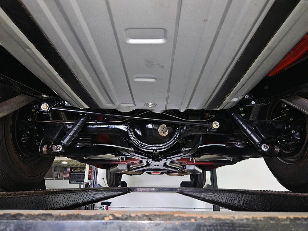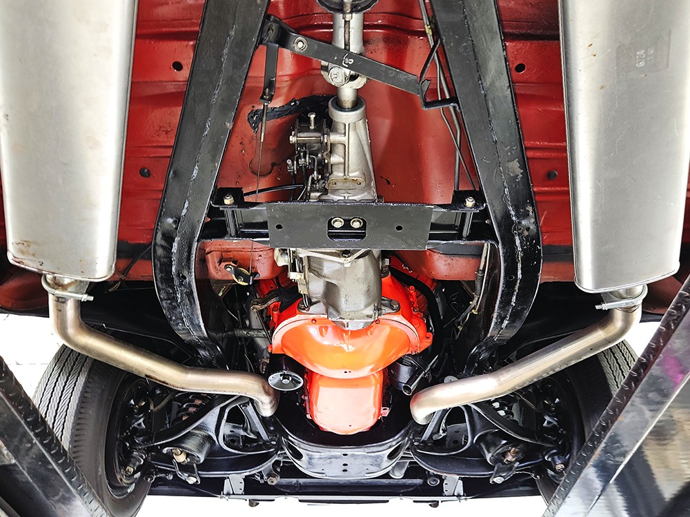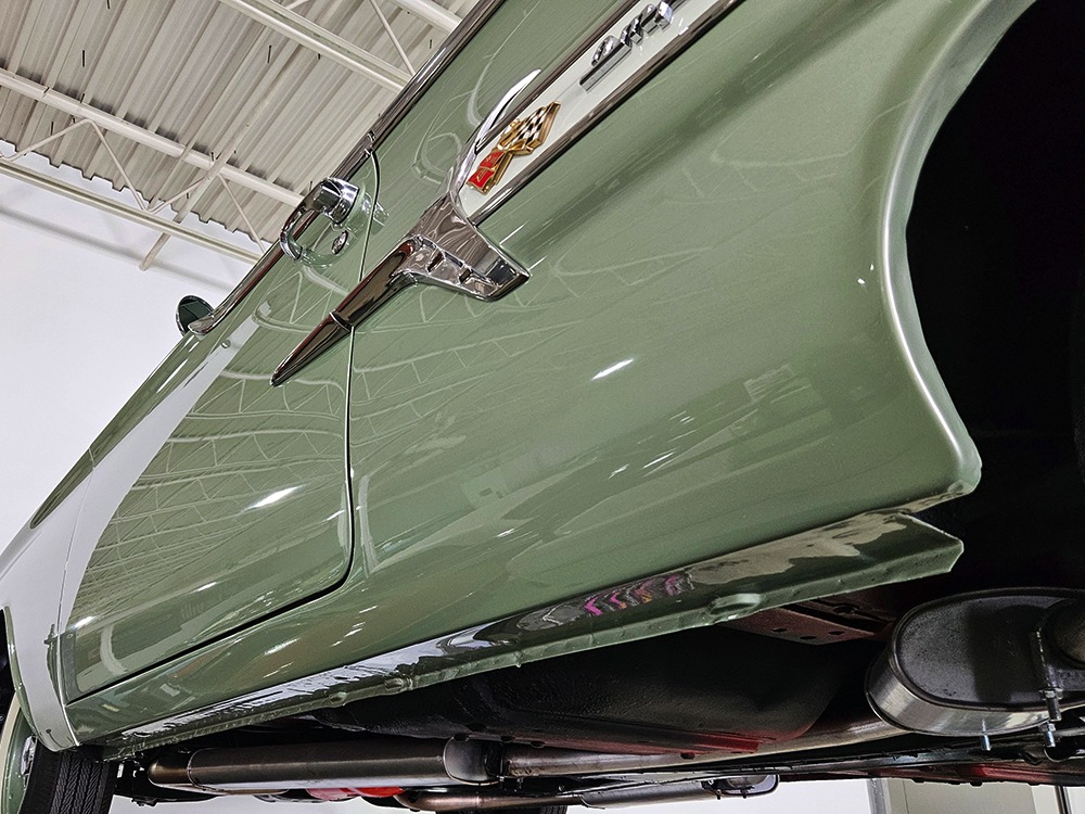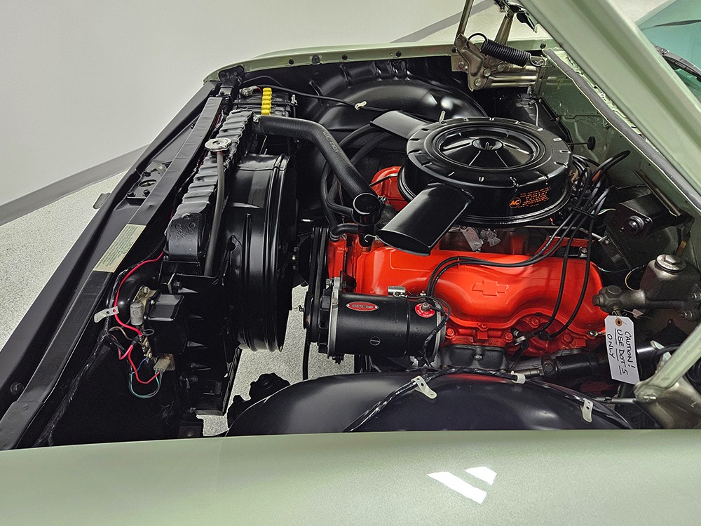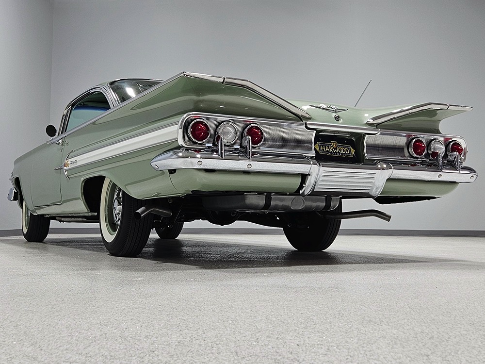 But it’s the engine that really matters with this car. It’s a correct FJ-coded engine, which means it’s a 348 cubic inch V8 with 11.25:1 compression, solid lifters, and a 4-barrel carburetor, which all add up to 340 horsepower—one of the most potent engines you could buy in 1960. It has been fully rebuilt with a more user-friendly 10:1 compression ratio for today’s fuels, and it runs superbly. It starts easily and once it’s off the choke, it pulls the big Imp around with genuine authority. There’s easy torque all over the map and it’s impeccably smooth, which you might not expect from something with this much firepower. All the little details are correct, from the dual-point distributor to the Carter AFB carburetor to the 2.5-inch exhaust manifolds, which are unique to the high-performance engines. It’s also correctly detailed with Chevy Orange paint on the block and valve covers, that big dual-snorkel air cleaner, and little things like the tower hose clamps, GM-stamped radiator hoses, and tar top battery. It shouldn’t be a surprise that this car is a multiple prize winner. The transmission is a correct wide-ratio T-10 with an aluminum tailshaft and a Corvette bellhousing, just like it was in 1960 and there are 3.36 gears out back, making this a comfortable cruiser in any environment. The undercarriage is highly detailed and shows quite well, including the authentic exhaust system with mufflers and resonators, as original. New spiral-type shocks are fitted, there are new bushings and hardware throughout, and the brake system has been fully rebuilt. It sits on color-matched 14-inch steel wheels with correct hubcaps and a set of 8.00-14 BFGoodrich Silvertown wide whitewalls.
