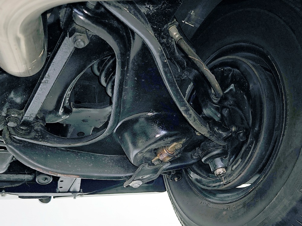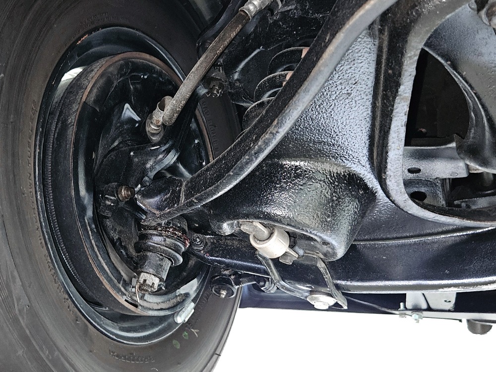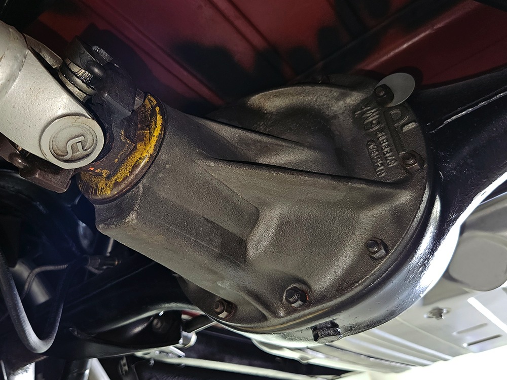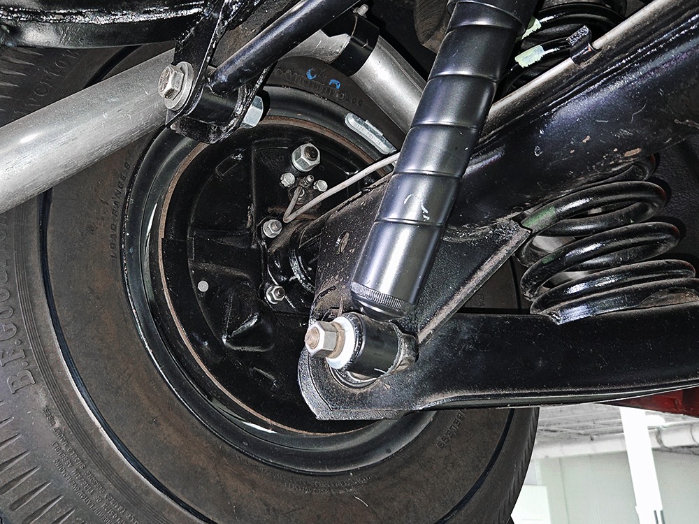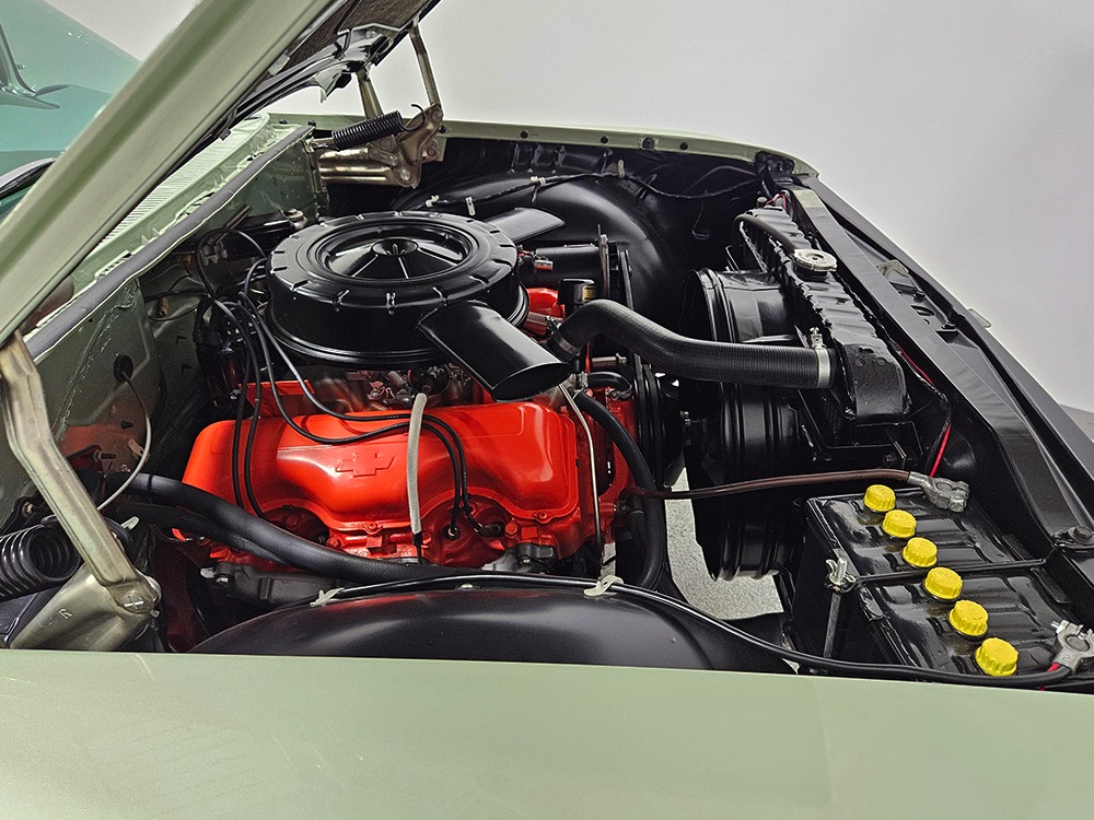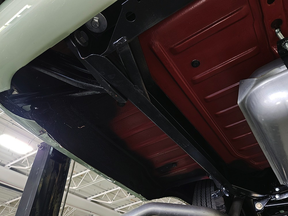 But it’s the engine that really matters with this car. It’s a correct FJ-coded engine, which means it’s a 348 cubic inch V8 with 11.25:1 compression, solid lifters, and a 4-barrel carburetor, which all add up to 340 horsepower—one of the most potent engines you could buy in 1960. It has been fully rebuilt with a more user-friendly 10:1 compression ratio for today’s fuels, and it runs superbly. It starts easily and once it’s off the choke, it pulls the big Imp around with genuine authority. There’s easy torque all over the map and it’s impeccably smooth, which you might not expect from something with this much firepower. All the little details are correct, from the dual-point distributor to the Carter AFB carburetor to the 2.5-inch exhaust manifolds, which are unique to the high-performance engines. It’s also correctly detailed with Chevy Orange paint on the block and valve covers, that big dual-snorkel air cleaner, and little things like the tower hose clamps, GM-stamped radiator hoses, and tar top battery. It shouldn’t be a surprise that this car is a multiple prize winner. The transmission is a correct wide-ratio T-10 with an aluminum tailshaft and a Corvette bellhousing, just like it was in 1960 and there are 3.36 gears out back, making this a comfortable cruiser in any environment. The undercarriage is highly detailed and shows quite well, including the authentic exhaust system with mufflers and resonators, as original. New spiral-type shocks are fitted, there are new bushings and hardware throughout, and the brake system has been fully rebuilt. It sits on color-matched 14-inch steel wheels with correct hubcaps and a set of 8.00-14 BFGoodrich Silvertown wide whitewalls.