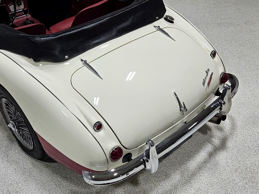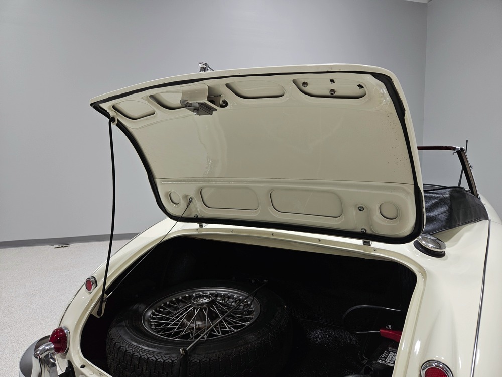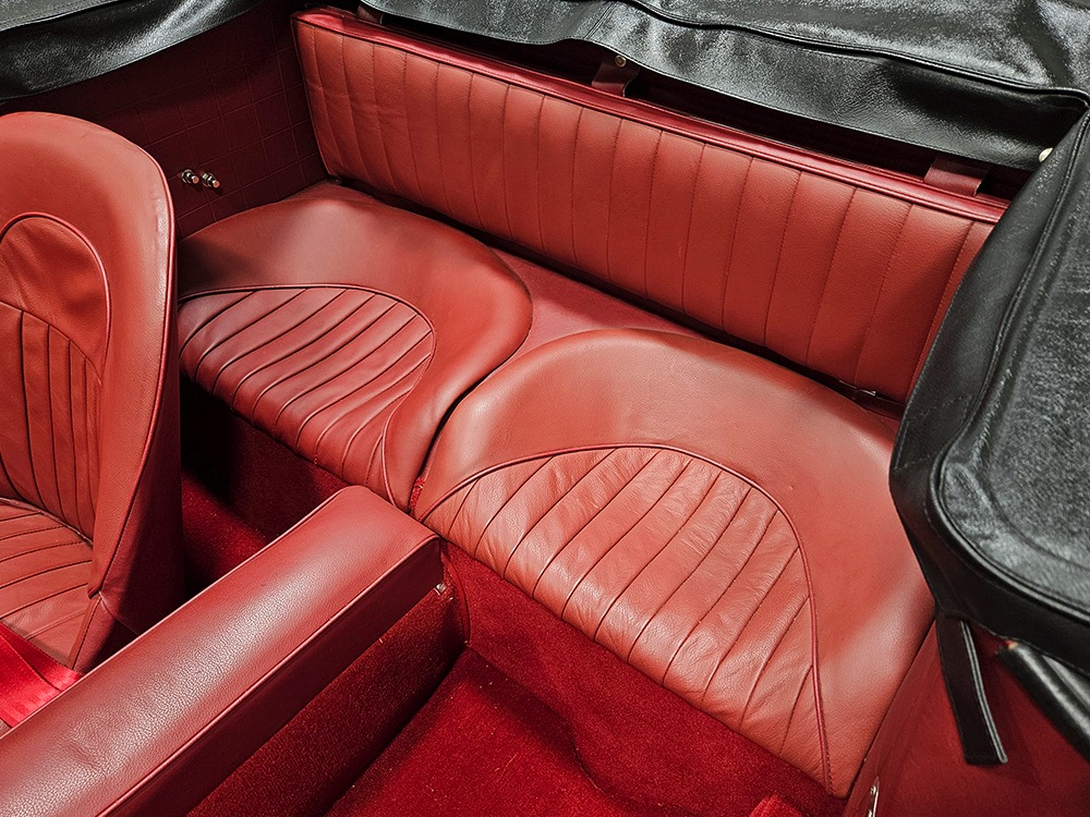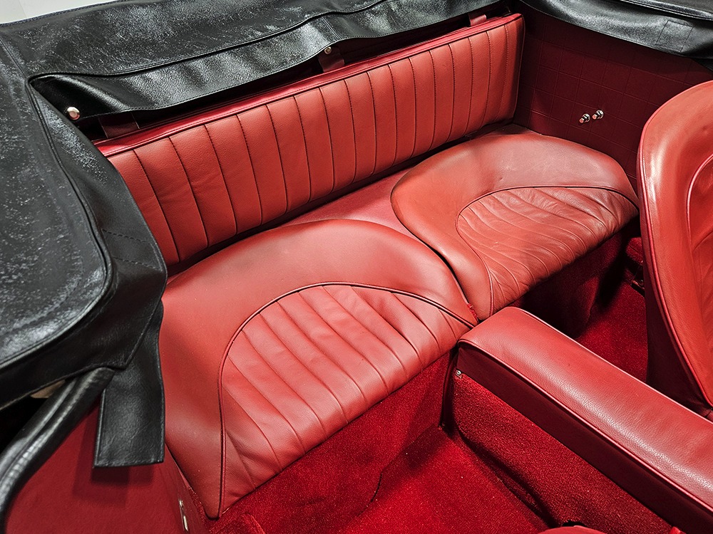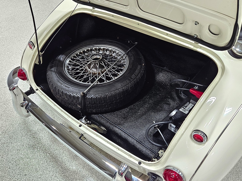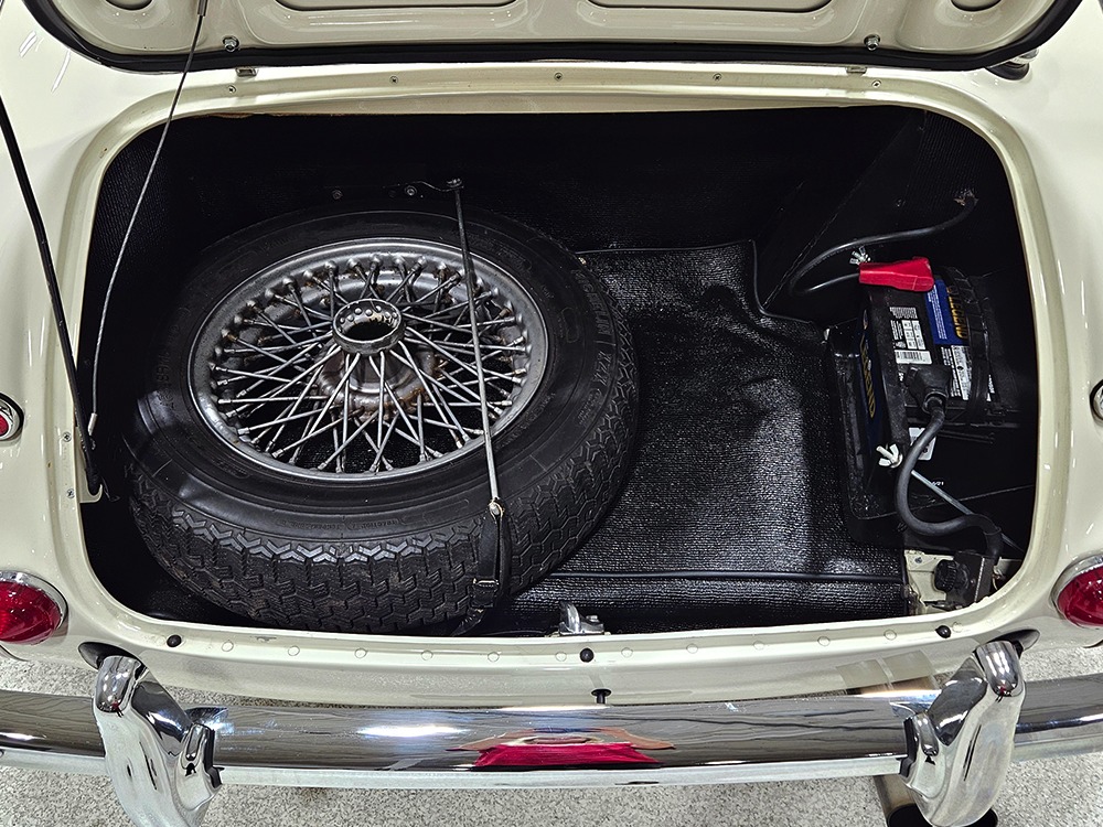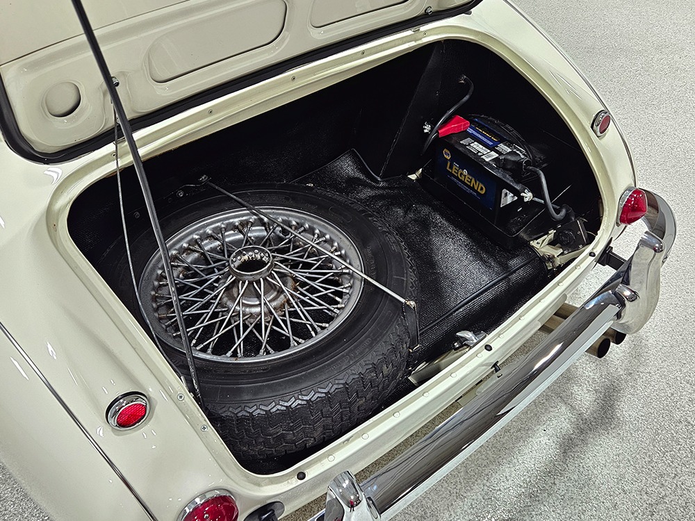 The red leather interior is part of why we love this Healey so much. It’s the perfect complement to the sporting two-tone bodywork, sophisticated yet flashy, and entirely appropriate for a big kid’s sports car. Everything inside the car is new, including the upholstery, carpets, door panels, and even the dash pad. There’s a big banjo-style steering wheel that makes it quite easy to handle and there’s a matching shifter knob for the 4-speed manual gearbox. All the Smiths gauges were rebuilt and remain fully operational, and this car is equipped with an optional heater unit under the dash, which can extend your driving season a bit. The factory overdrive unit is operational and is actuated by a simple toggle switch on the dash, and it really transforms this into a grand touring car that can eat up a lot of pavement in a single sitting. The back seats are probably best for small children, but it does provide decent storage space, along with the trunk, which is fully finished with correct mats, a full-sized spare, and the battery. There’s also a black vinyl folding convertible top and matching boot, which obviously hasn’t seen much use.