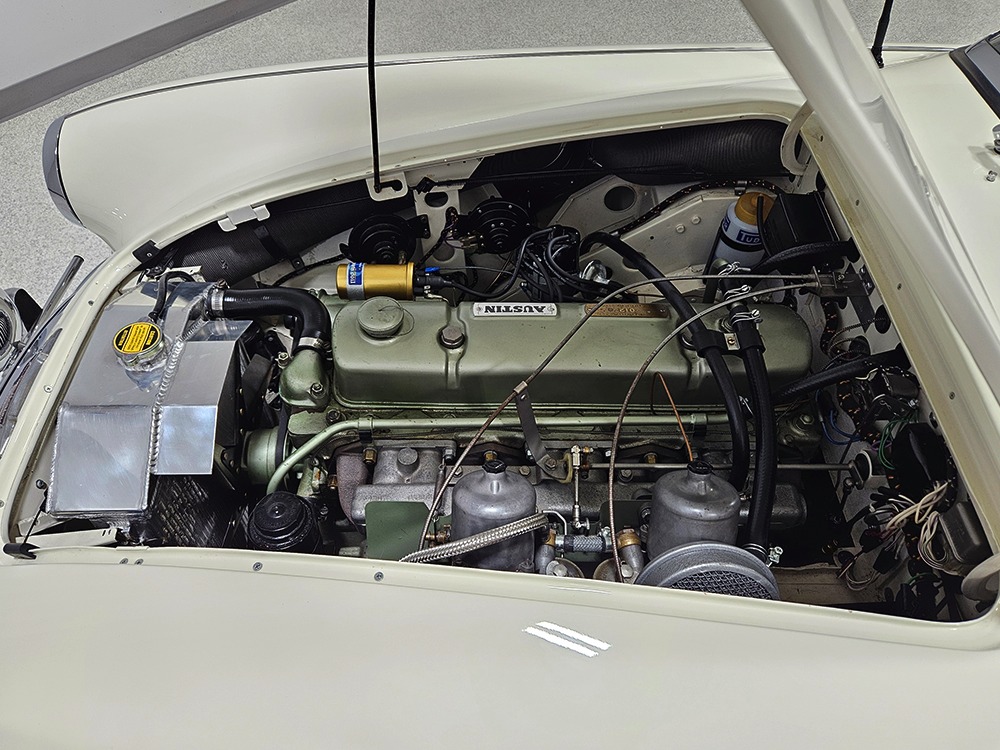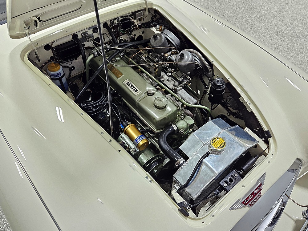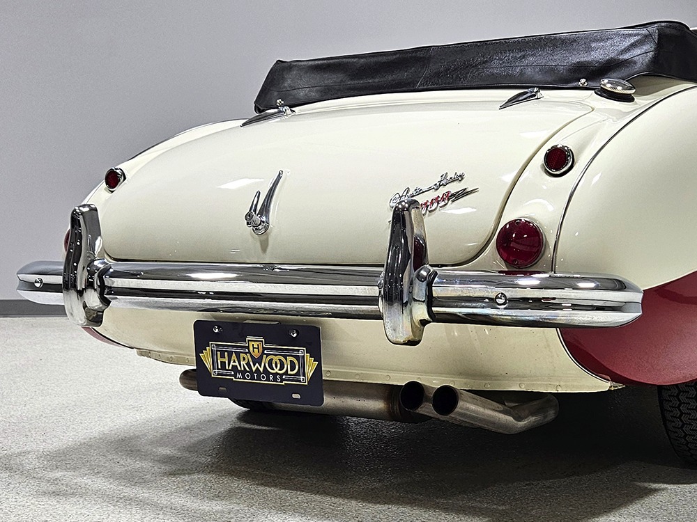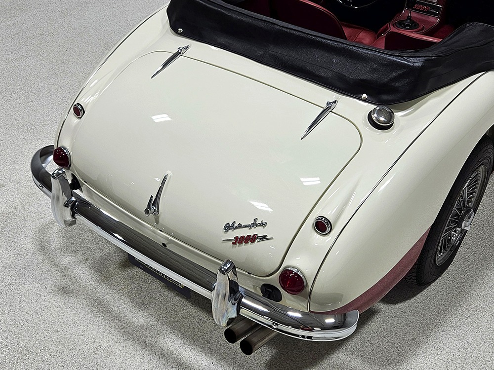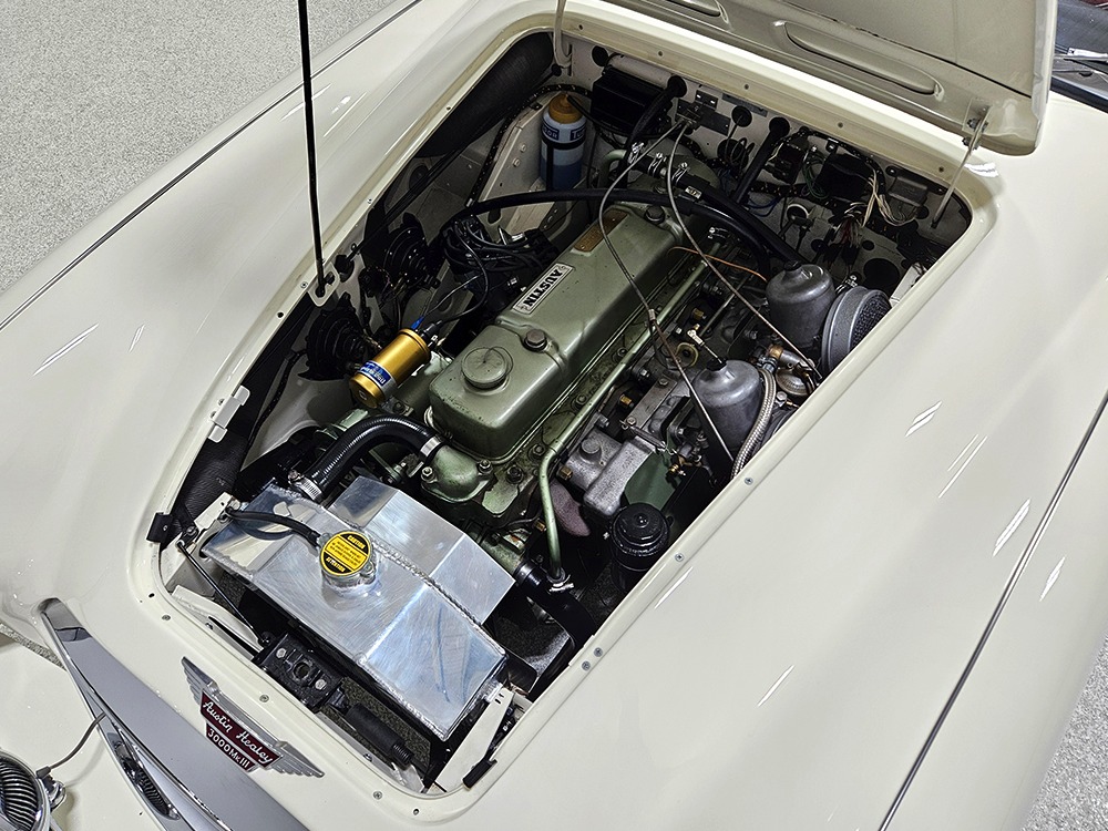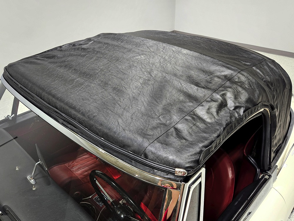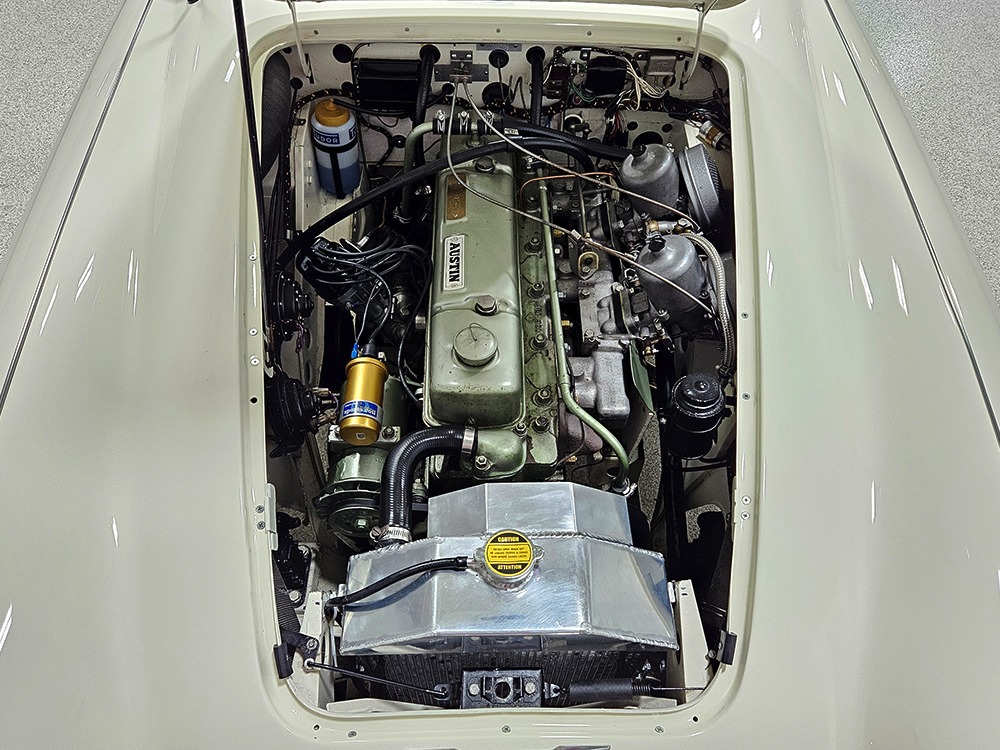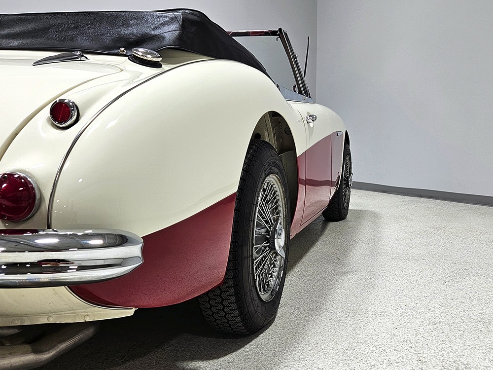 The red leather interior is part of why we love this Healey so much. It’s the perfect complement to the sporting two-tone bodywork, sophisticated yet flashy, and entirely appropriate for a big kid’s sports car. Everything inside the car is new, including the upholstery, carpets, door panels, and even the dash pad. There’s a big banjo-style steering wheel that makes it quite easy to handle and there’s a matching shifter knob for the 4-speed manual gearbox. All the Smiths gauges were rebuilt and remain fully operational, and this car is equipped with an optional heater unit under the dash, which can extend your driving season a bit. The factory overdrive unit is operational and is actuated by a simple toggle switch on the dash, and it really transforms this into a grand touring car that can eat up a lot of pavement in a single sitting. The back seats are probably best for small children, but it does provide decent storage space, along with the trunk, which is fully finished with correct mats, a full-sized spare, and the battery. There’s also a black vinyl folding convertible top and matching boot, which obviously hasn’t seen much use.