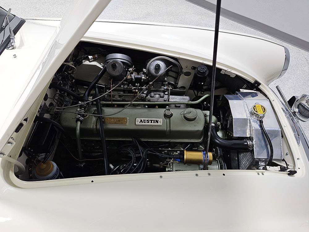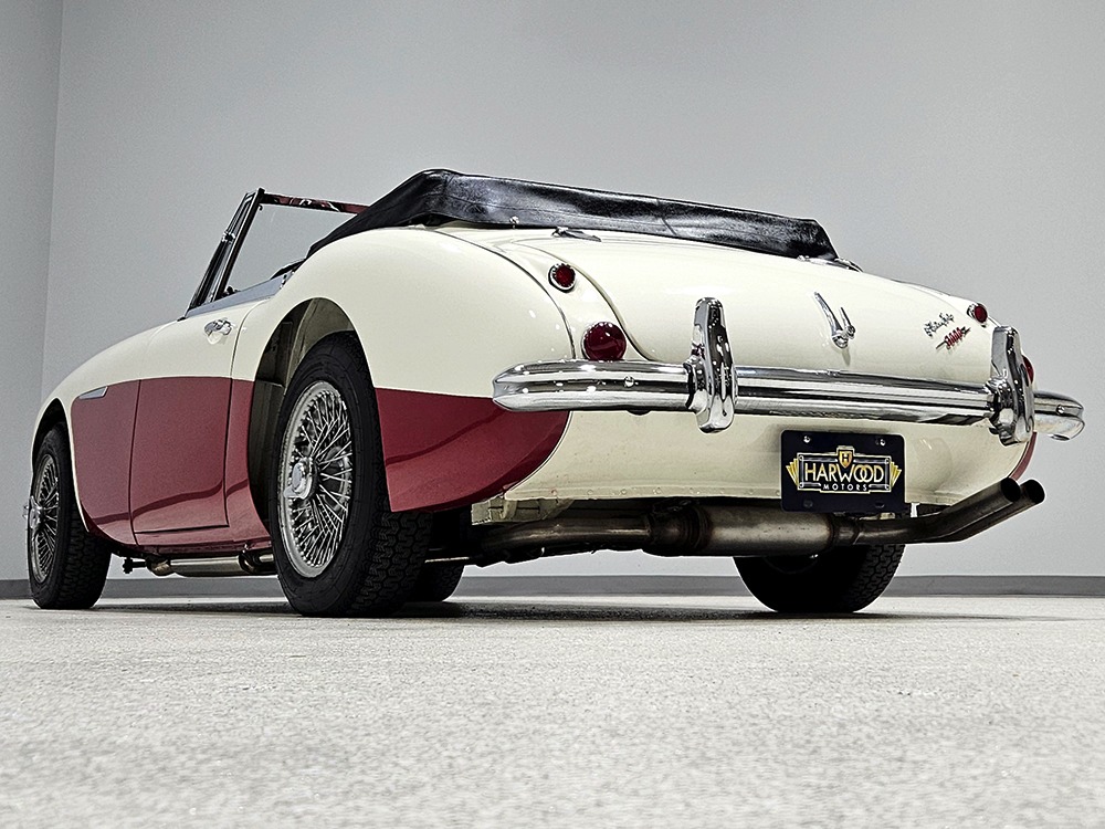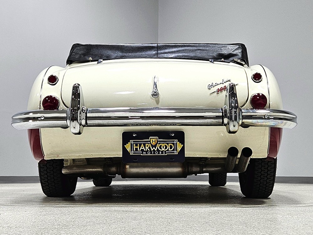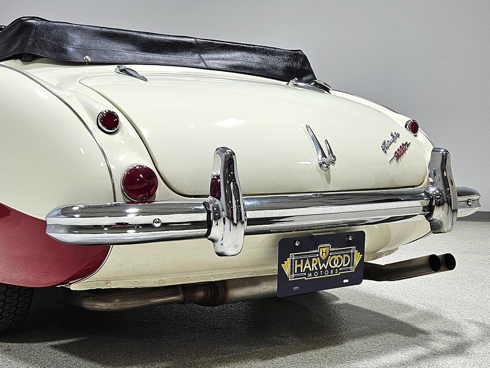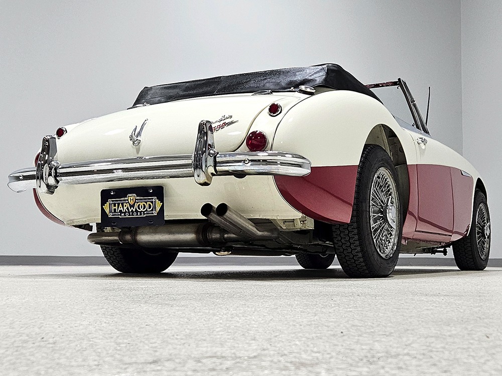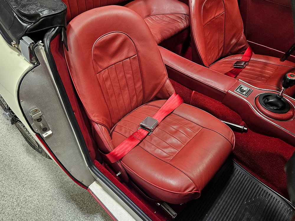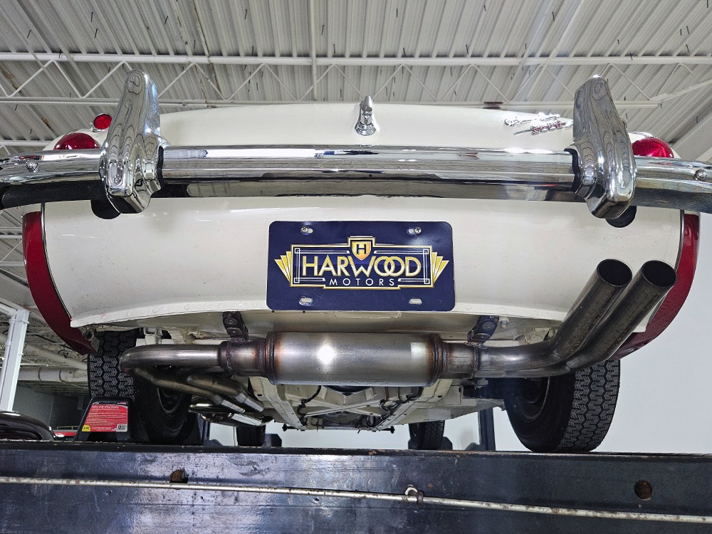 The red leather interior is part of why we love this Healey so much. It’s the perfect complement to the sporting two-tone bodywork, sophisticated yet flashy, and entirely appropriate for a big kid’s sports car. Everything inside the car is new, including the upholstery, carpets, door panels, and even the dash pad. There’s a big banjo-style steering wheel that makes it quite easy to handle and there’s a matching shifter knob for the 4-speed manual gearbox. All the Smiths gauges were rebuilt and remain fully operational, and this car is equipped with an optional heater unit under the dash, which can extend your driving season a bit. The factory overdrive unit is operational and is actuated by a simple toggle switch on the dash, and it really transforms this into a grand touring car that can eat up a lot of pavement in a single sitting. The back seats are probably best for small children, but it does provide decent storage space, along with the trunk, which is fully finished with correct mats, a full-sized spare, and the battery. There’s also a black vinyl folding convertible top and matching boot, which obviously hasn’t seen much use.
