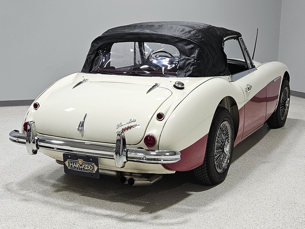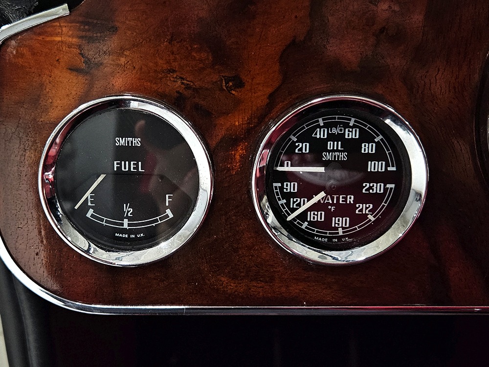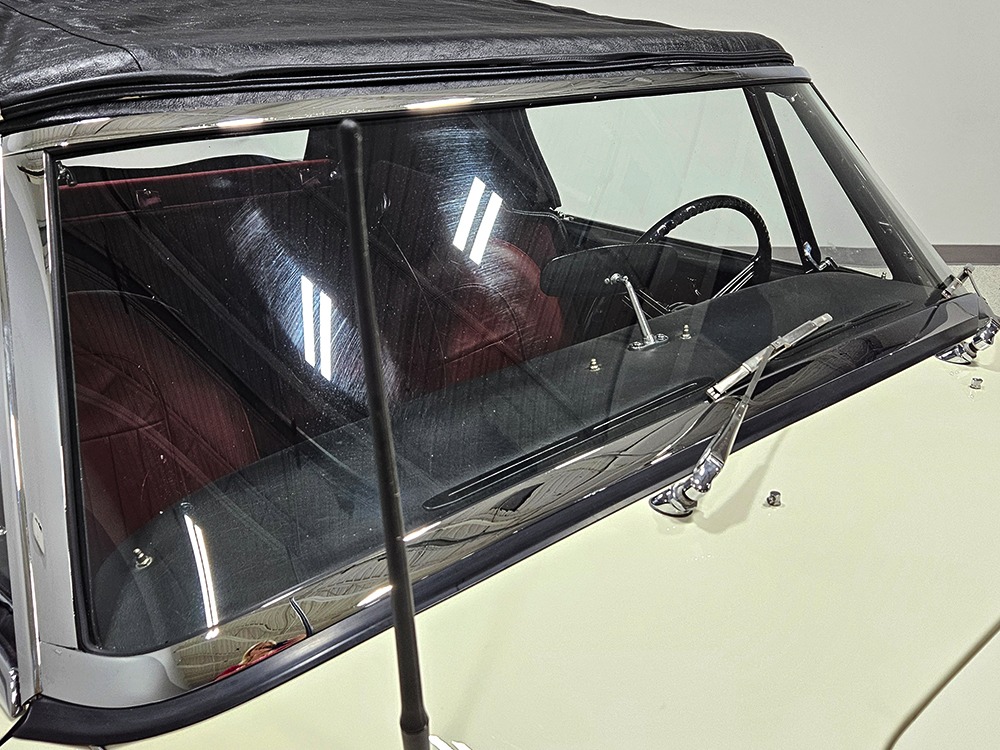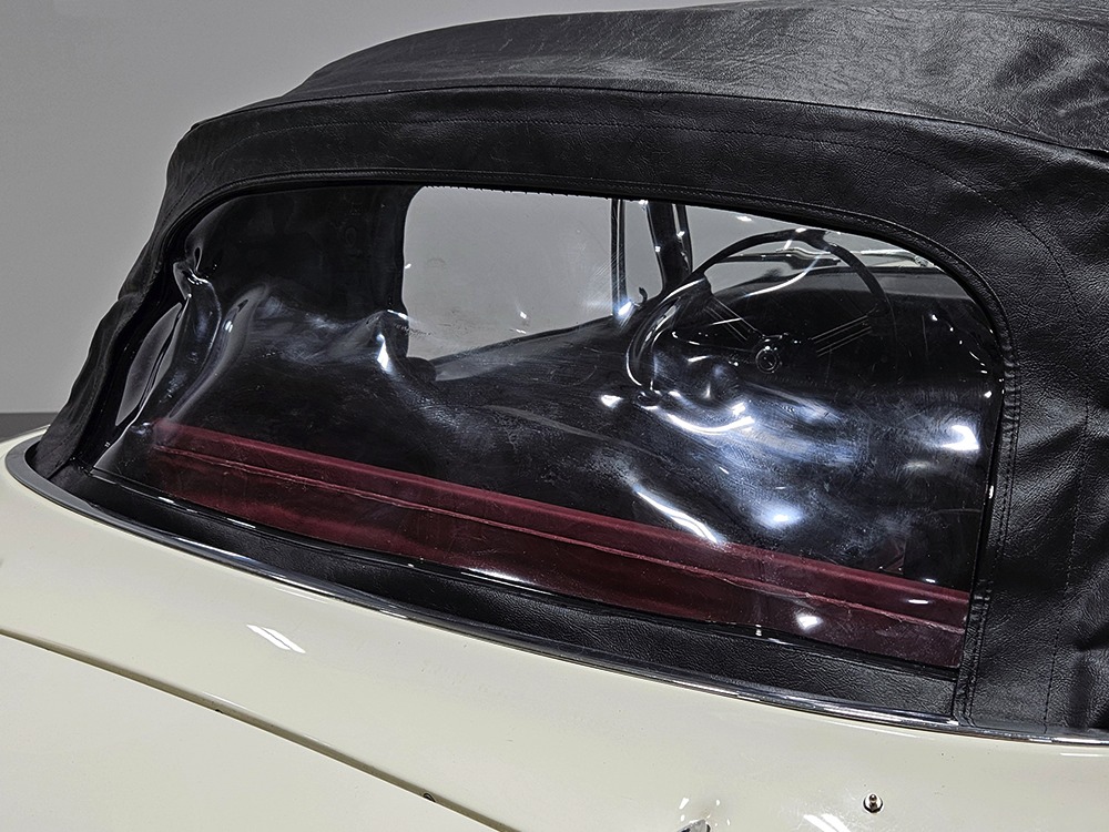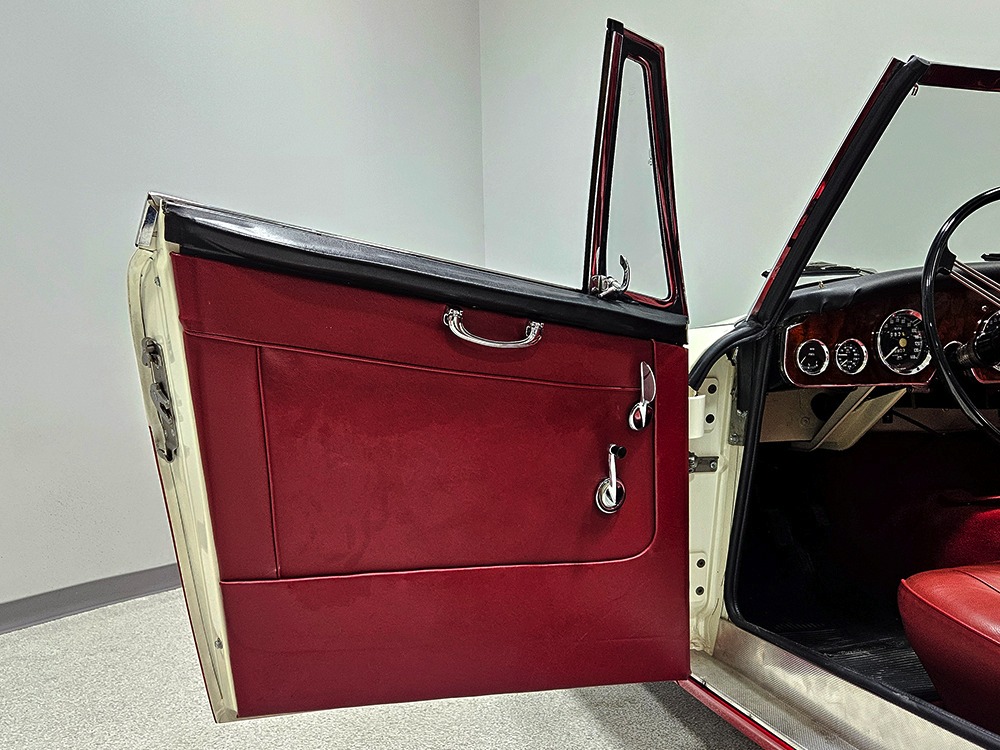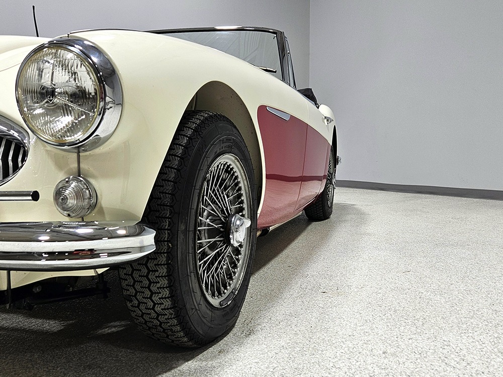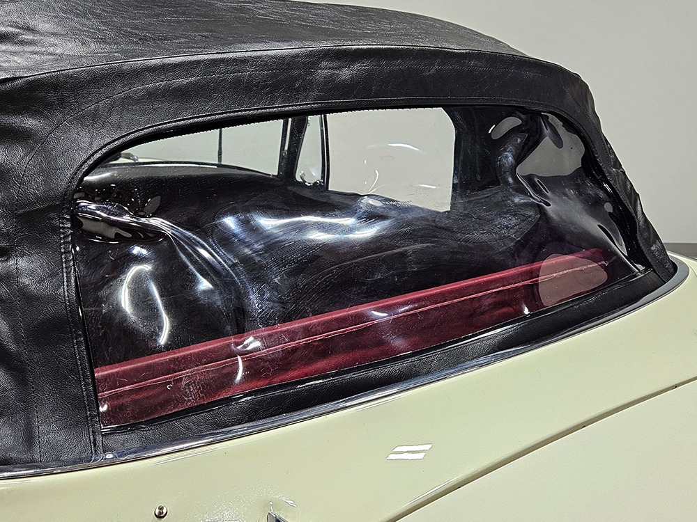 The red leather interior is part of why we love this Healey so much. It’s the perfect complement to the sporting two-tone bodywork, sophisticated yet flashy, and entirely appropriate for a big kid’s sports car. Everything inside the car is new, including the upholstery, carpets, door panels, and even the dash pad. There’s a big banjo-style steering wheel that makes it quite easy to handle and there’s a matching shifter knob for the 4-speed manual gearbox. All the Smiths gauges were rebuilt and remain fully operational, and this car is equipped with an optional heater unit under the dash, which can extend your driving season a bit. The factory overdrive unit is operational and is actuated by a simple toggle switch on the dash, and it really transforms this into a grand touring car that can eat up a lot of pavement in a single sitting. The back seats are probably best for small children, but it does provide decent storage space, along with the trunk, which is fully finished with correct mats, a full-sized spare, and the battery. There’s also a black vinyl folding convertible top and matching boot, which obviously hasn’t seen much use.
