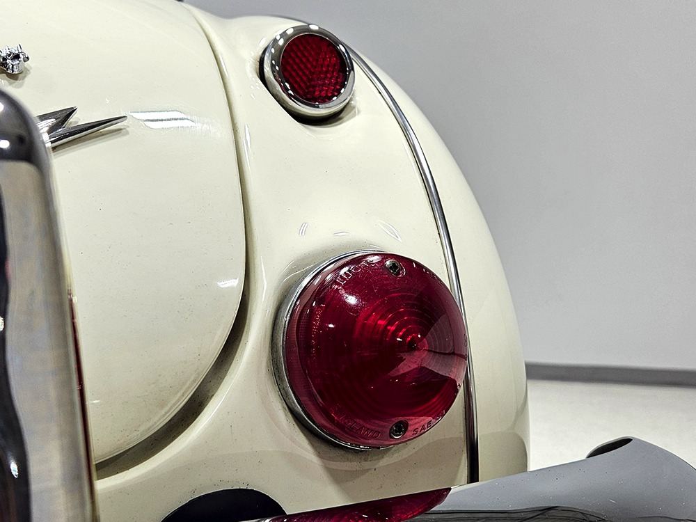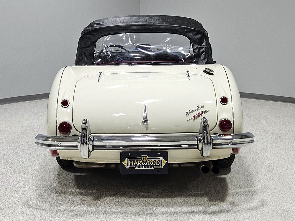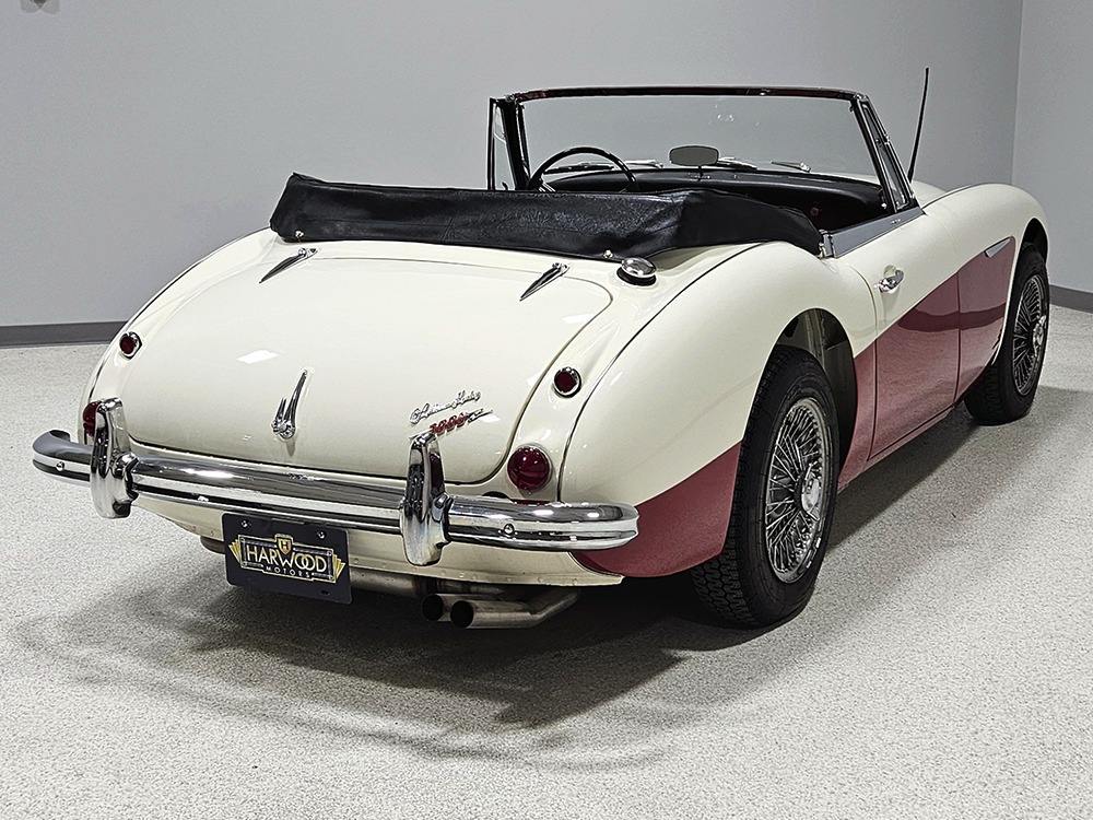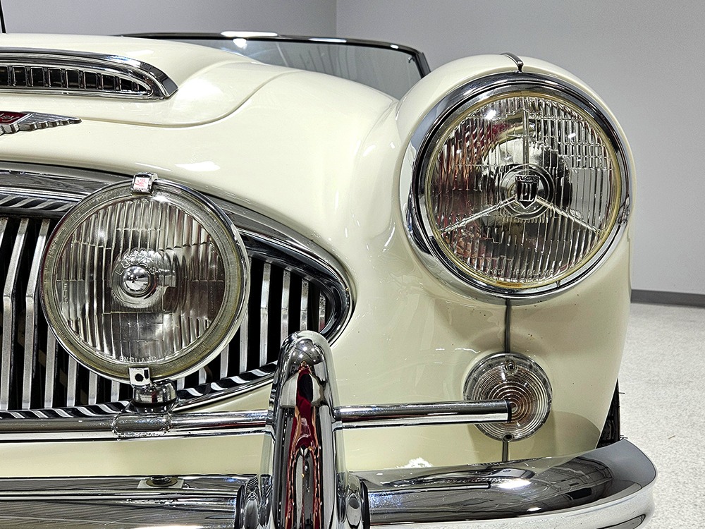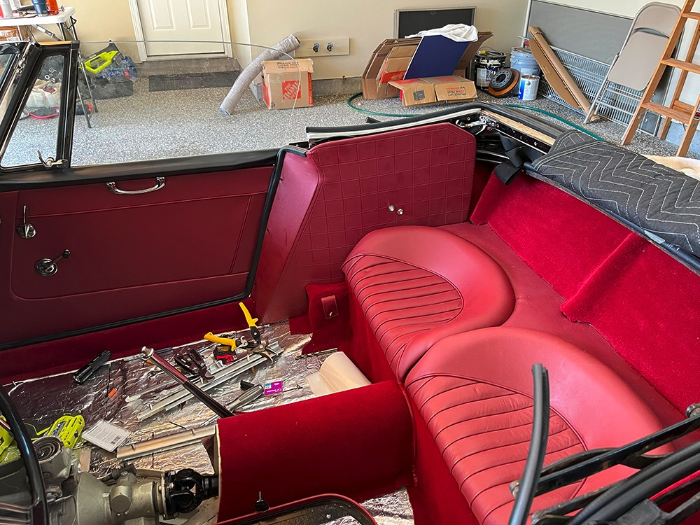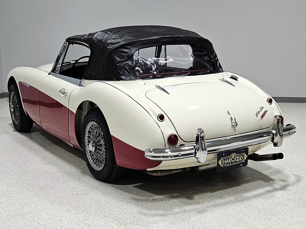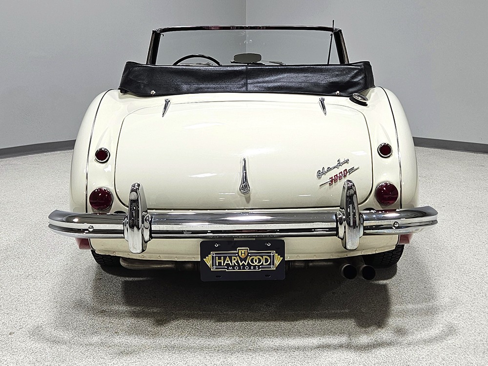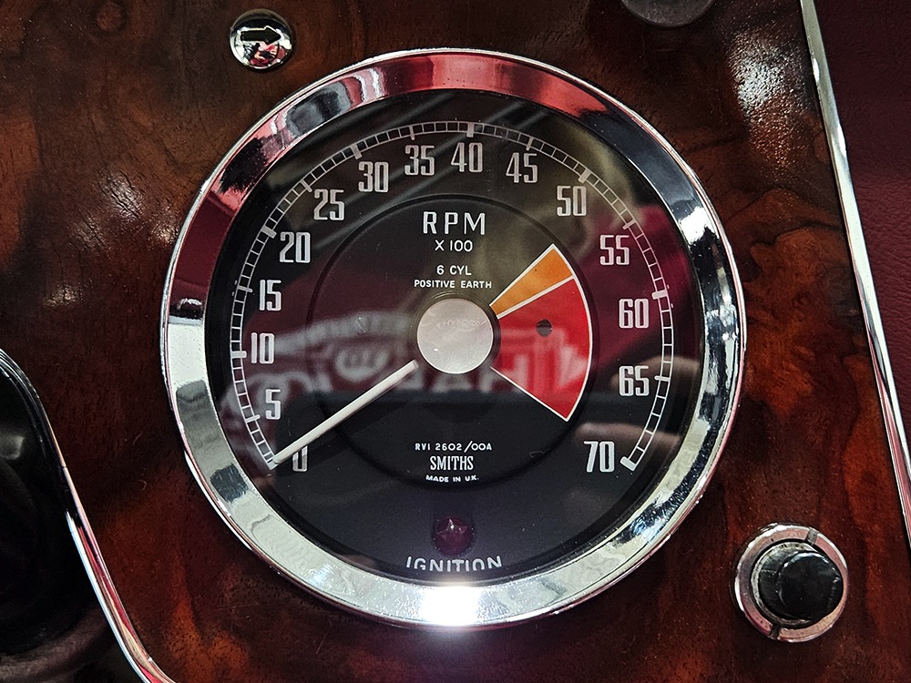 The red leather interior is part of why we love this Healey so much. It’s the perfect complement to the sporting two-tone bodywork, sophisticated yet flashy, and entirely appropriate for a big kid’s sports car. Everything inside the car is new, including the upholstery, carpets, door panels, and even the dash pad. There’s a big banjo-style steering wheel that makes it quite easy to handle and there’s a matching shifter knob for the 4-speed manual gearbox. All the Smiths gauges were rebuilt and remain fully operational, and this car is equipped with an optional heater unit under the dash, which can extend your driving season a bit. The factory overdrive unit is operational and is actuated by a simple toggle switch on the dash, and it really transforms this into a grand touring car that can eat up a lot of pavement in a single sitting. The back seats are probably best for small children, but it does provide decent storage space, along with the trunk, which is fully finished with correct mats, a full-sized spare, and the battery. There’s also a black vinyl folding convertible top and matching boot, which obviously hasn’t seen much use.