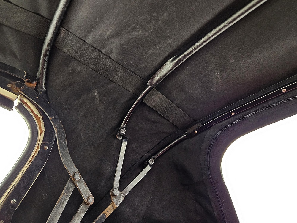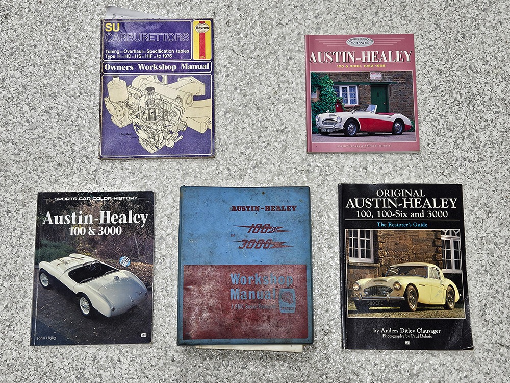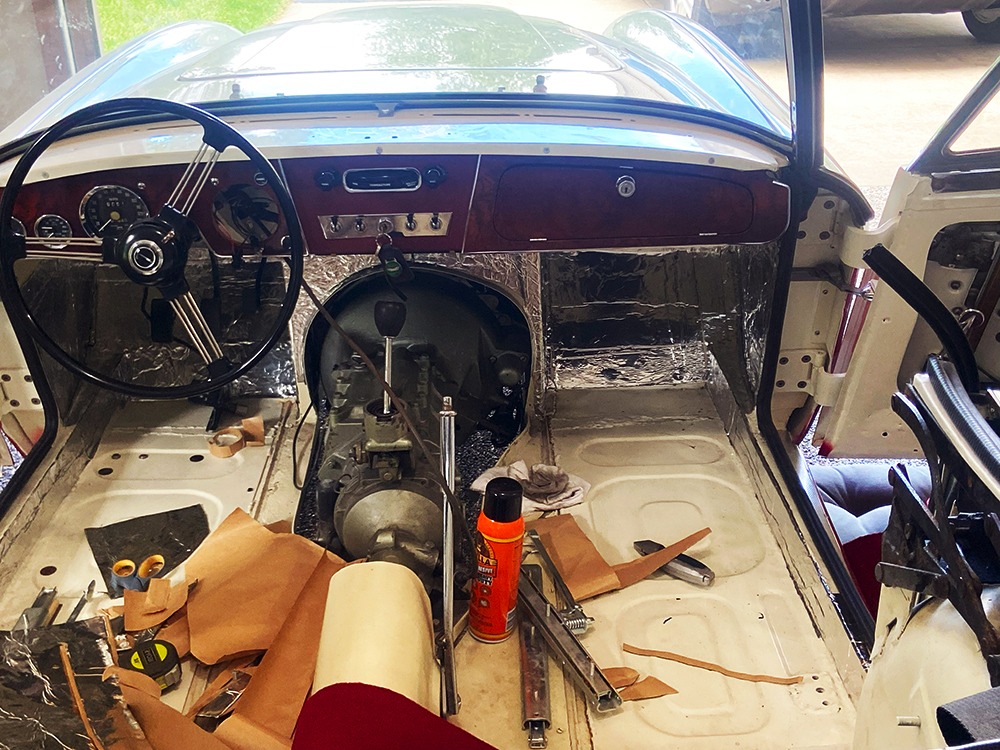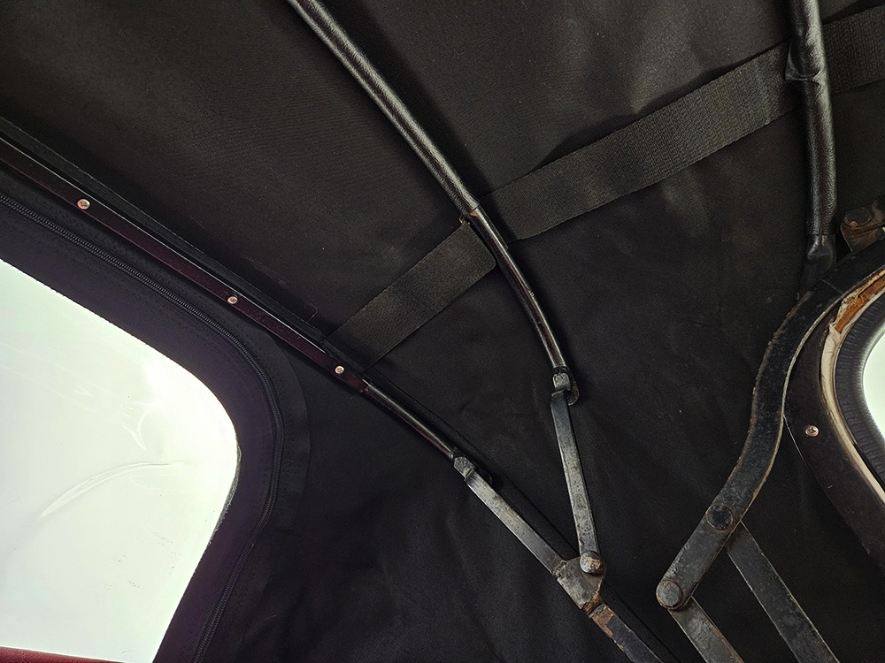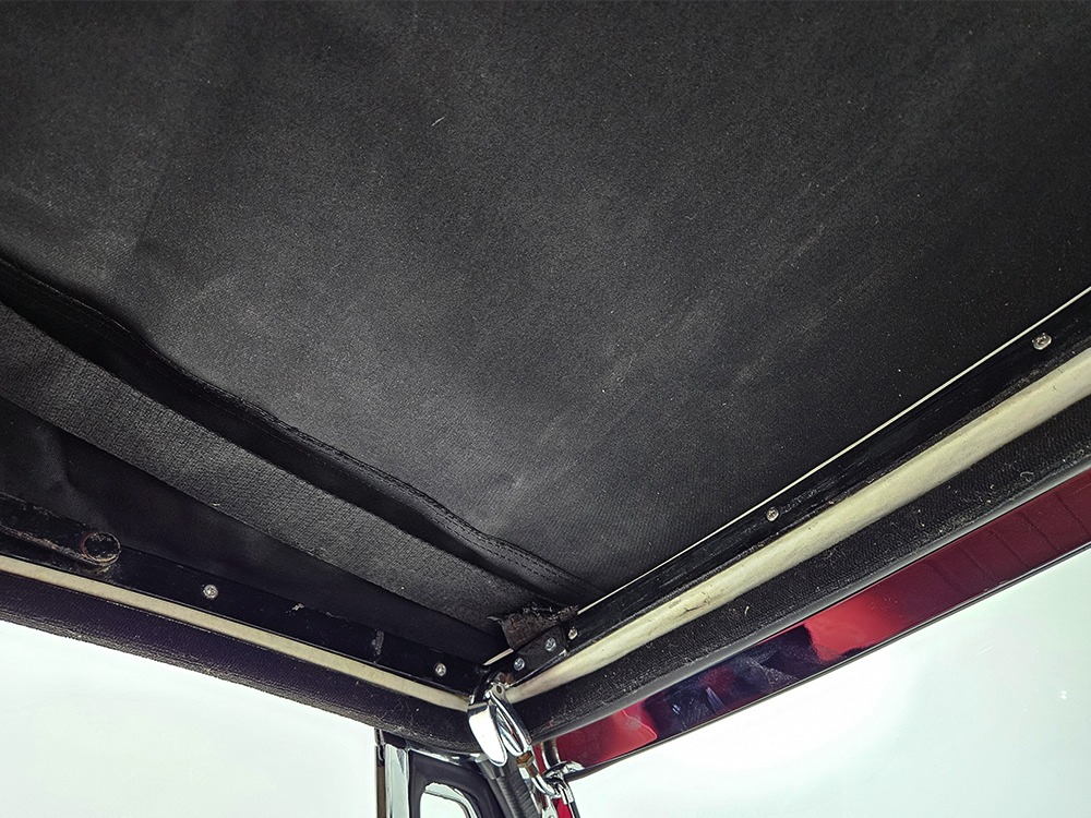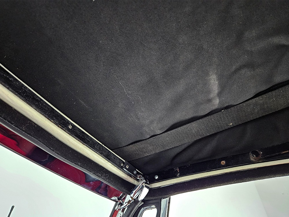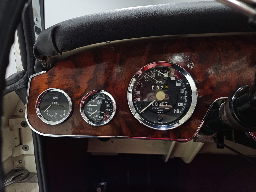 The red leather interior is part of why we love this Healey so much. It’s the perfect complement to the sporting two-tone bodywork, sophisticated yet flashy, and entirely appropriate for a big kid’s sports car. Everything inside the car is new, including the upholstery, carpets, door panels, and even the dash pad. There’s a big banjo-style steering wheel that makes it quite easy to handle and there’s a matching shifter knob for the 4-speed manual gearbox. All the Smiths gauges were rebuilt and remain fully operational, and this car is equipped with an optional heater unit under the dash, which can extend your driving season a bit. The factory overdrive unit is operational and is actuated by a simple toggle switch on the dash, and it really transforms this into a grand touring car that can eat up a lot of pavement in a single sitting. The back seats are probably best for small children, but it does provide decent storage space, along with the trunk, which is fully finished with correct mats, a full-sized spare, and the battery. There’s also a black vinyl folding convertible top and matching boot, which obviously hasn’t seen much use.