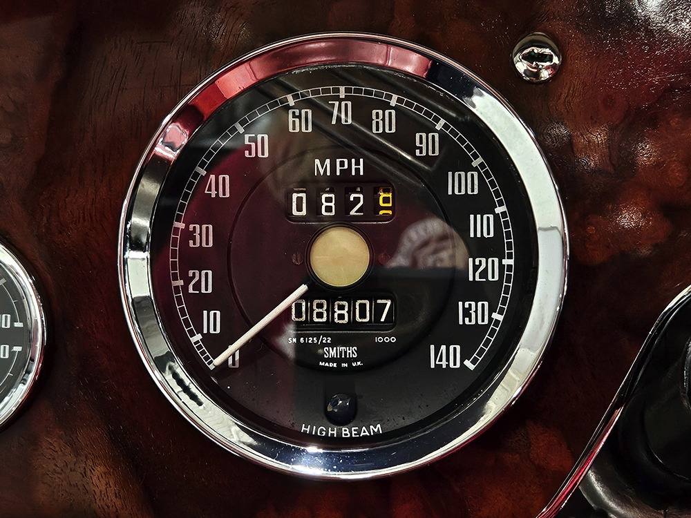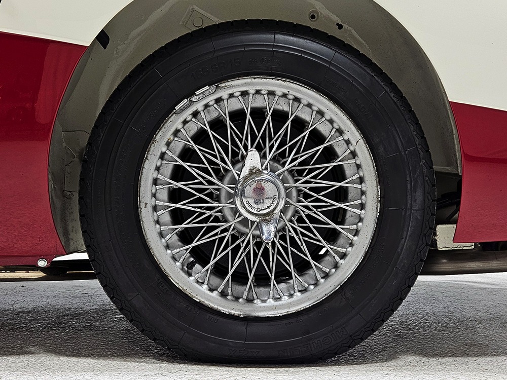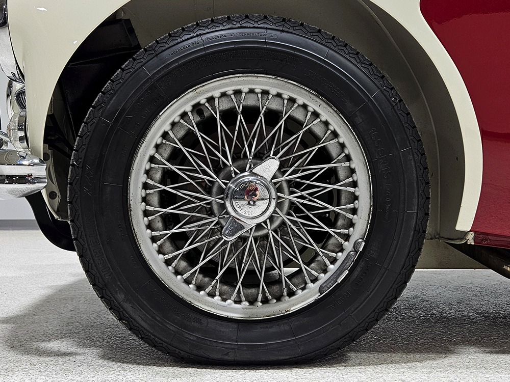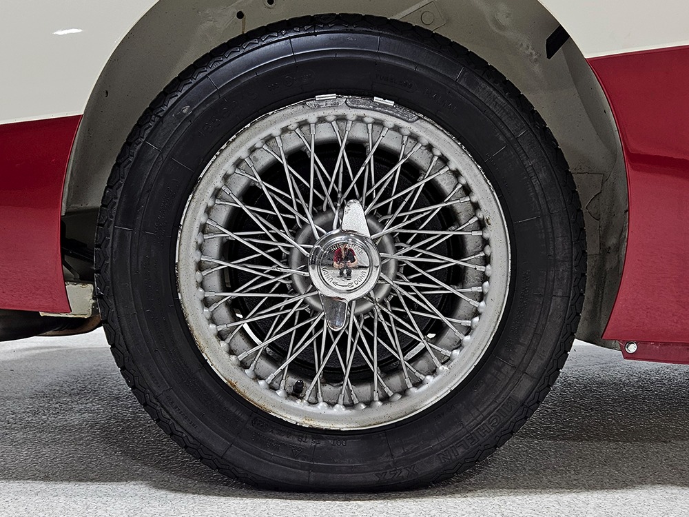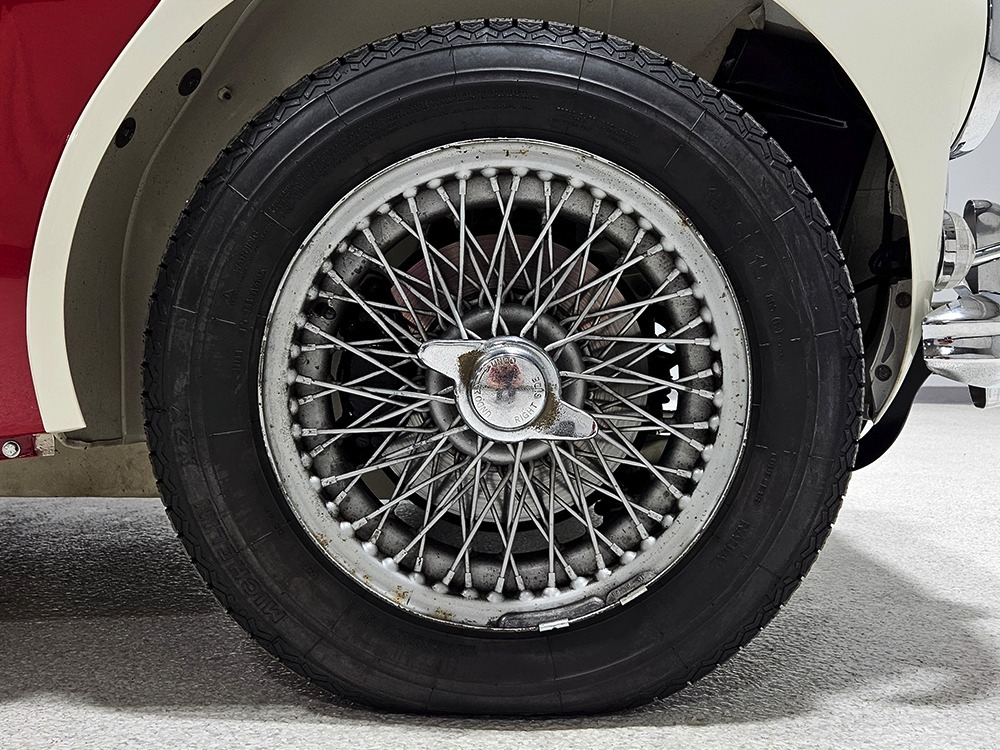The reason the 3000 is special, however, resides under the hood: a 2912 cc inline-6 that is a big step up from the unit found in the 100-6. Smoother, torquier, and just as willing to rev, it turned the big Healey into a genuinely fast car for the era. The engine was fully rebuilt to stock specs and still inhales through a pair of SU carburetors. The engine bay is correctly detailed with Austin Green paint on the engine itself, proper fittings and copper lines, and a new fabric-covered wiring harness as well as a giant aluminum radiator to keep it cool on the hottest days. It starts easily with a little choke and settles into a burbling idle that almost feels like the car is impatient and ready to go. On the road, the exhaust note is epic and there’s torque available all over the tach, which was surely the goal with the upgraded engine. The 4-speed shifts cleanly and as I mentioned, the overdrive turns it into a comfortable cruiser on today’s highways. The exhaust system is stainless, and you can see the results of the frame-off restoration throughout the undercarriage, which is still extremely clean. It brakes confidently, steers crisply, and rides surprisingly well given its primitive suspension setup. Painted wire wheels are the perfect finishing touch, and they carry 16SR15 Michelin radials that look right and handle great.