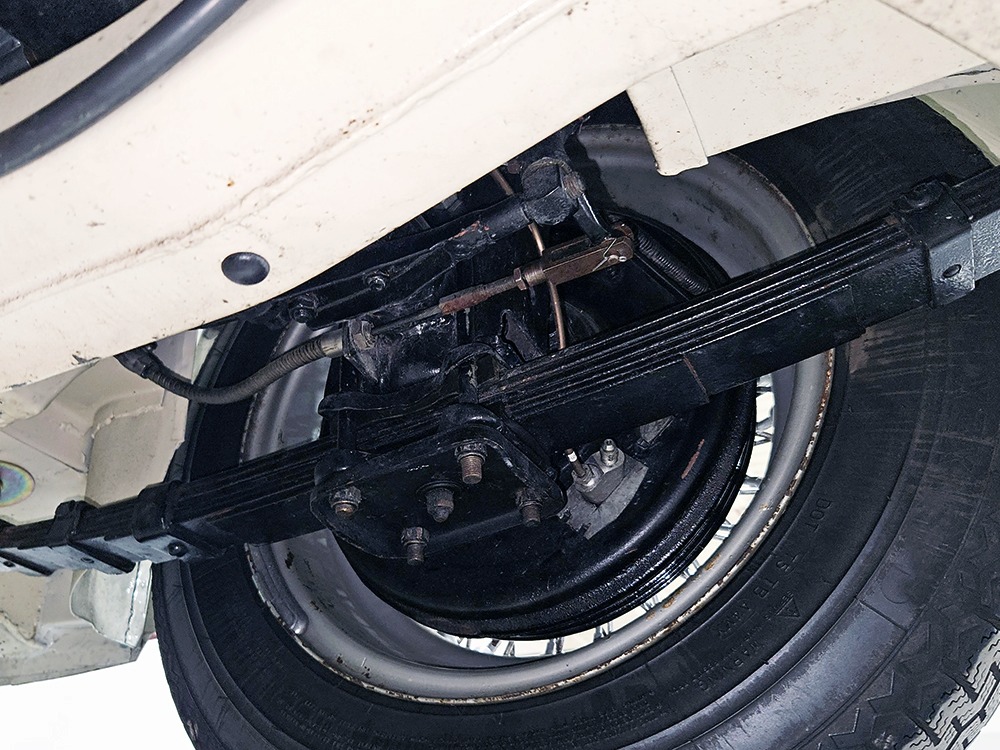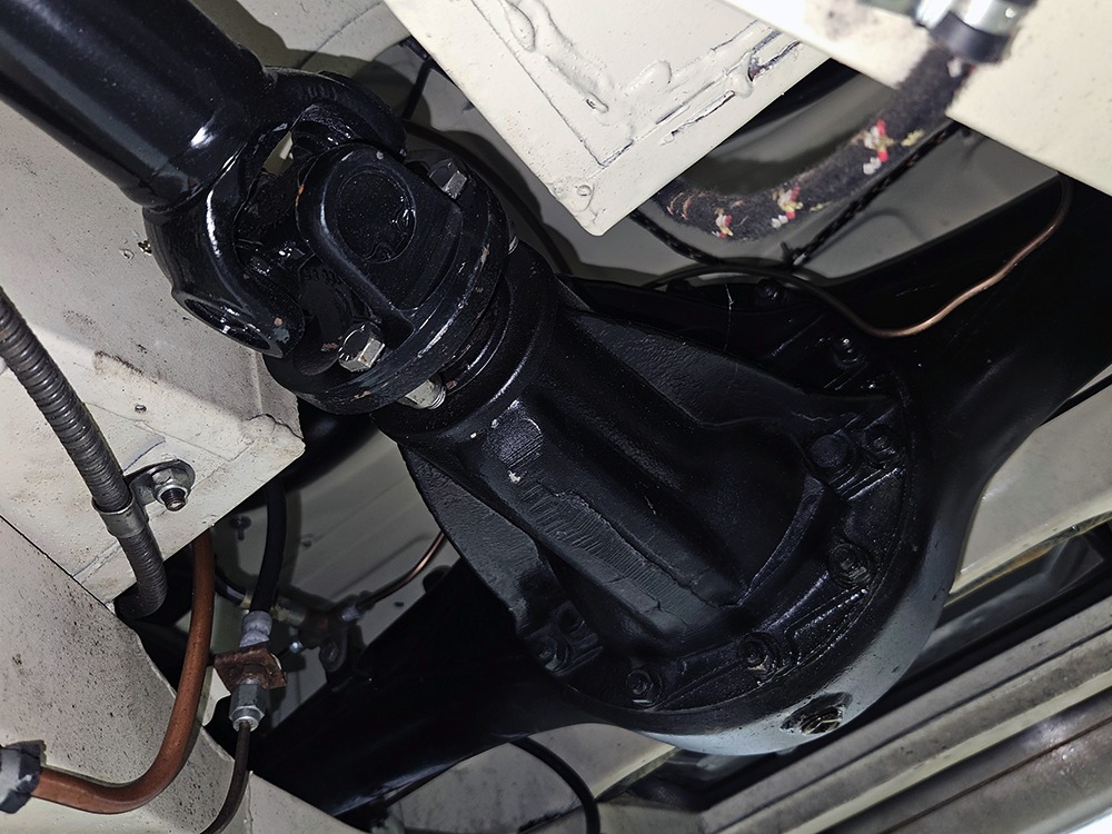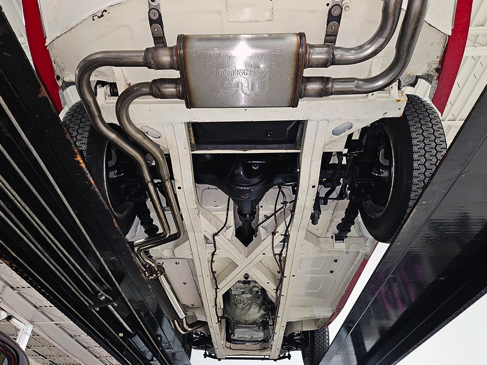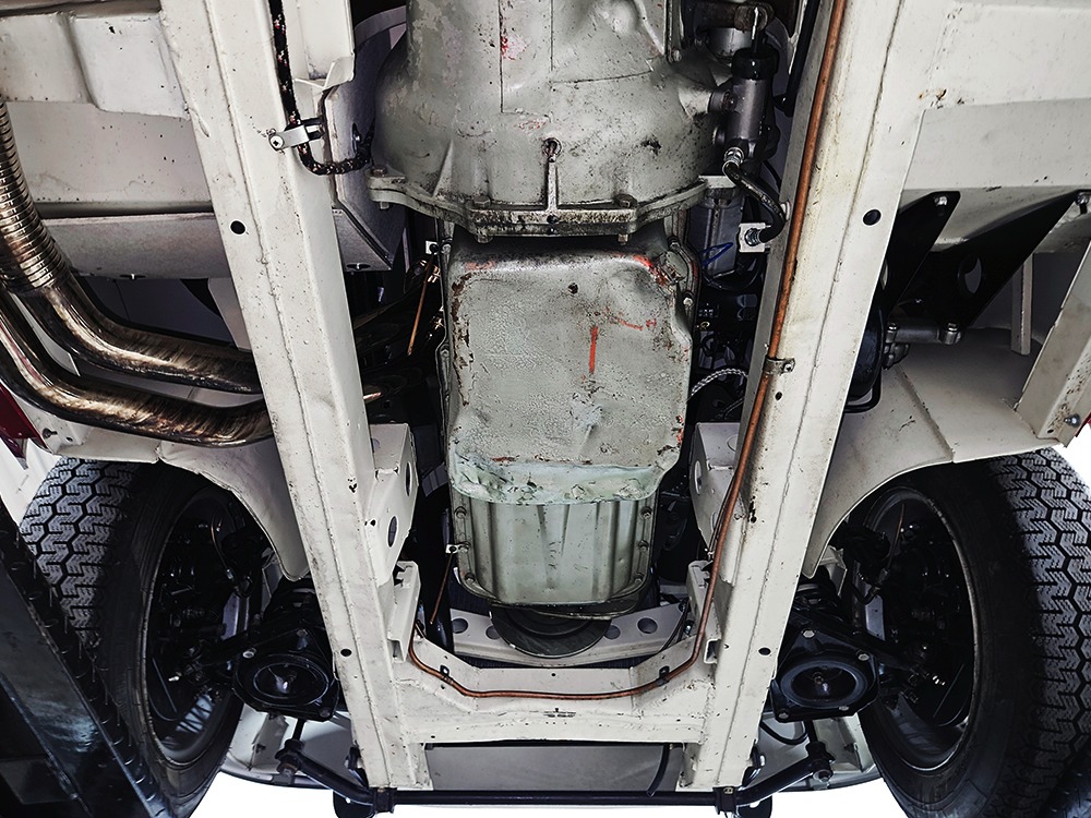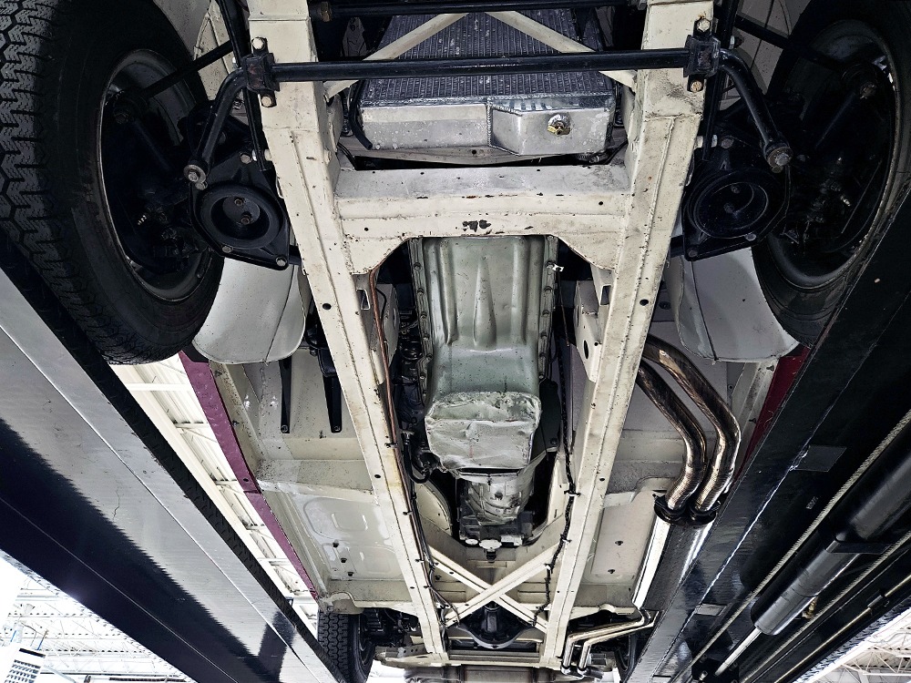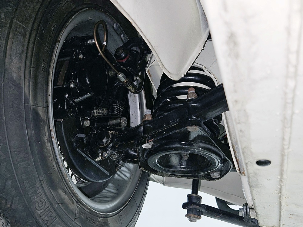 The reason the 3000 is special, however, resides under the hood: a 2912 cc inline-6 that is a big step up from the unit found in the 100-6. Smoother, torquier, and just as willing to rev, it turned the big Healey into a genuinely fast car for the era. The engine was fully rebuilt to stock specs and still inhales through a pair of SU carburetors. The engine bay is correctly detailed with Austin Green paint on the engine itself, proper fittings and copper lines, and a new fabric-covered wiring harness as well as a giant aluminum radiator to keep it cool on the hottest days. It starts easily with a little choke and settles into a burbling idle that almost feels like the car is impatient and ready to go. On the road, the exhaust note is epic and there’s torque available all over the tach, which was surely the goal with the upgraded engine. The 4-speed shifts cleanly and as I mentioned, the overdrive turns it into a comfortable cruiser on today’s highways. The exhaust system is stainless, and you can see the results of the frame-off restoration throughout the undercarriage, which is still extremely clean. It brakes confidently, steers crisply, and rides surprisingly well given its primitive suspension setup. Painted wire wheels are the perfect finishing touch, and they carry 16SR15 Michelin radials that look right and handle great.