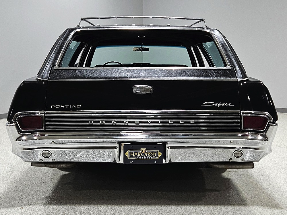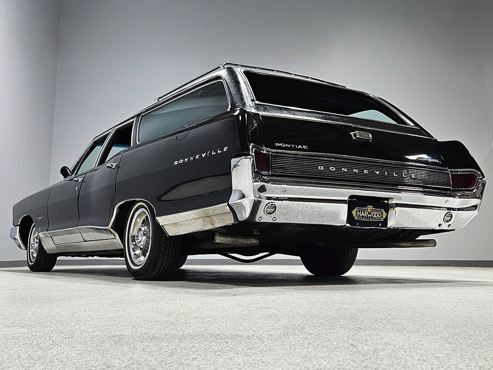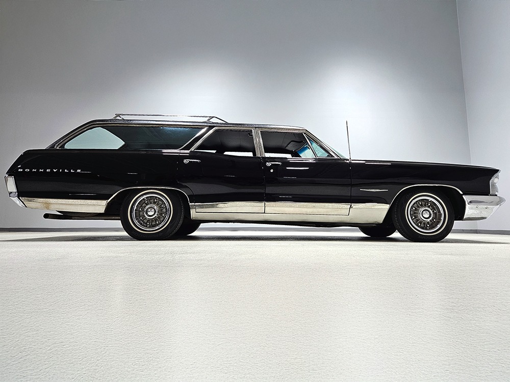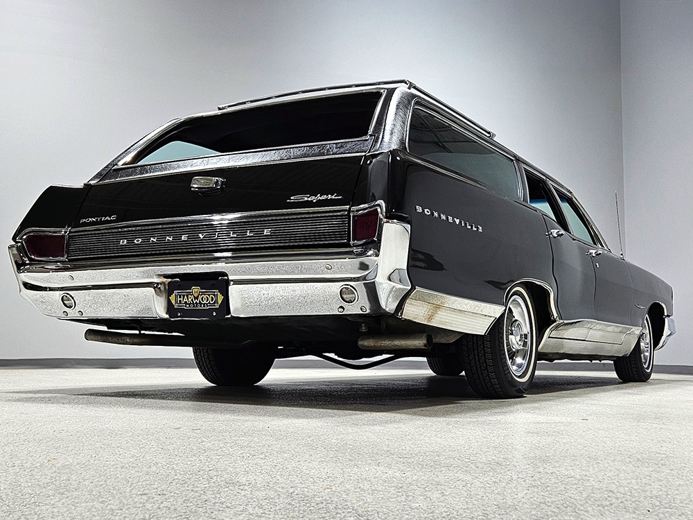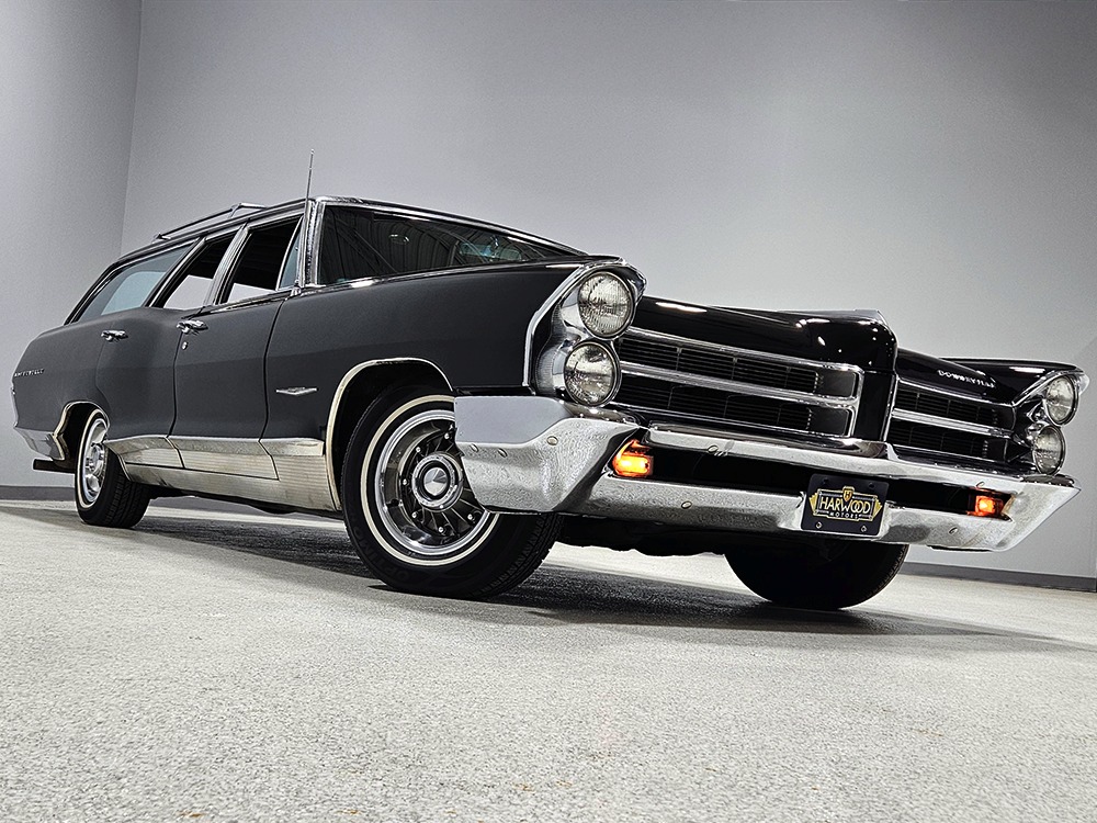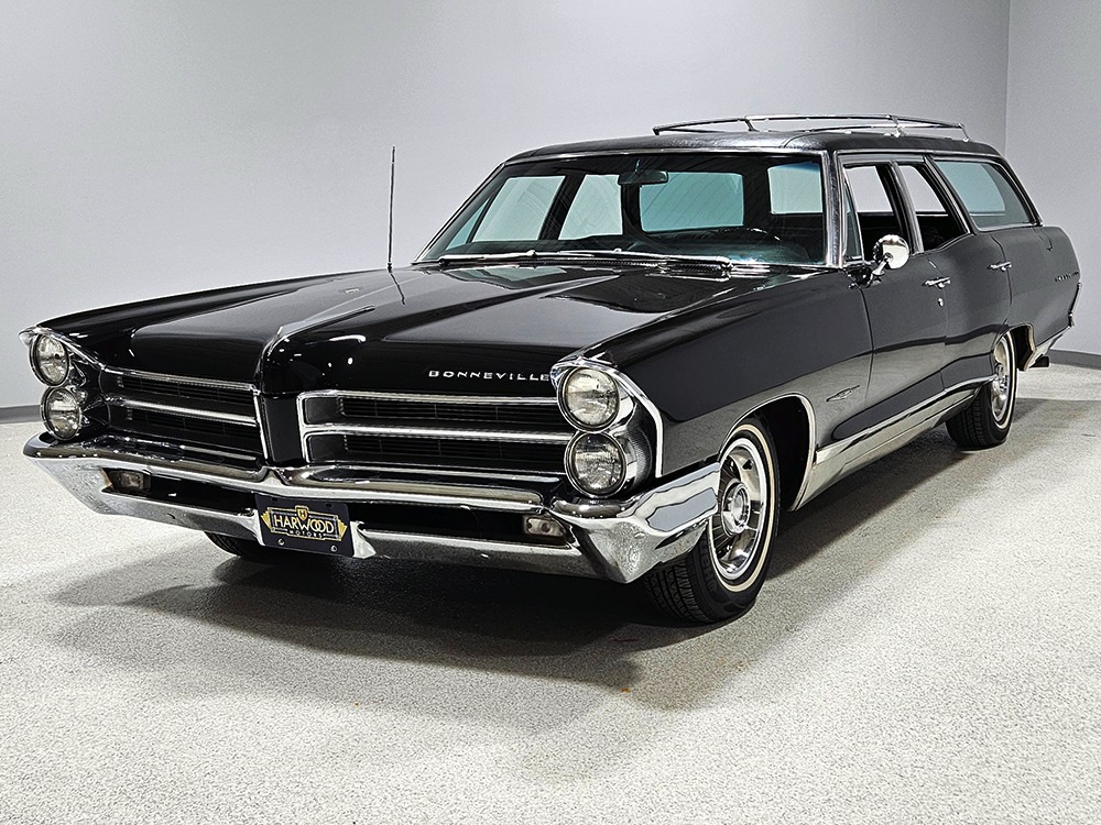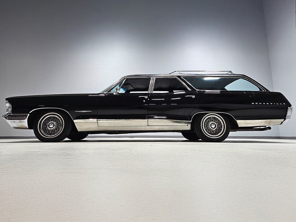Exceptional Pontiac Bonneville wagon. Fantastic triple black, rare vinyl top, three rows of seats, working factory A/C, 8-lug wheels. 389 cubic inch V8 runs and drives superbly. The pinnacle of style and luxury in 1965!