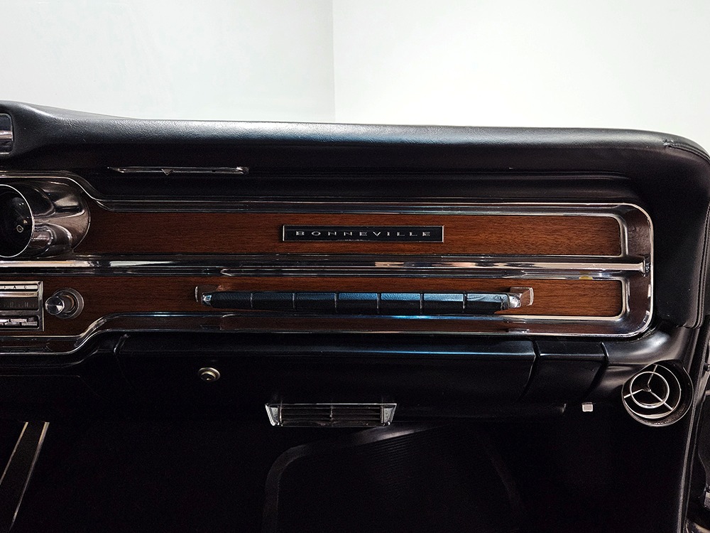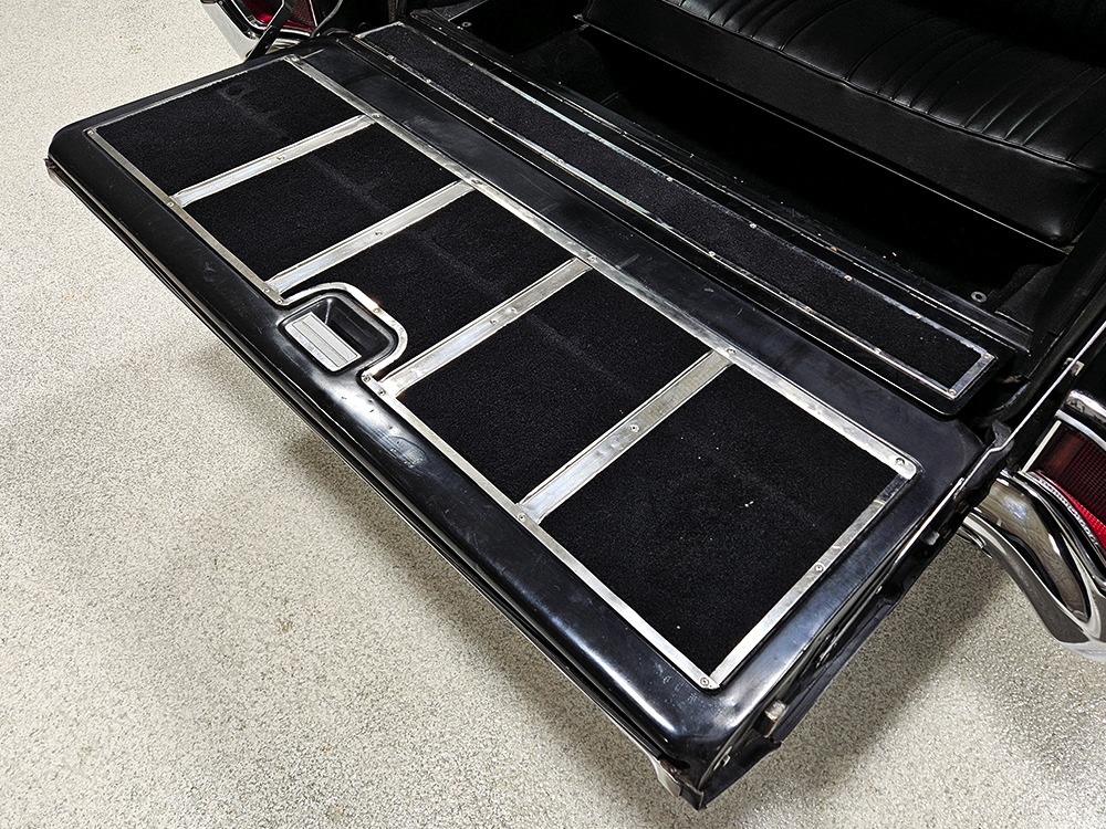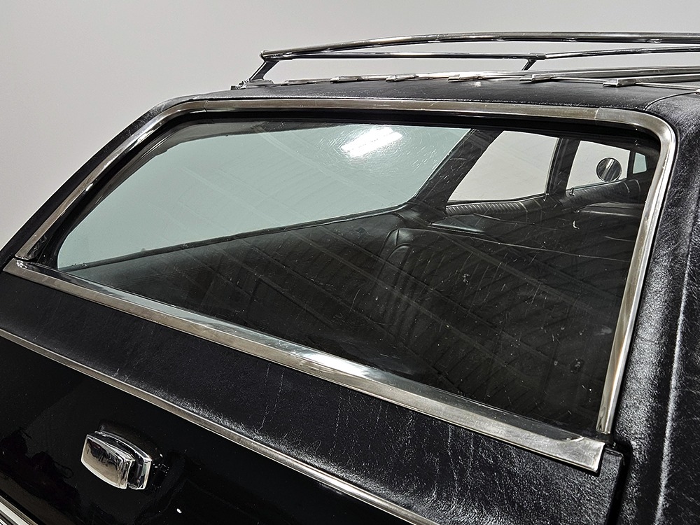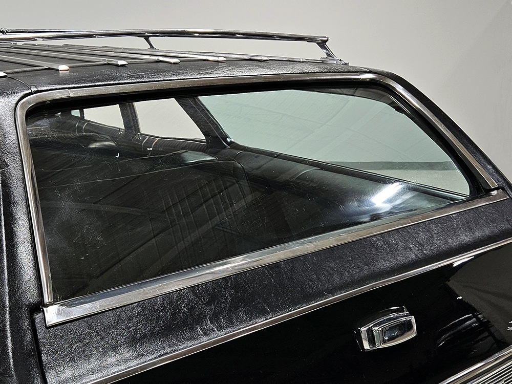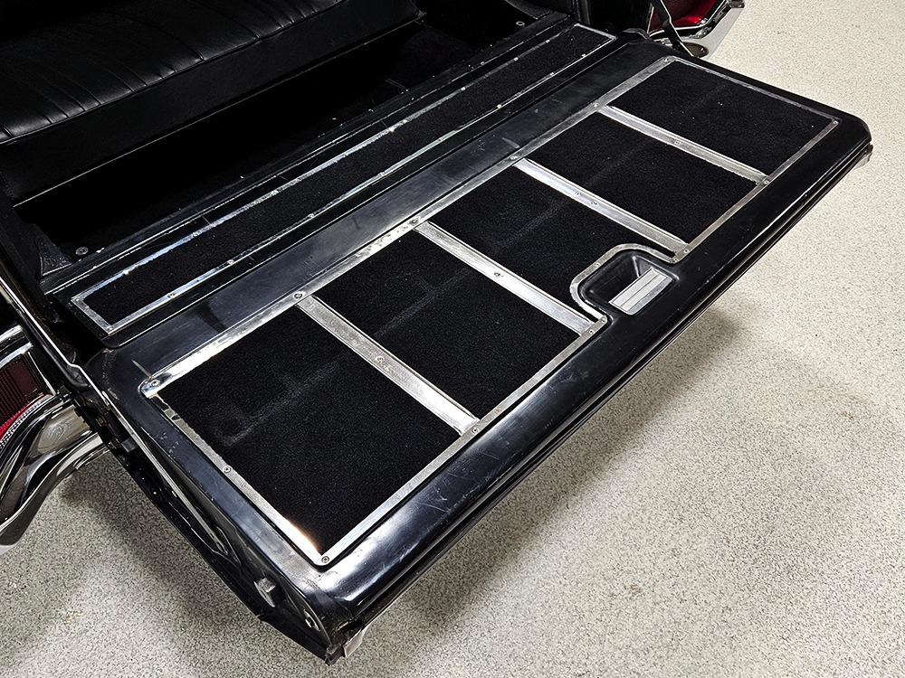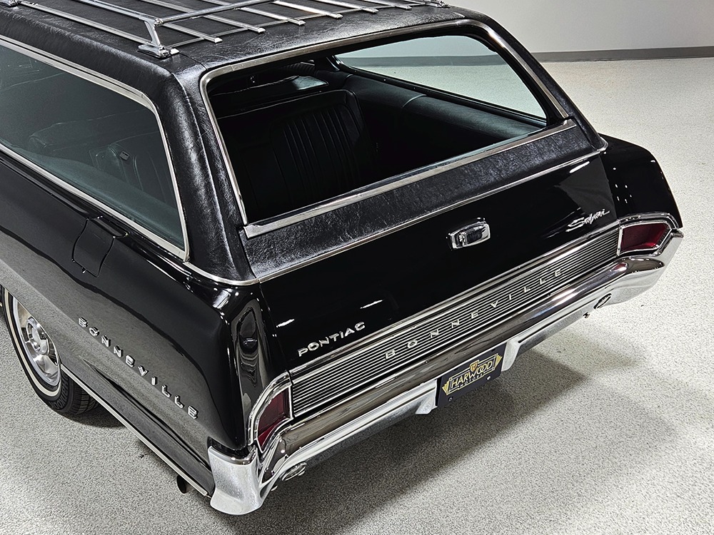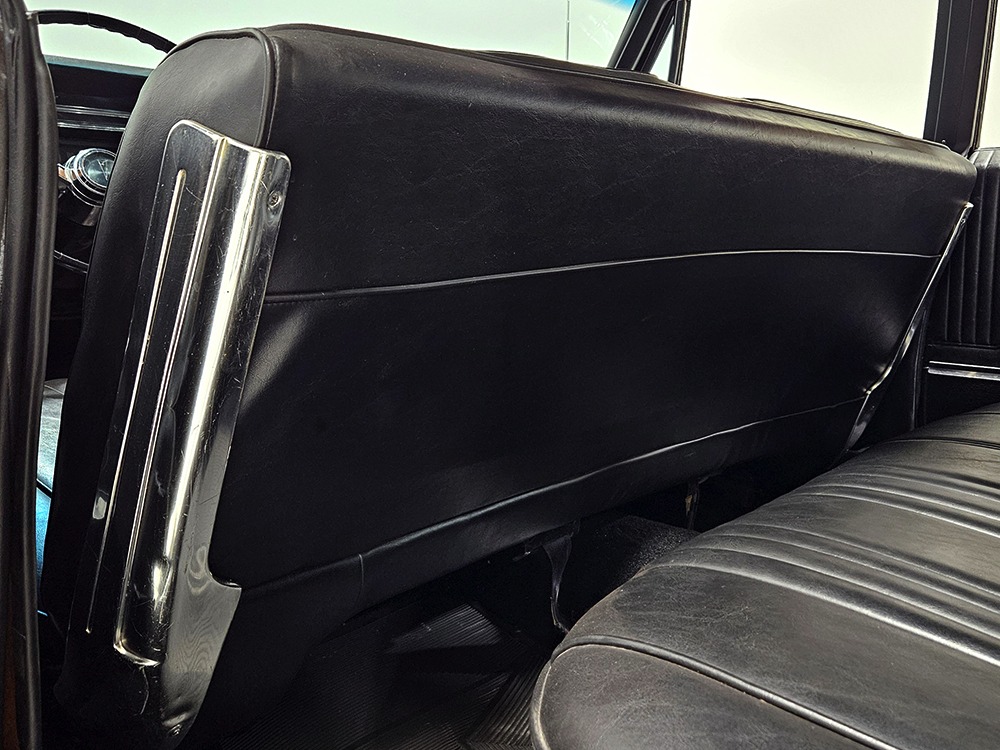 The beautiful black interior is more evidence of Pontiac’s high-style attitude. Three rows of bench seats make this a 9-passenger wagon, with the back seat facing rearward and able to stow itself under the cargo floor. Woodgrained appliques on the dash warm things up a bit, and if you’ve driven a GTO, sliding behind the wheel of this Bonneville might feel familiar. Everything works except the clock, and that means cold A/C and a working AM radio, although the sound of the 389 cubic inch V8 under the hood might be more entertaining. The seats, door panels, and carpets are in excellent condition with minimal wear, and thanks to lots of sound-deadening materials, it’s hushed inside on the highway. The massive headliner is also in fantastic condition with no rips, tears, or sagging, and all the glass is clear with no cracks or delamination. This is a really nice car!