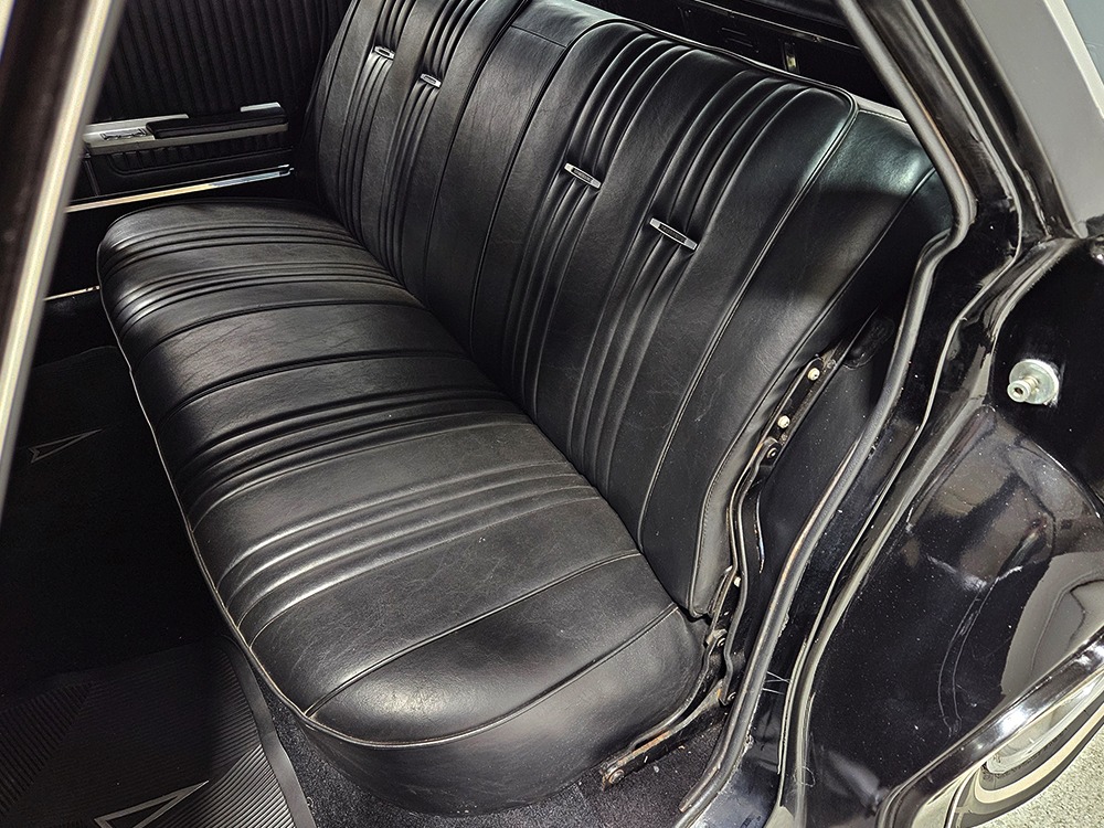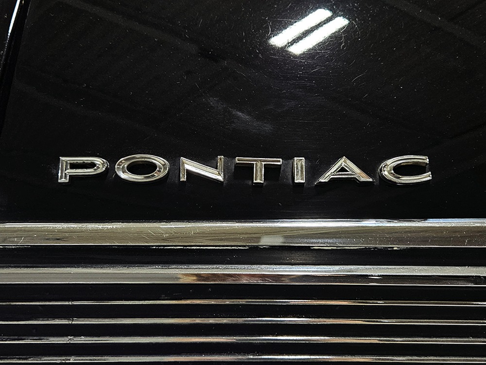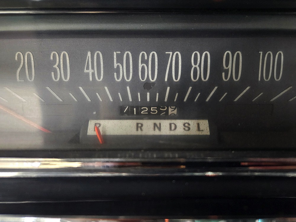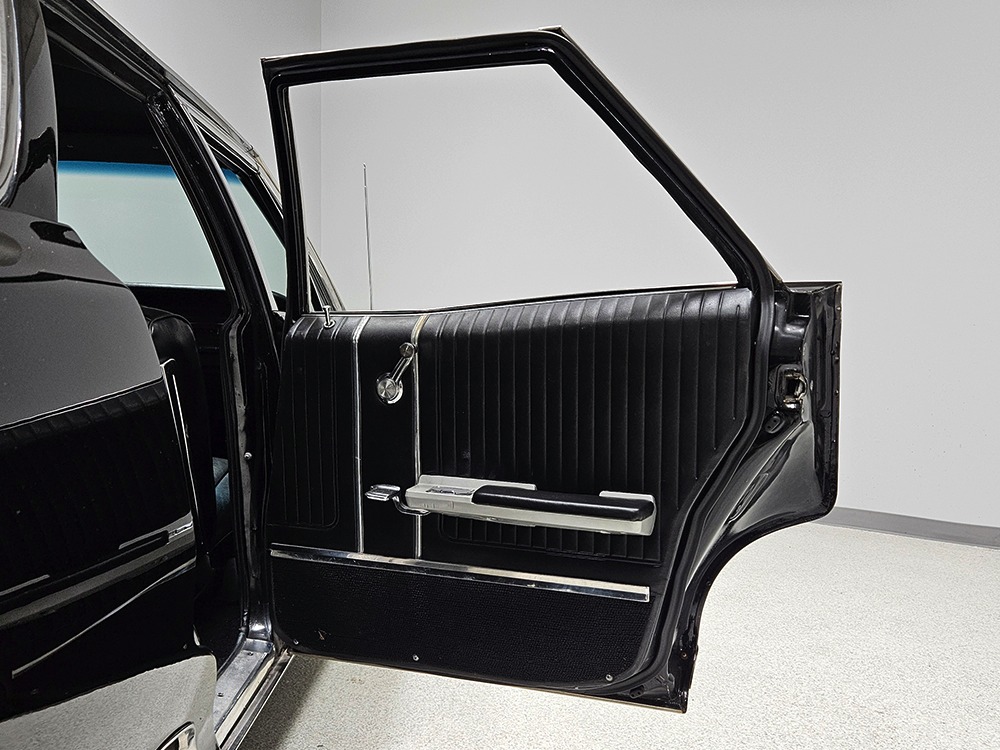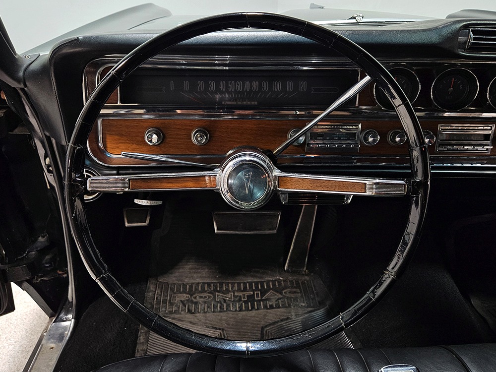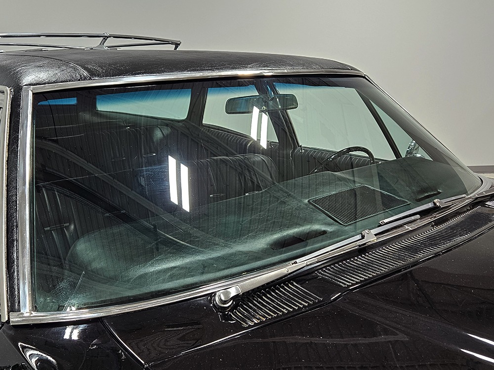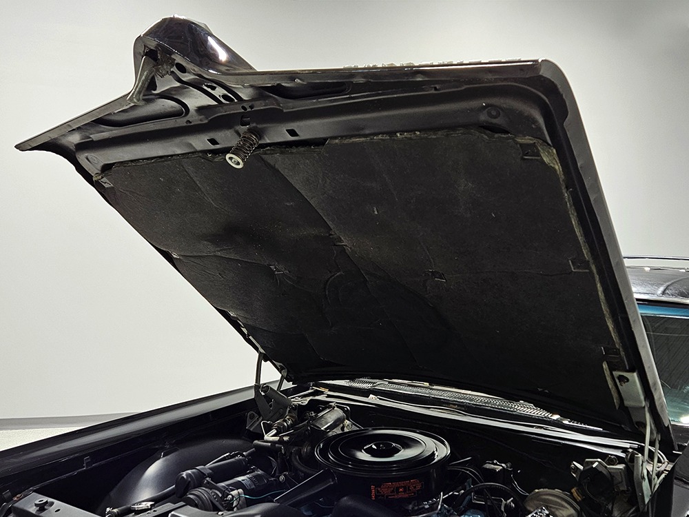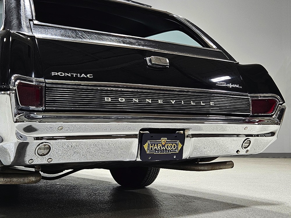 The beautiful black interior is more evidence of Pontiac’s high-style attitude. Three rows of bench seats make this a 9-passenger wagon, with the back seat facing rearward and able to stow itself under the cargo floor. Woodgrained appliques on the dash warm things up a bit, and if you’ve driven a GTO, sliding behind the wheel of this Bonneville might feel familiar. Everything works except the clock, and that means cold A/C and a working AM radio, although the sound of the 389 cubic inch V8 under the hood might be more entertaining. The seats, door panels, and carpets are in excellent condition with minimal wear, and thanks to lots of sound-deadening materials, it’s hushed inside on the highway. The massive headliner is also in fantastic condition with no rips, tears, or sagging, and all the glass is clear with no cracks or delamination. This is a really nice car!