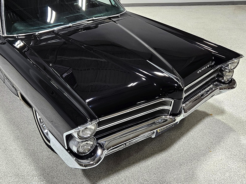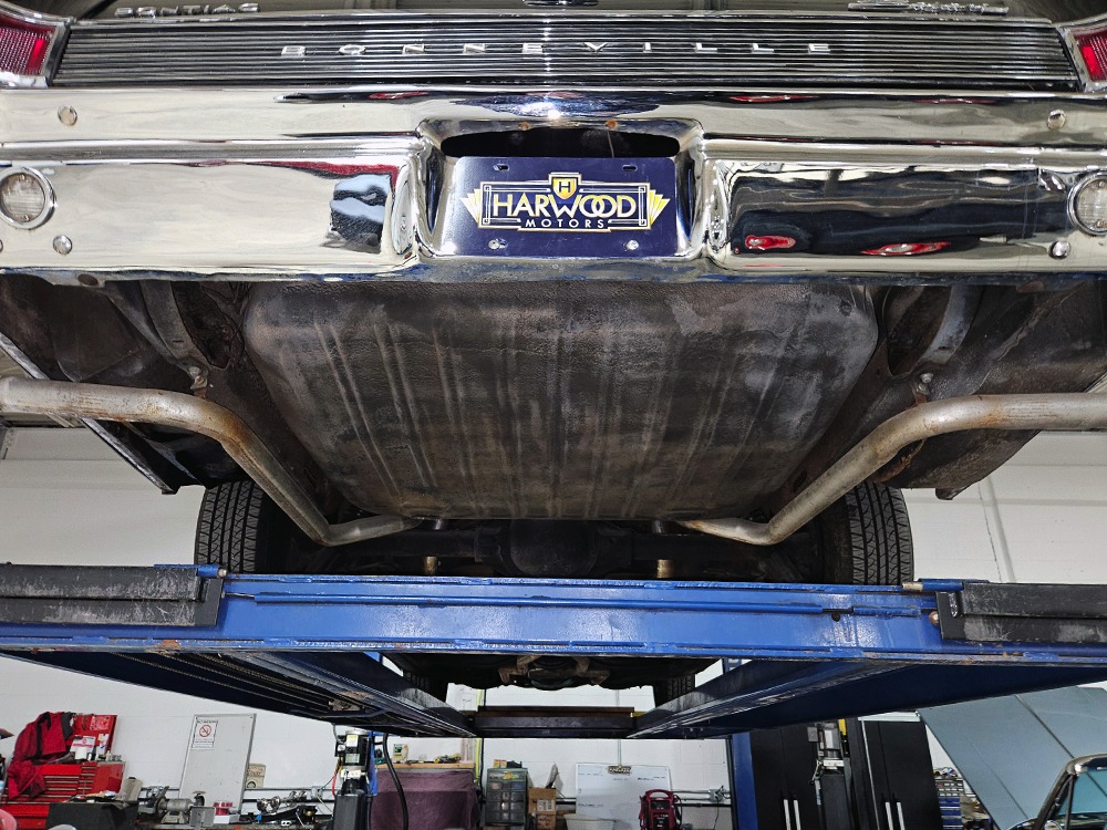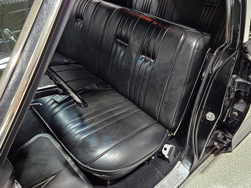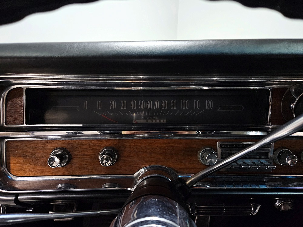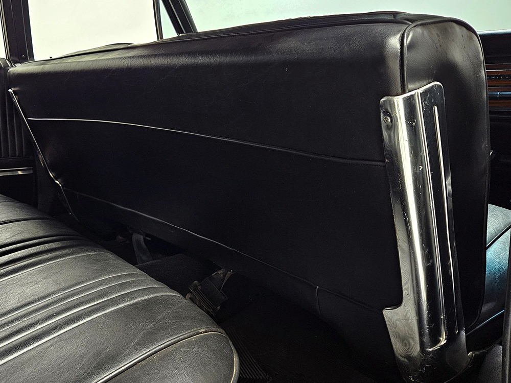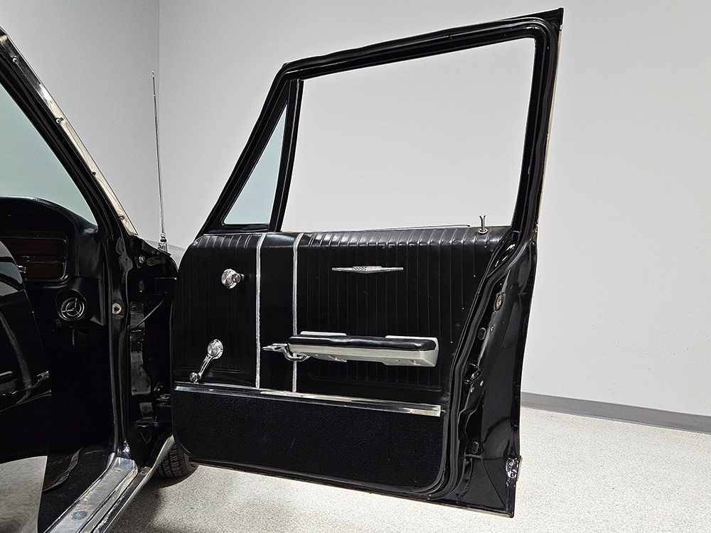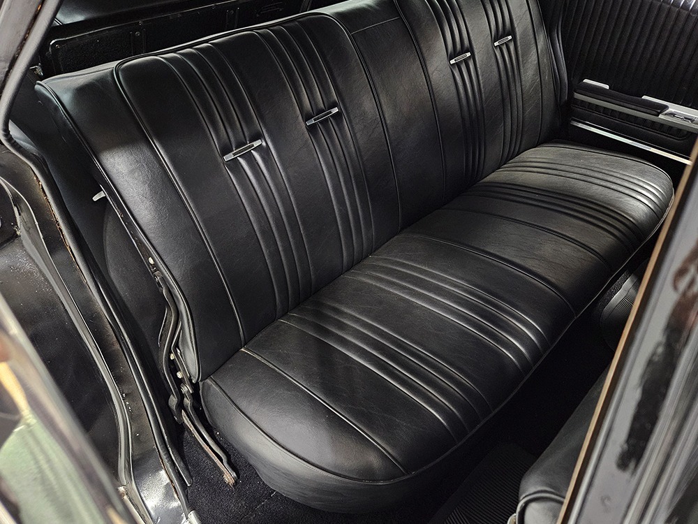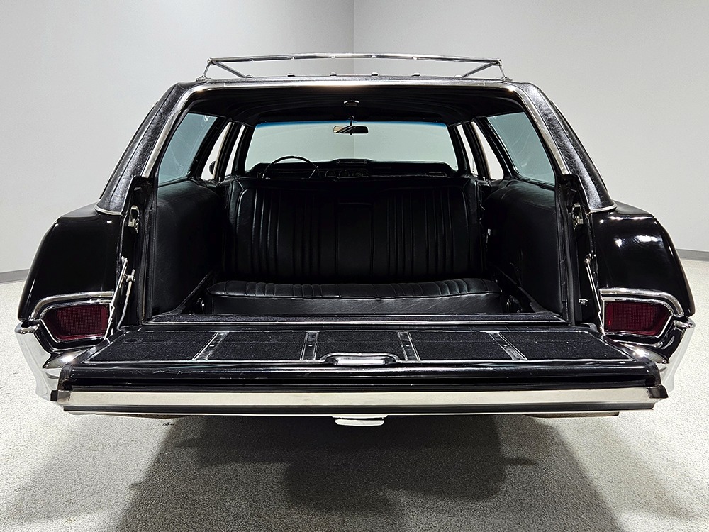 The beautiful black interior is more evidence of Pontiac’s high-style attitude. Three rows of bench seats make this a 9-passenger wagon, with the back seat facing rearward and able to stow itself under the cargo floor. Woodgrained appliques on the dash warm things up a bit, and if you’ve driven a GTO, sliding behind the wheel of this Bonneville might feel familiar. Everything works except the clock, and that means cold A/C and a working AM radio, although the sound of the 389 cubic inch V8 under the hood might be more entertaining. The seats, door panels, and carpets are in excellent condition with minimal wear, and thanks to lots of sound-deadening materials, it’s hushed inside on the highway. The massive headliner is also in fantastic condition with no rips, tears, or sagging, and all the glass is clear with no cracks or delamination. This is a really nice car!