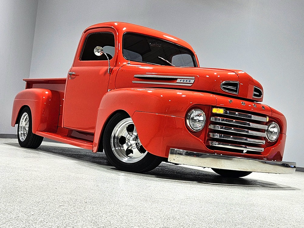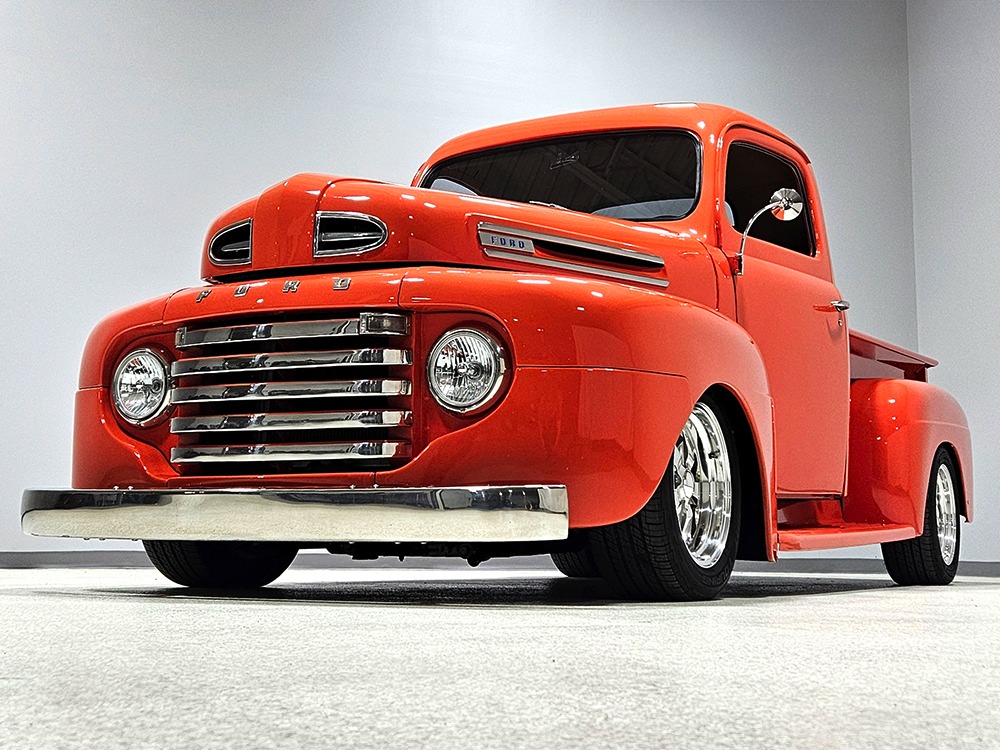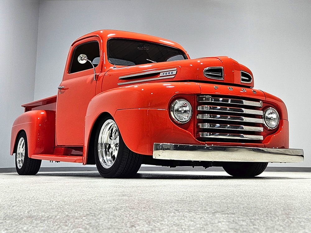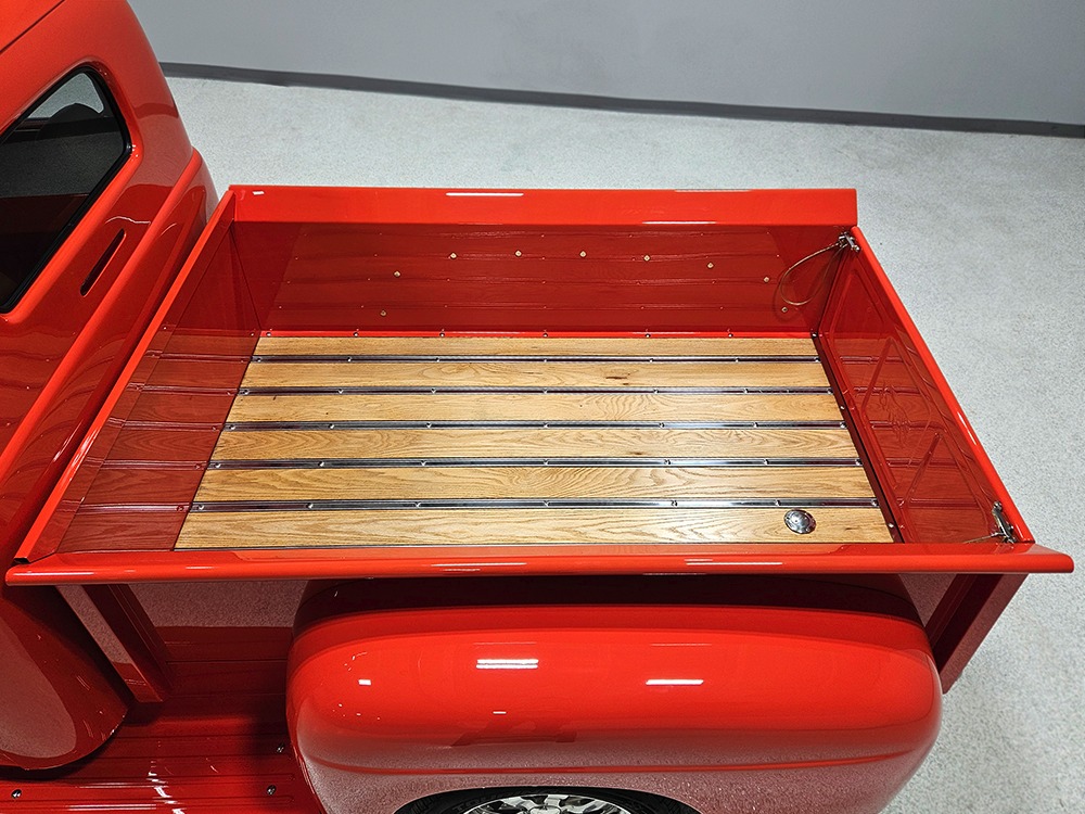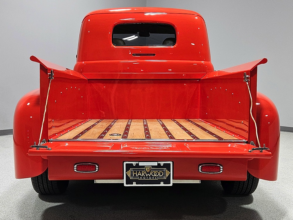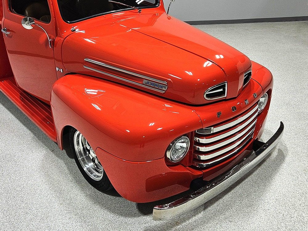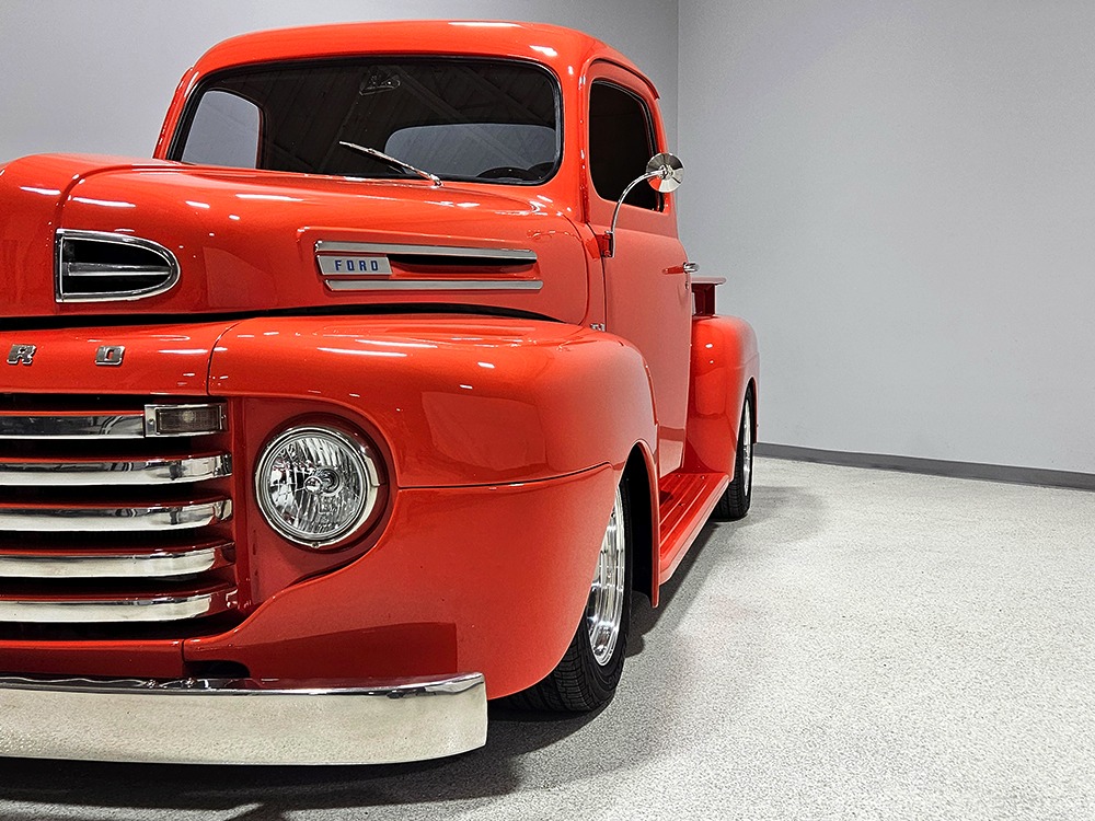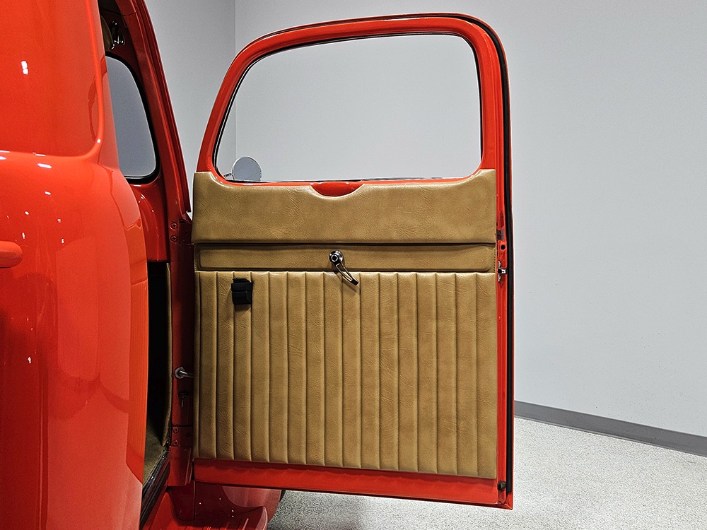 For reasons we don’t quite understand, Ford pickups of this era seem to lag behind their Chevy counterparts in terms of value. That’s good news for you, however, because this slick 1949 Ford F-1 pickup offers a lot of truck for the money. Nicely finished in what Ford fans might call Calypso Coral and GM guys could call Hugger Orange, it’s definitely not subtle. But the build itself doesn’t go over-the-top, resulting in a super clean truck that looks right, works right, and feels right. The cab, hood, and bed are steel, while the fenders are fiberglass, but you can’t tell without rapping your knuckles against it and the paint is really nicely done. There’s a deep gloss, great panel alignment, and someone clearly spent lots of time in the block sanding phase to get it as straight and wave-free as it is. Everything just fits together like it should and the doors close without the need for a hard slam. That’s not always easy to do. The chrome details look like new, including the grille, simple bumpers, and all the Ford stainless trim that really makes the truck sparkle. The bed itself is lined with freshly varnished oak planks, and you’ll note the gas filler cap is built into the bed floor. We especially like that they didn’t over-dress it with graphics or pinstripes that would make it look dated, so this cool little pickup will look awesome for years to come.