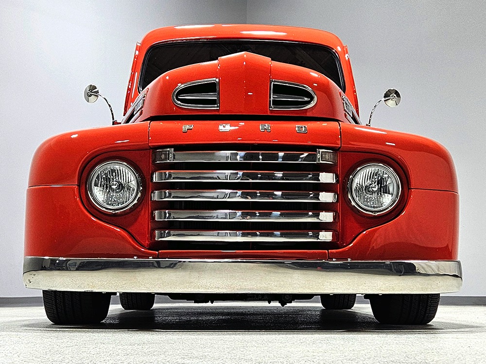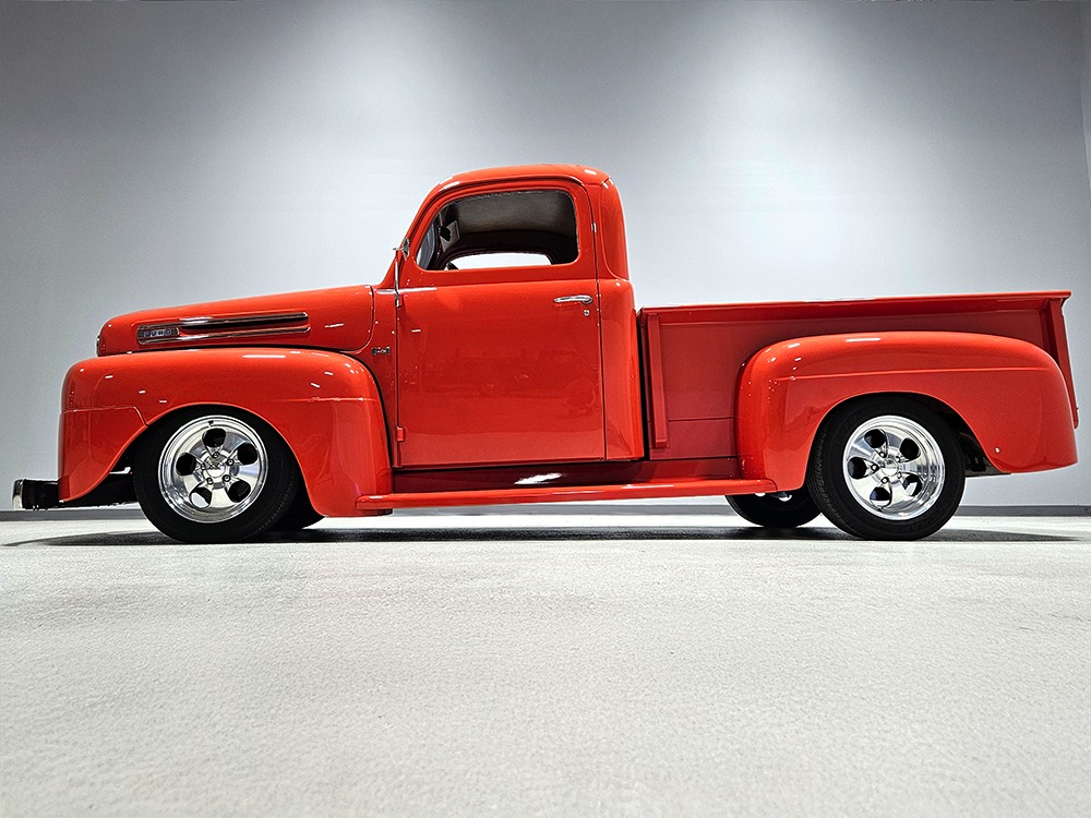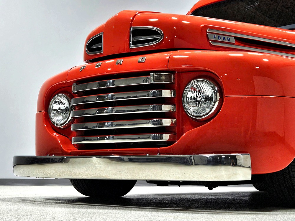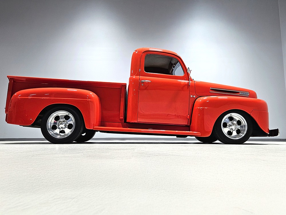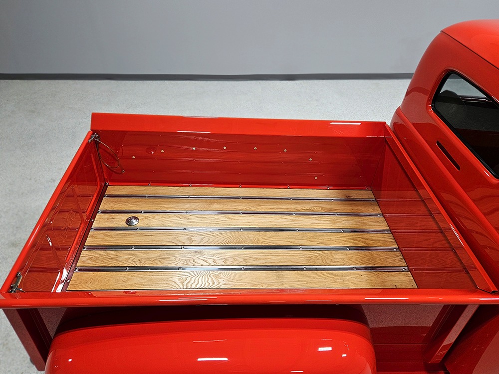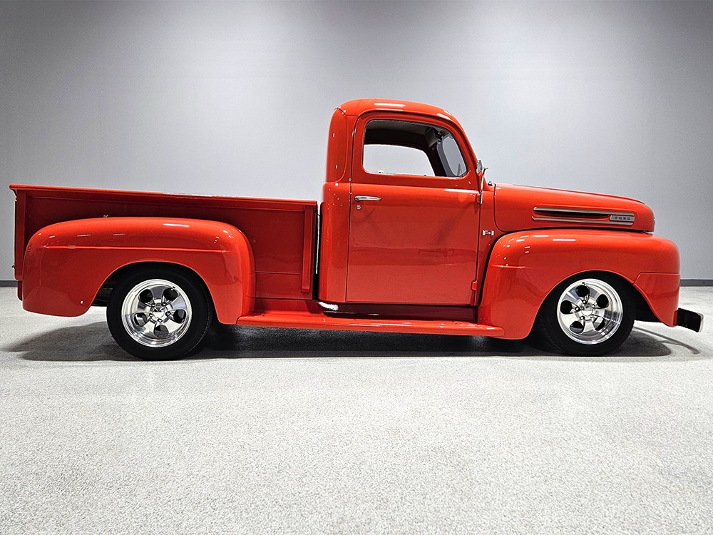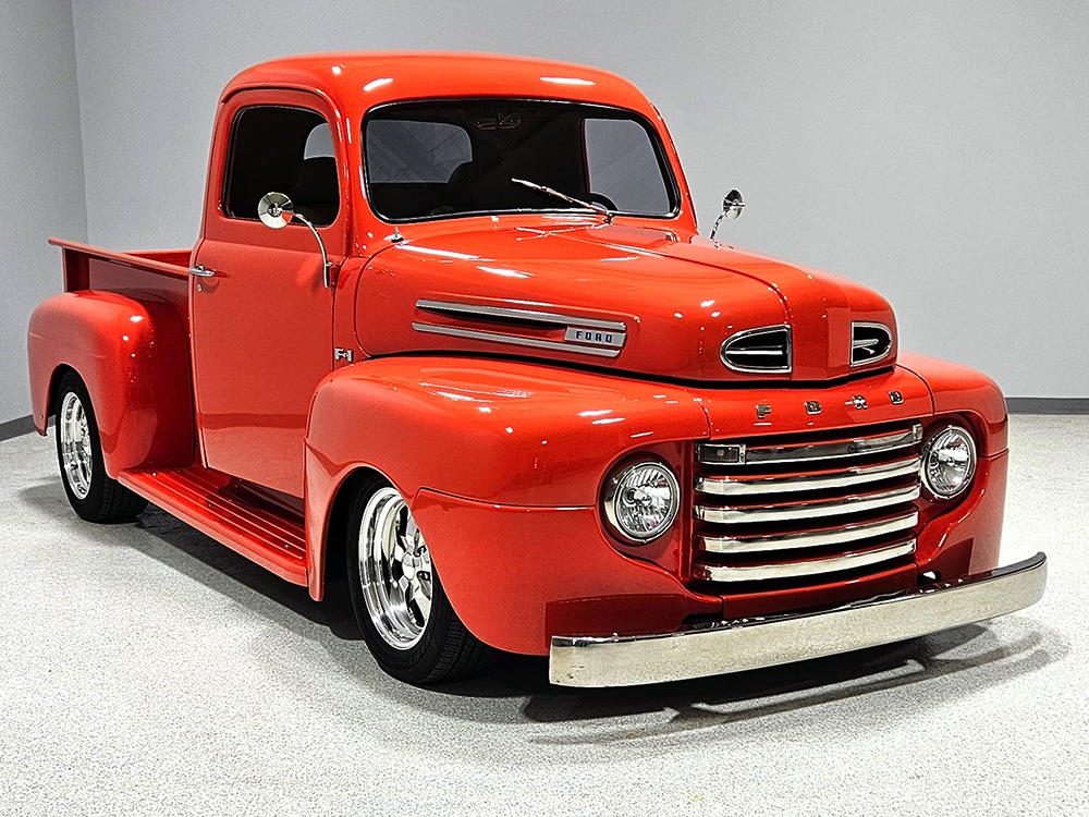 For reasons we don’t quite understand, Ford pickups of this era seem to lag behind their Chevy counterparts in terms of value. That’s good news for you, however, because this slick 1949 Ford F-1 pickup offers a lot of truck for the money. Nicely finished in what Ford fans might call Calypso Coral and GM guys could call Hugger Orange, it’s definitely not subtle. But the build itself doesn’t go over-the-top, resulting in a super clean truck that looks right, works right, and feels right. The cab, hood, and bed are steel, while the fenders are fiberglass, but you can’t tell without rapping your knuckles against it and the paint is really nicely done. There’s a deep gloss, great panel alignment, and someone clearly spent lots of time in the block sanding phase to get it as straight and wave-free as it is. Everything just fits together like it should and the doors close without the need for a hard slam. That’s not always easy to do. The chrome details look like new, including the grille, simple bumpers, and all the Ford stainless trim that really makes the truck sparkle. The bed itself is lined with freshly varnished oak planks, and you’ll note the gas filler cap is built into the bed floor. We especially like that they didn’t over-dress it with graphics or pinstripes that would make it look dated, so this cool little pickup will look awesome for years to come.