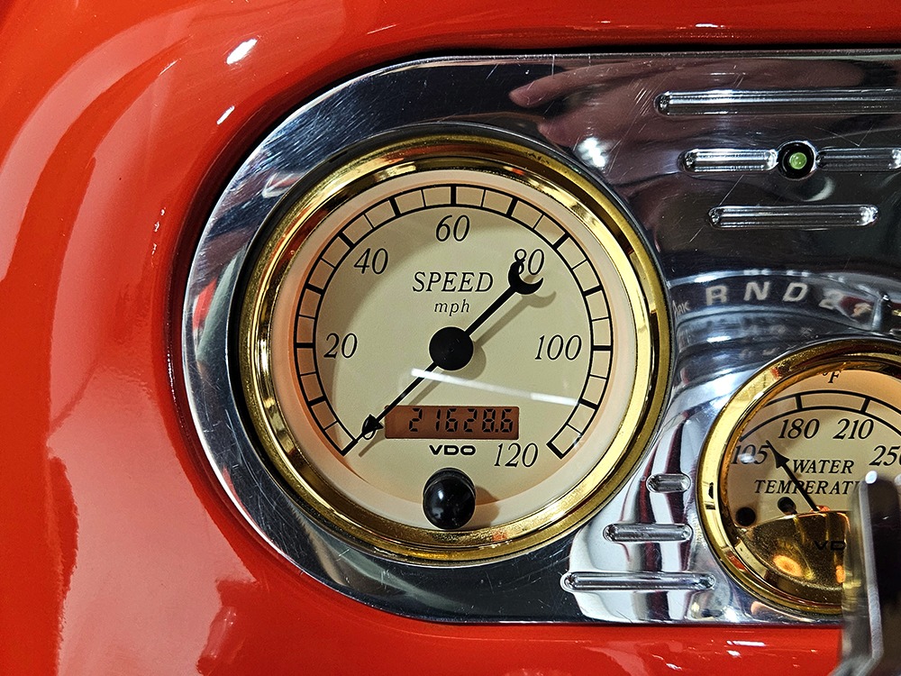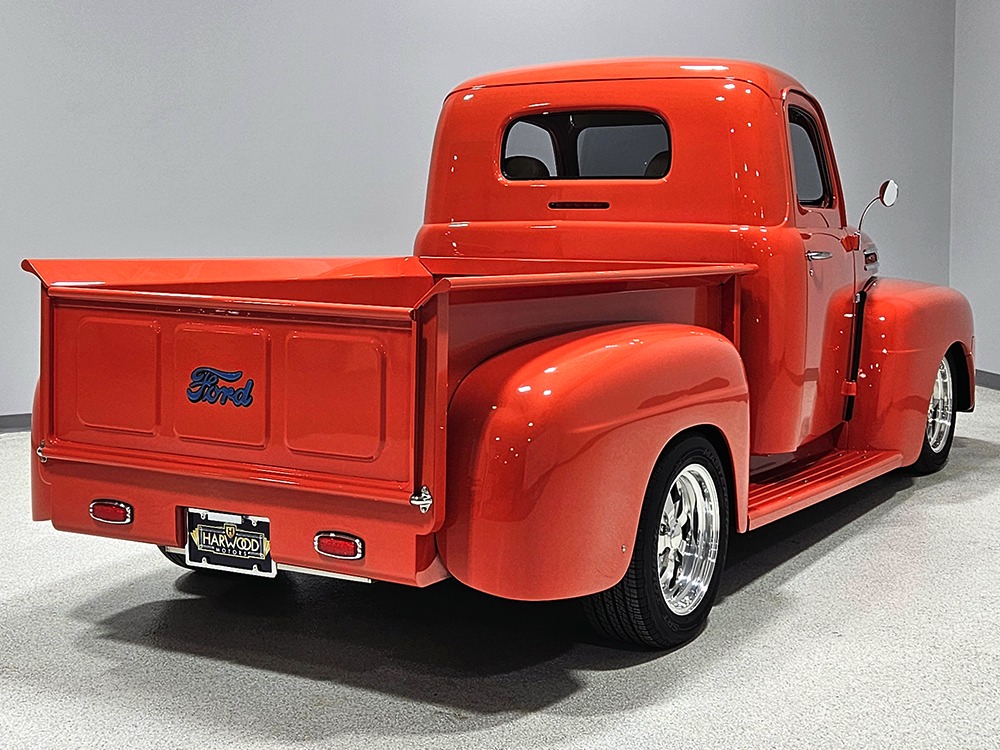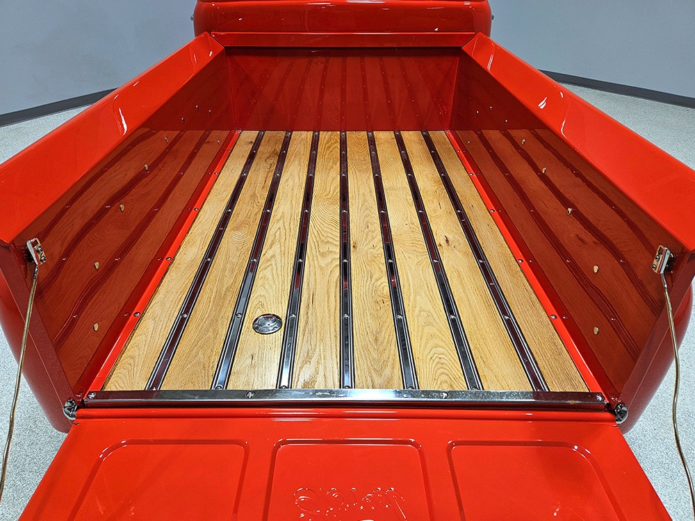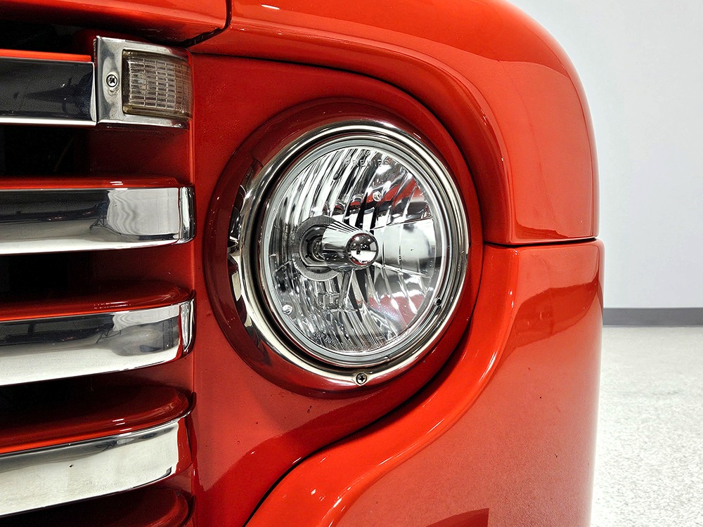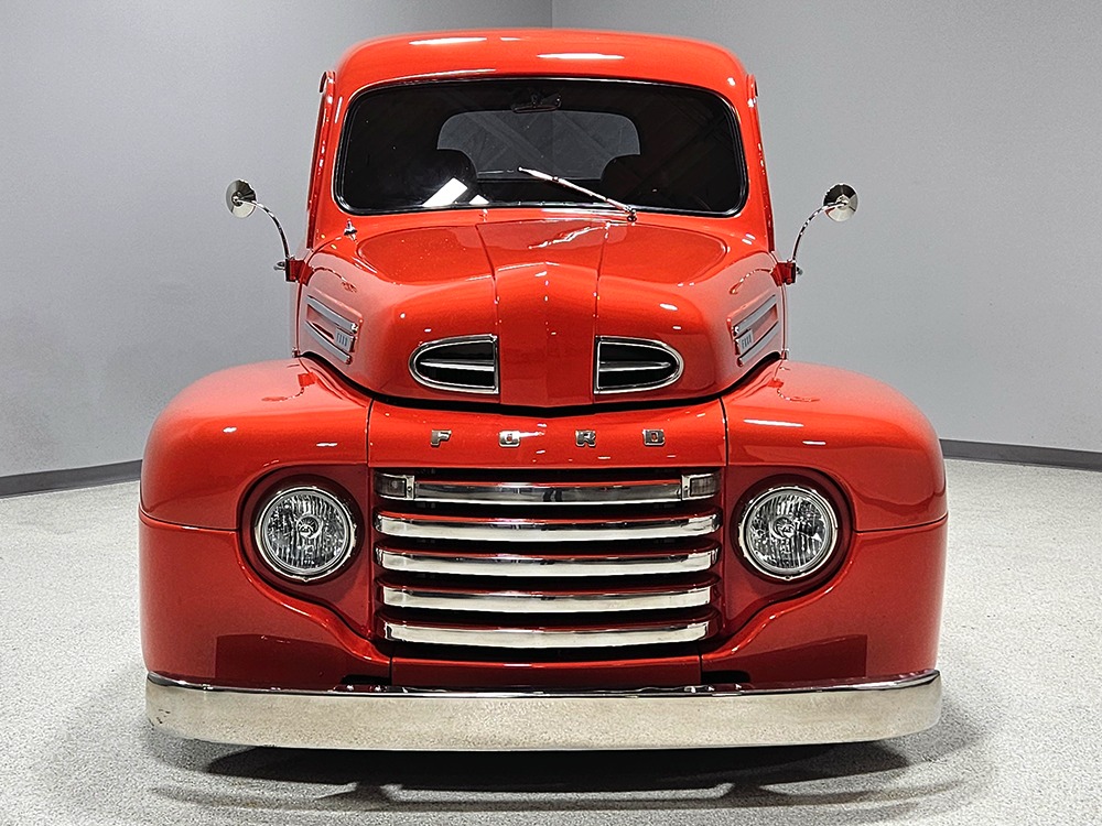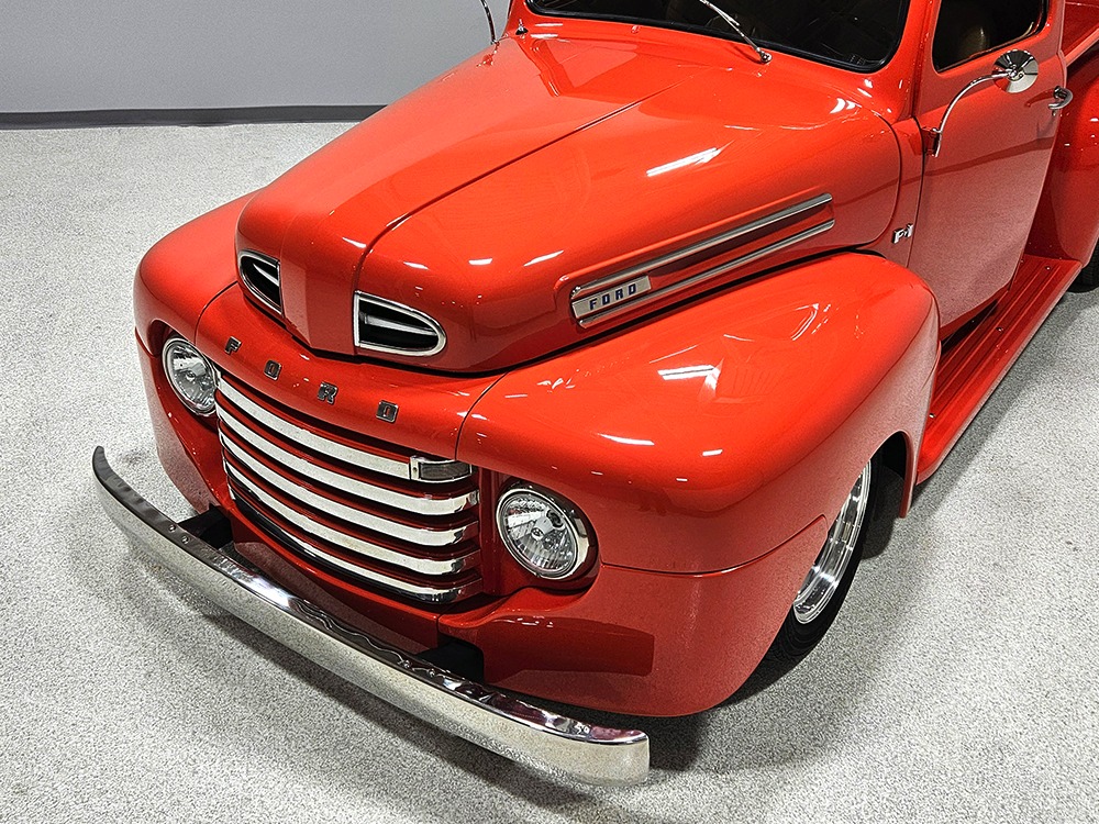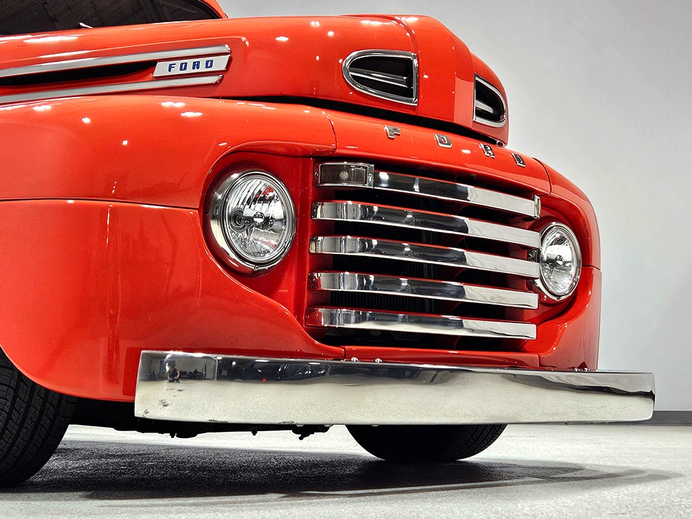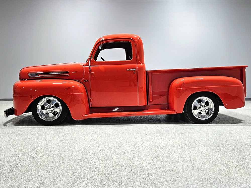 For reasons we don’t quite understand, Ford pickups of this era seem to lag behind their Chevy counterparts in terms of value. That’s good news for you, however, because this slick 1949 Ford F-1 pickup offers a lot of truck for the money. Nicely finished in what Ford fans might call Calypso Coral and GM guys could call Hugger Orange, it’s definitely not subtle. But the build itself doesn’t go over-the-top, resulting in a super clean truck that looks right, works right, and feels right. The cab, hood, and bed are steel, while the fenders are fiberglass, but you can’t tell without rapping your knuckles against it and the paint is really nicely done. There’s a deep gloss, great panel alignment, and someone clearly spent lots of time in the block sanding phase to get it as straight and wave-free as it is. Everything just fits together like it should and the doors close without the need for a hard slam. That’s not always easy to do. The chrome details look like new, including the grille, simple bumpers, and all the Ford stainless trim that really makes the truck sparkle. The bed itself is lined with freshly varnished oak planks, and you’ll note the gas filler cap is built into the bed floor. We especially like that they didn’t over-dress it with graphics or pinstripes that would make it look dated, so this cool little pickup will look awesome for years to come.