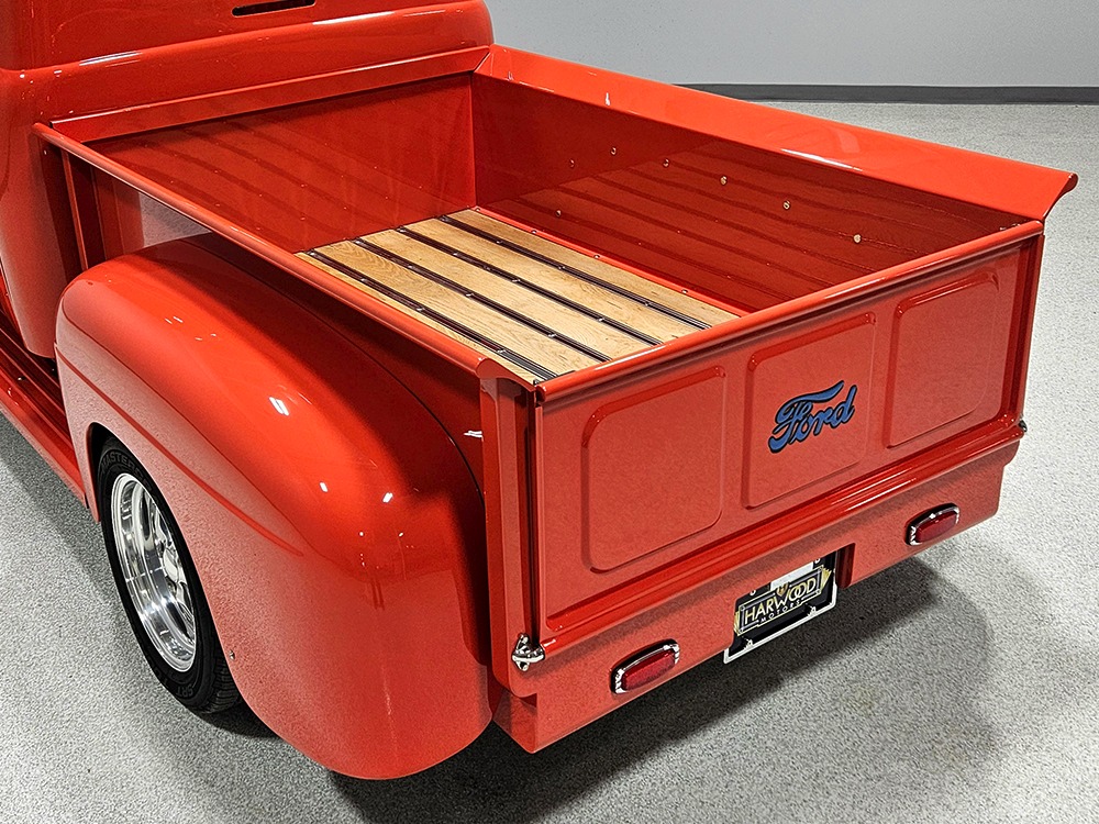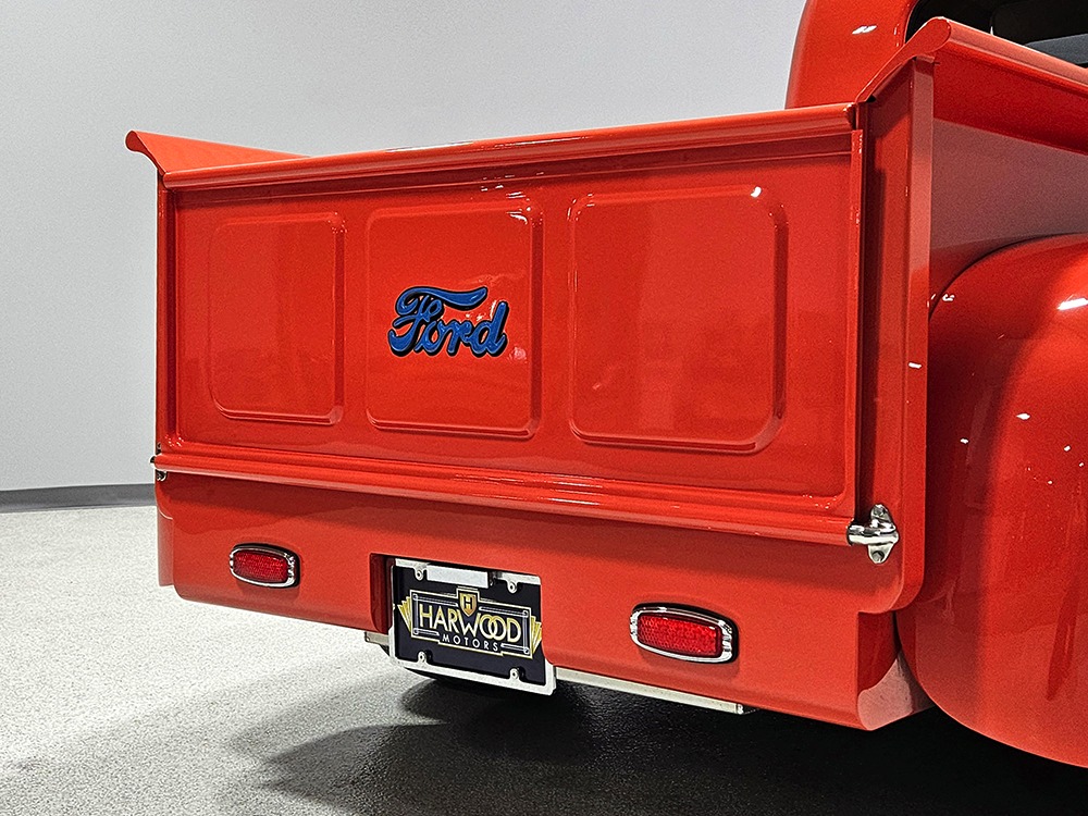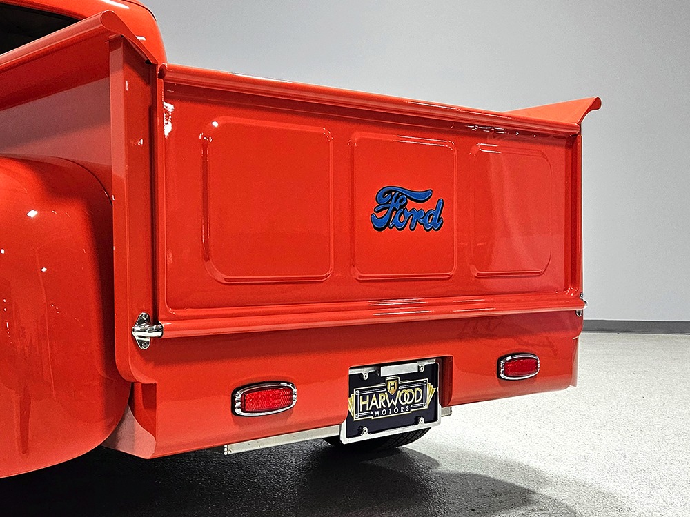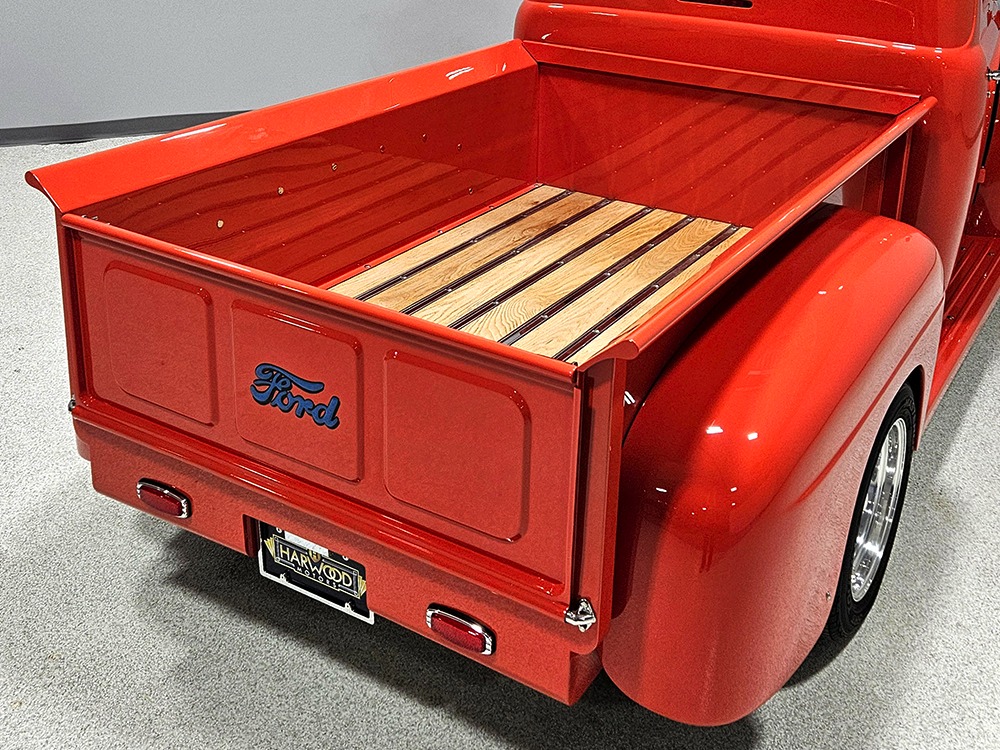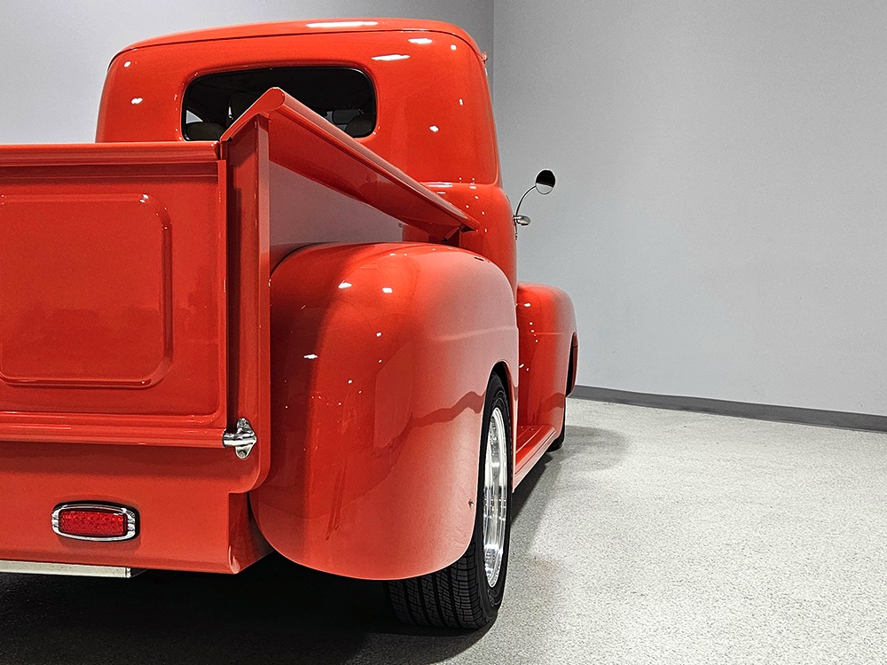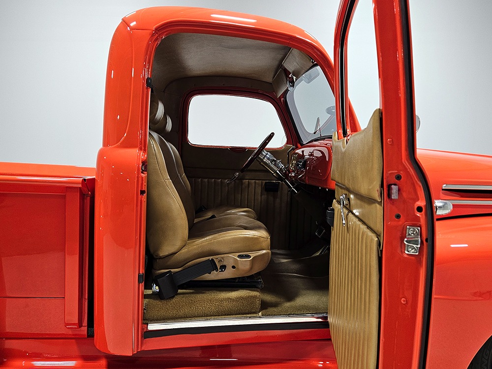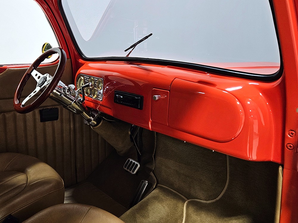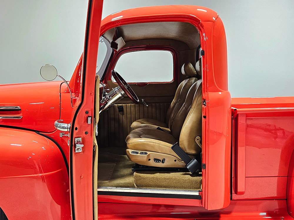 The tan interior is anchored by a pair of leather power bucket seats from a late-model, and everything else inside was tailored to match. Nice plush carpets with nicely stitched binding, custom door panels, and a beautiful headliner make this F-1 feel a lot more finished than many of its siblings. There’s a wood steering wheel on a chrome tilt steering column, so it’s easy to get comfortable, and the original dash was smoothed and painted to match the bodywork. A custom insert matches the shape of the factory gauges and includes all the necessary dials to monitor the engine, plus indicators for the turn signals and high-beams. Secondary controls are lower on the dash and a modern Pioneer AM/FM/CD/MP3 stereo head unit was neatly installed in the center. Other niceties include power windows, billet aluminum pedals, and a single windshield wiper, just for style points. Seat belts were also installed for safety.