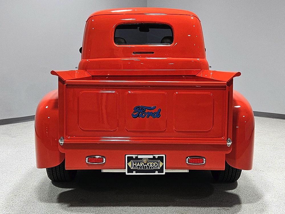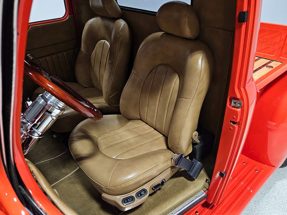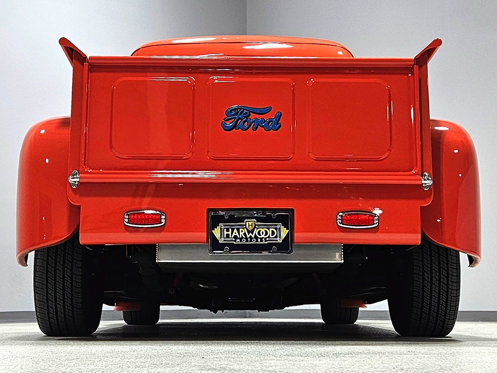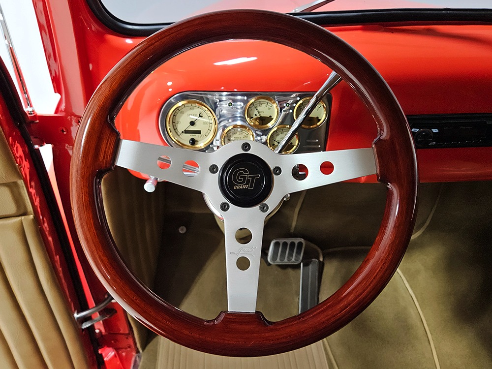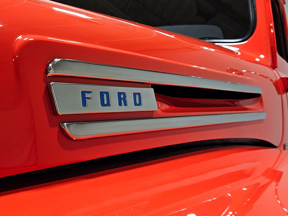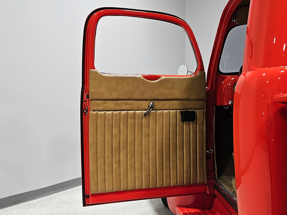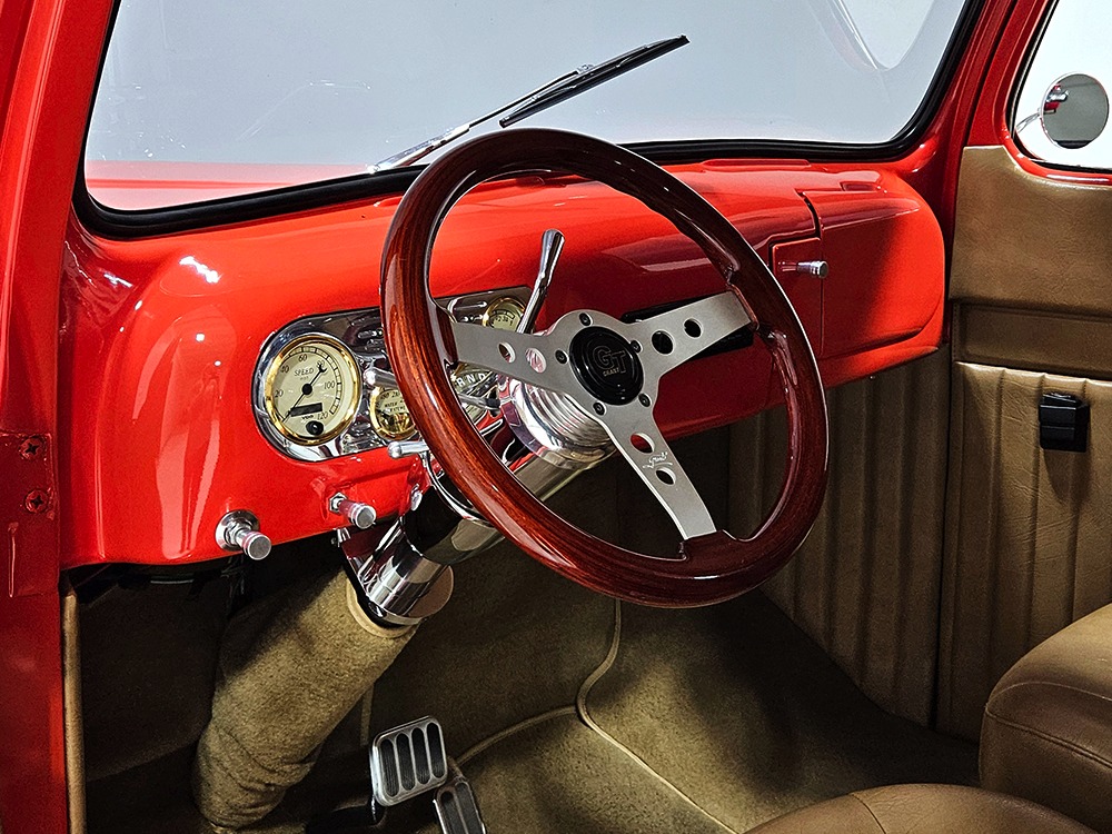 The tan interior is anchored by a pair of leather power bucket seats from a late-model, and everything else inside was tailored to match. Nice plush carpets with nicely stitched binding, custom door panels, and a beautiful headliner make this F-1 feel a lot more finished than many of its siblings. There’s a wood steering wheel on a chrome tilt steering column, so it’s easy to get comfortable, and the original dash was smoothed and painted to match the bodywork. A custom insert matches the shape of the factory gauges and includes all the necessary dials to monitor the engine, plus indicators for the turn signals and high-beams. Secondary controls are lower on the dash and a modern Pioneer AM/FM/CD/MP3 stereo head unit was neatly installed in the center. Other niceties include power windows, billet aluminum pedals, and a single windshield wiper, just for style points. Seat belts were also installed for safety.