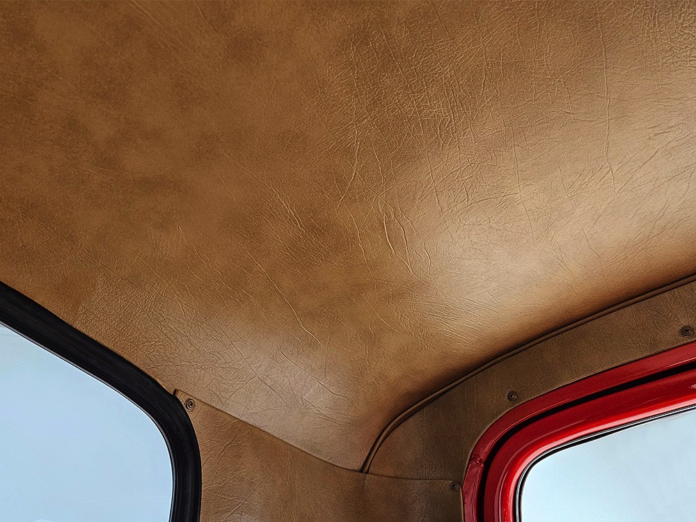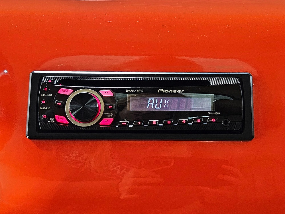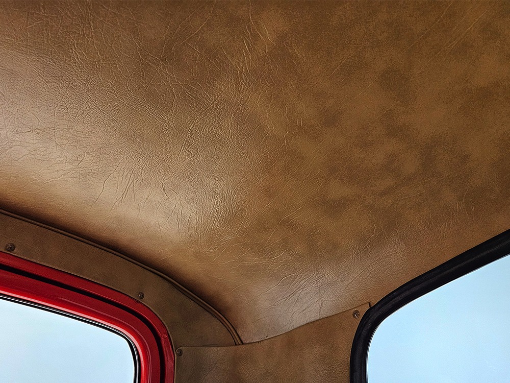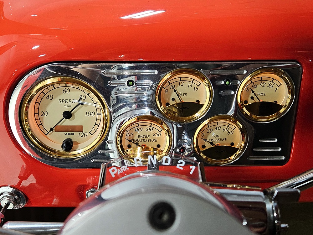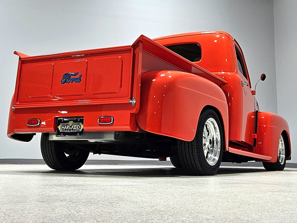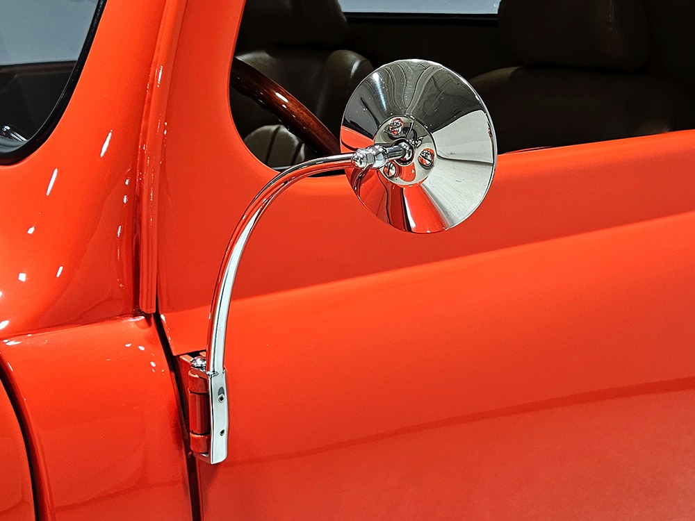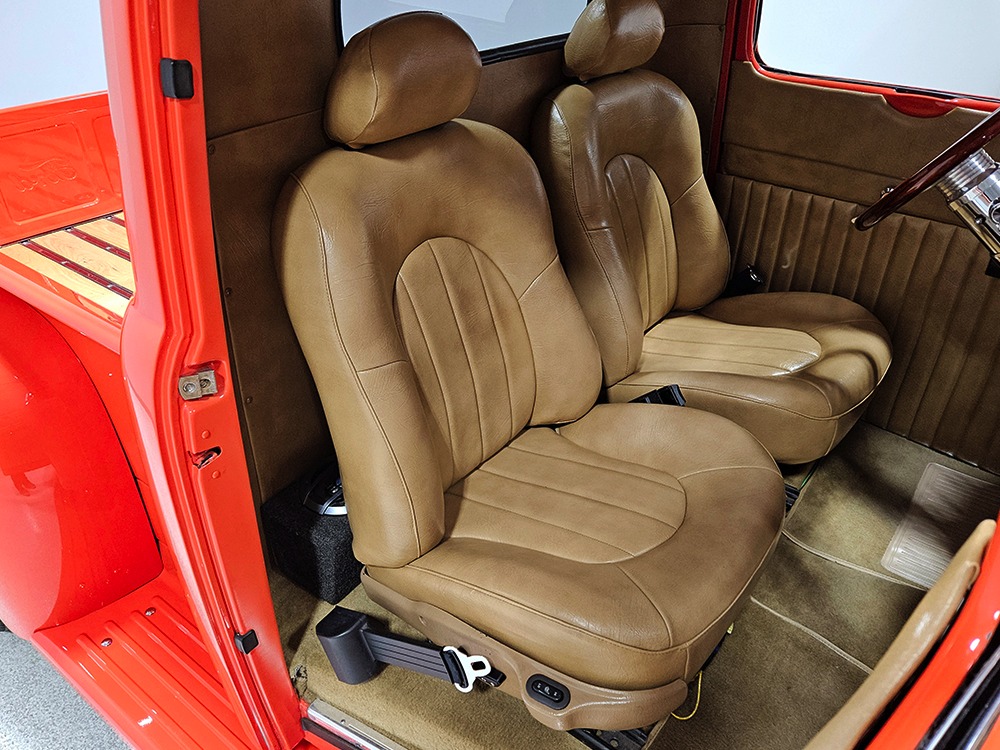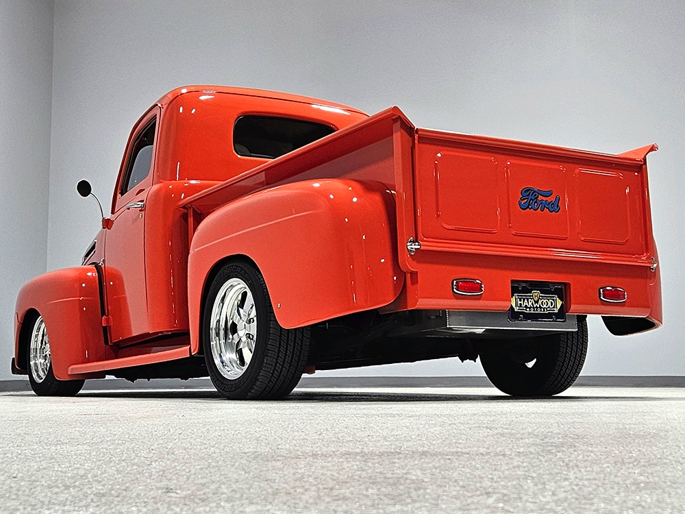 The tan interior is anchored by a pair of leather power bucket seats from a late-model, and everything else inside was tailored to match. Nice plush carpets with nicely stitched binding, custom door panels, and a beautiful headliner make this F-1 feel a lot more finished than many of its siblings. There’s a wood steering wheel on a chrome tilt steering column, so it’s easy to get comfortable, and the original dash was smoothed and painted to match the bodywork. A custom insert matches the shape of the factory gauges and includes all the necessary dials to monitor the engine, plus indicators for the turn signals and high-beams. Secondary controls are lower on the dash and a modern Pioneer AM/FM/CD/MP3 stereo head unit was neatly installed in the center. Other niceties include power windows, billet aluminum pedals, and a single windshield wiper, just for style points. Seat belts were also installed for safety.