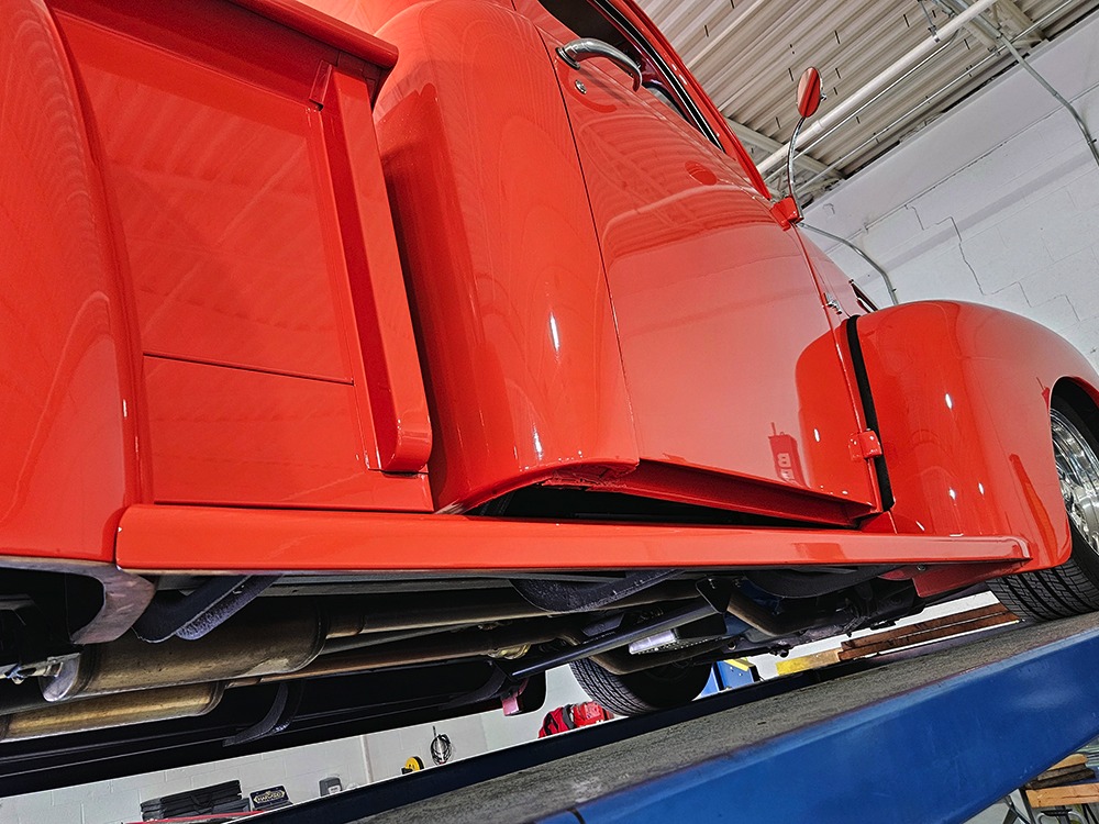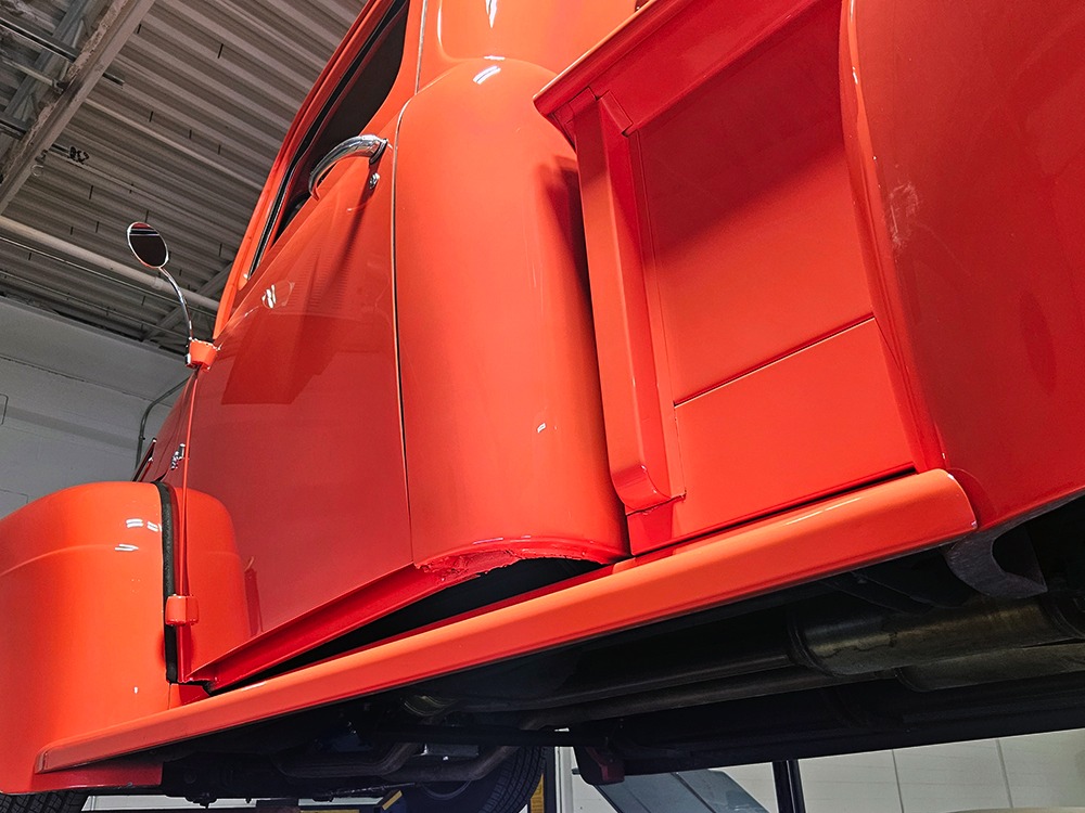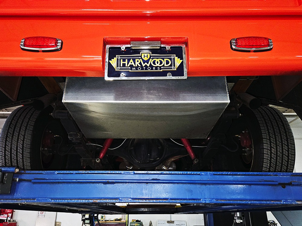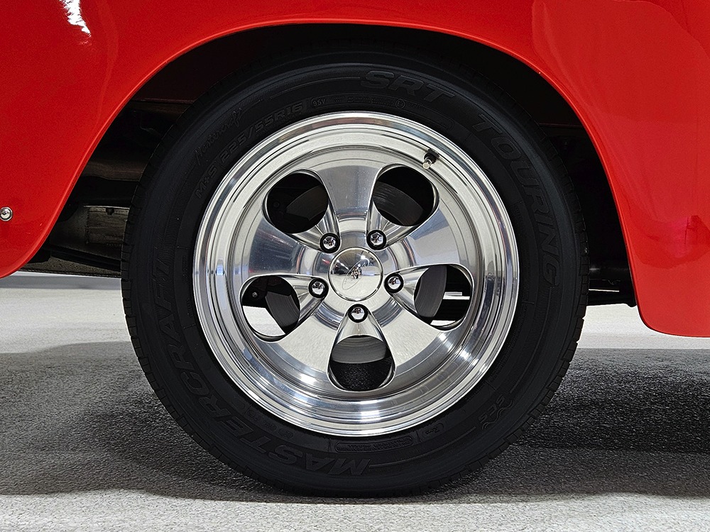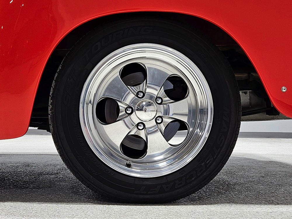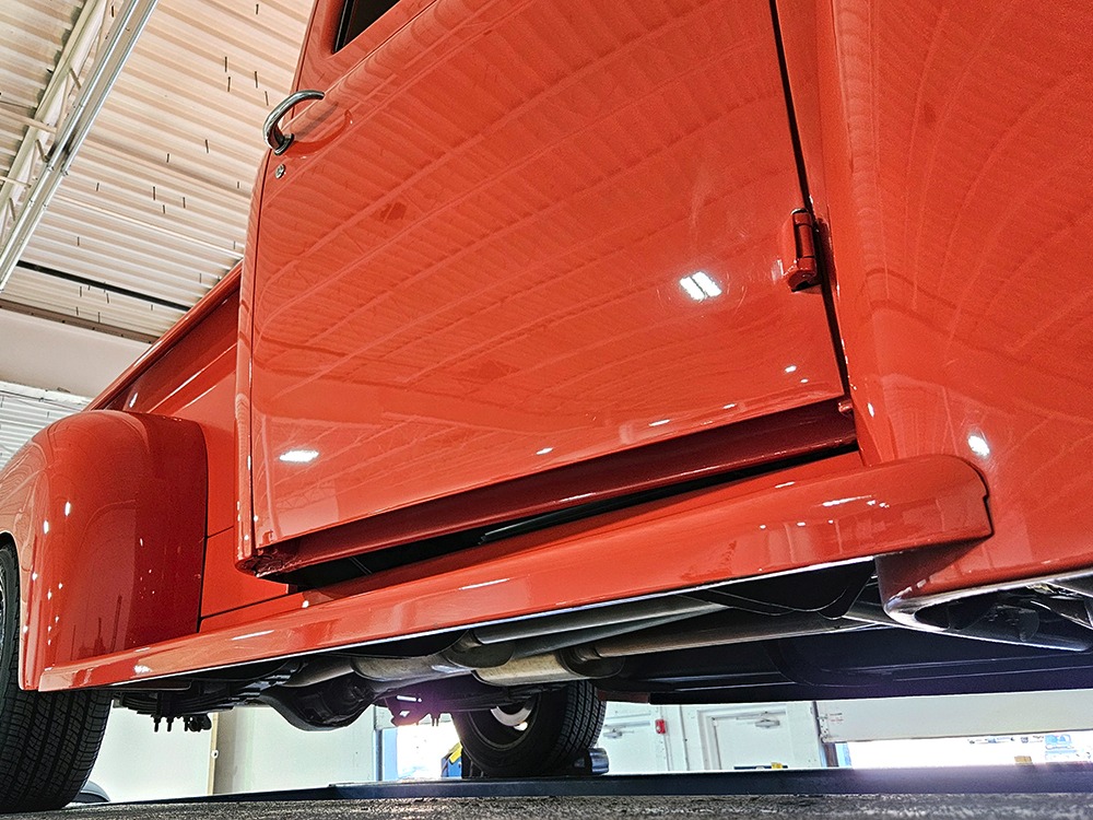 The engine is a 302 cubic inch Ford V8, a refreshing change in a sea of Chevy-powered street rods. The 302 is torquey and reliable, making the right sounds for a truck with an attitude. It’s not complicated, featuring a 4-barrel carburetor, HEI-style ignition, long-tube headers, and a mild cam that gives it a cool idle but never gets fussy. There’s a massive aluminum radiator in front, backed by an auxiliary electric fan, and power steering and 4-wheel disc brakes are part of the package. The front suspension is a Mustang II setup with power rack-and-pinion steering, the dual exhaust system has mellow-sounding Magnaflow mufflers, and the C4 3-speed automatic clips through the gears without any fuss. We believe there are 3.00 gears in the rear end, which is a 9-inch Ford, and the truck is indeed a fantastic highway cruiser that’s a veteran of several long-distance road trips. Again, simple is better, and with leaf springs and tube shocks out back, ride quality is decent and the stance is exactly right. There’s a big stainless gas tank hanging in back and it sits on 16-inch Eagle alloys carrying 225/55/16 performance radials with lots of life left in them.