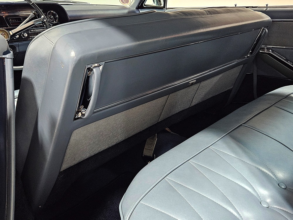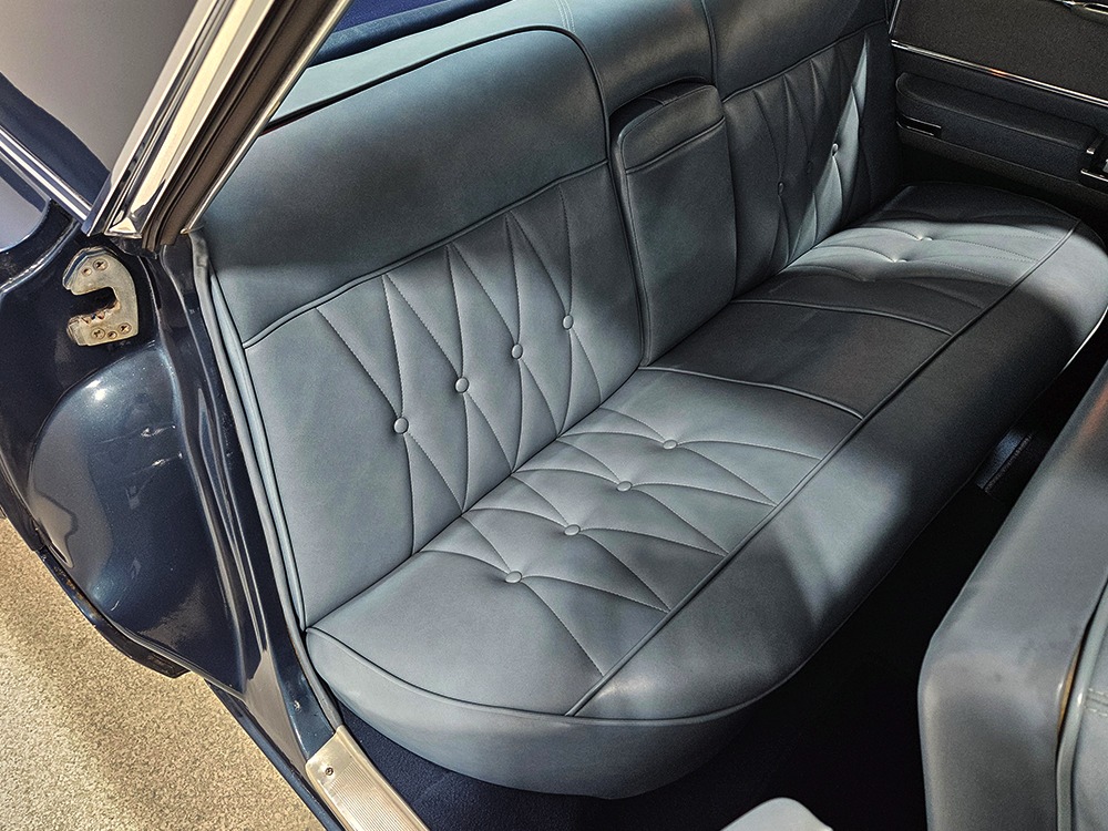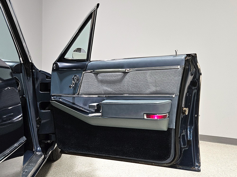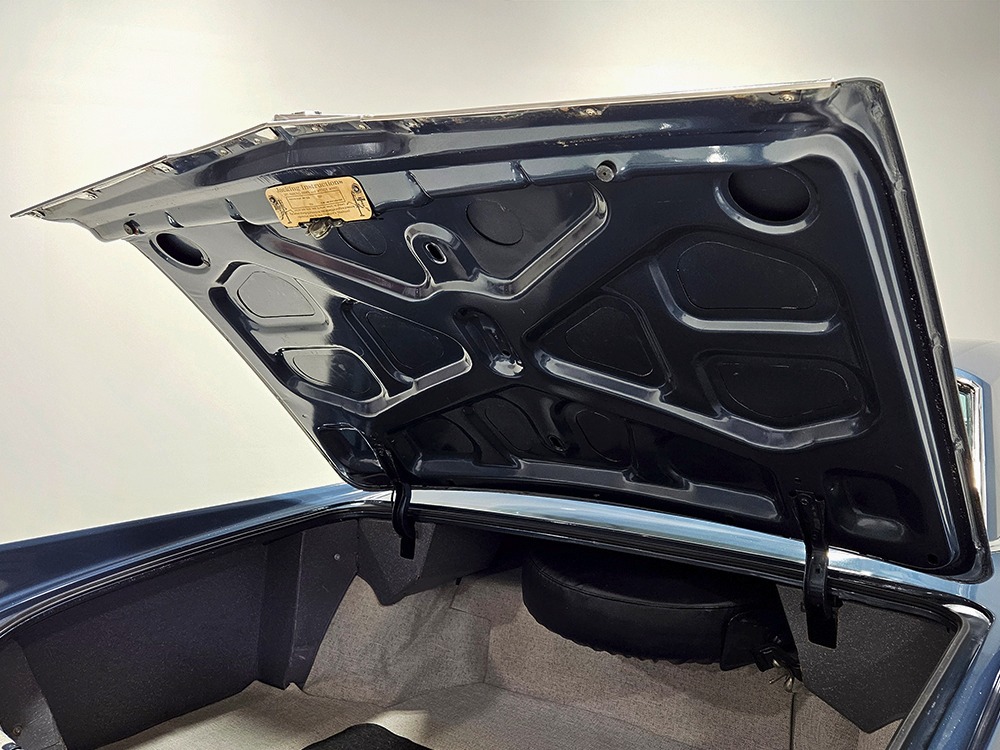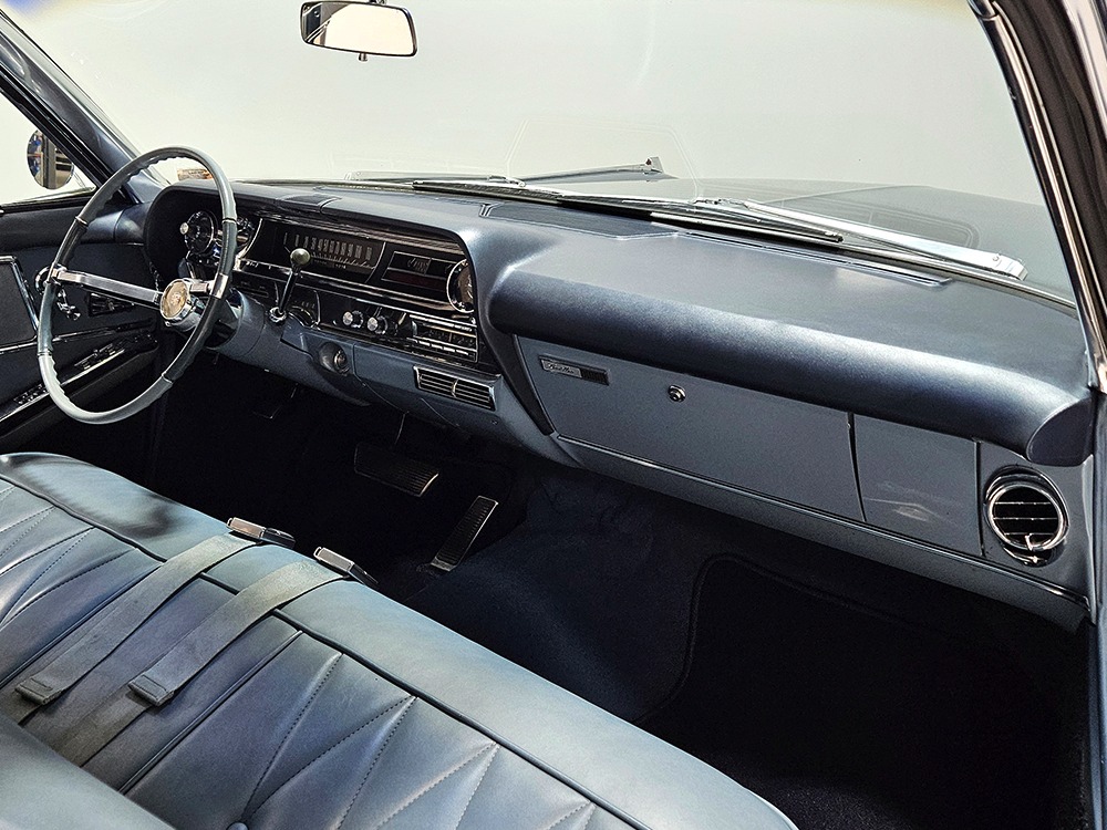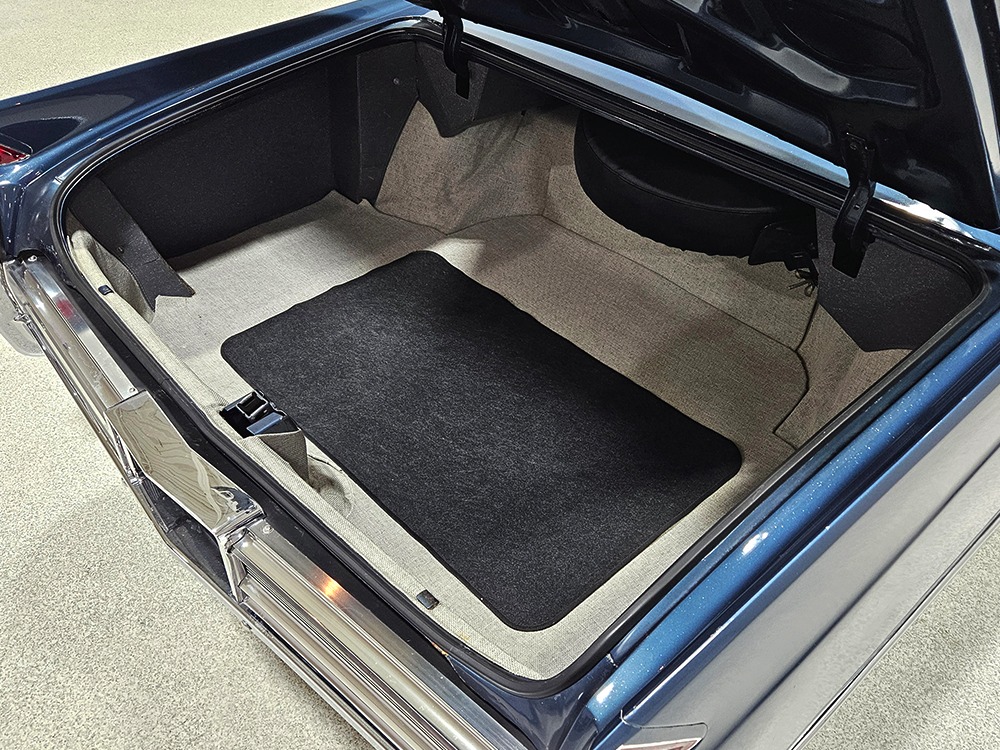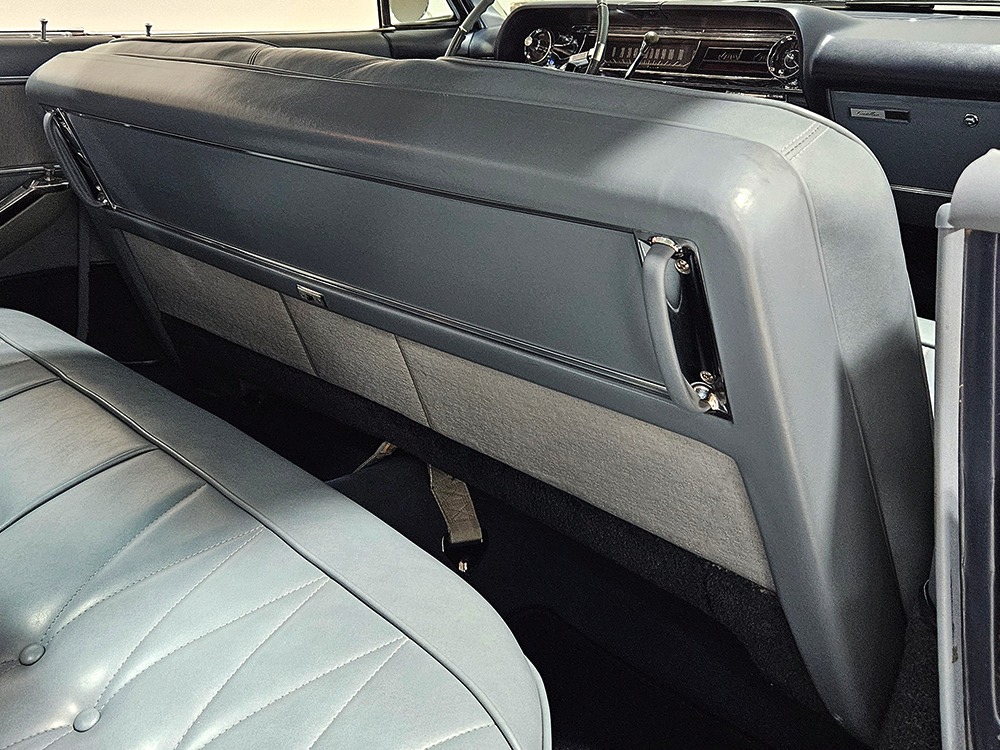 The blue interior is simply spectacular. Someone must have spent a fortune restoring it, because it uses original patterns to give a true 1964 vibe the moment you open the door. Wide bench seats feature armrests, so four passengers travel like kings and six can fit in a pinch. Plush carpets, ornate door panels, and that slick two-spoke steering wheel are all about quiet luxury. The chrome-laden dash speaks softly of mid-century modern design (no faux woodgrain here!) and all the instruments are operational. The power windows zip up and down, the AM/FM radio works properly (including the power antenna), and the interior courtesy lights are all LEDs. Of note, the A/C system has been partially removed (all the components are included with the car) and the power seat clicks but does not move, but everything else works like it should. The back seat features spacious stretch-out room only found in limousines today, and the headliner is beautifully finished. In back, there’s a positively massive trunk that’s nicely detailed with correct cardboard bulkheads and mats, plus a full-sized spare and jack assembly.