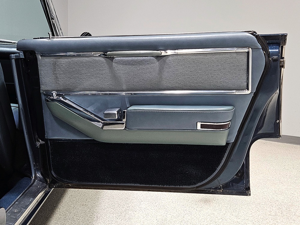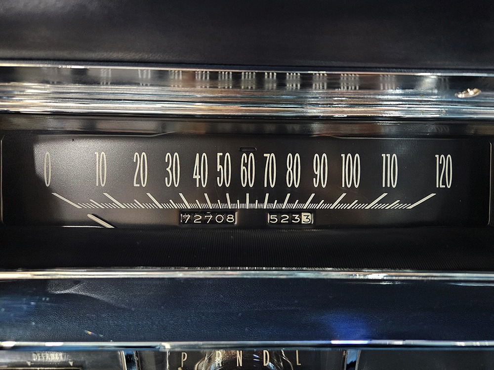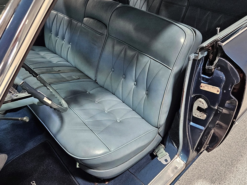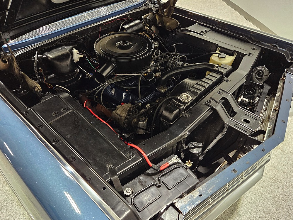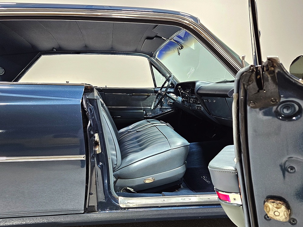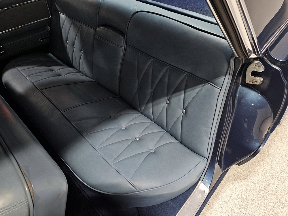 The blue interior is simply spectacular. Someone must have spent a fortune restoring it, because it uses original patterns to give a true 1964 vibe the moment you open the door. Wide bench seats feature armrests, so four passengers travel like kings and six can fit in a pinch. Plush carpets, ornate door panels, and that slick two-spoke steering wheel are all about quiet luxury. The chrome-laden dash speaks softly of mid-century modern design (no faux woodgrain here!) and all the instruments are operational. The power windows zip up and down, the AM/FM radio works properly (including the power antenna), and the interior courtesy lights are all LEDs. Of note, the A/C system has been partially removed (all the components are included with the car) and the power seat clicks but does not move, but everything else works like it should. The back seat features spacious stretch-out room only found in limousines today, and the headliner is beautifully finished. In back, there’s a positively massive trunk that’s nicely detailed with correct cardboard bulkheads and mats, plus a full-sized spare and jack assembly.