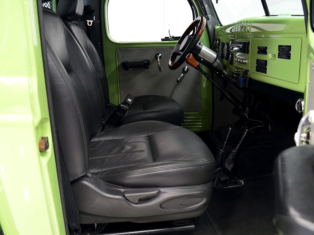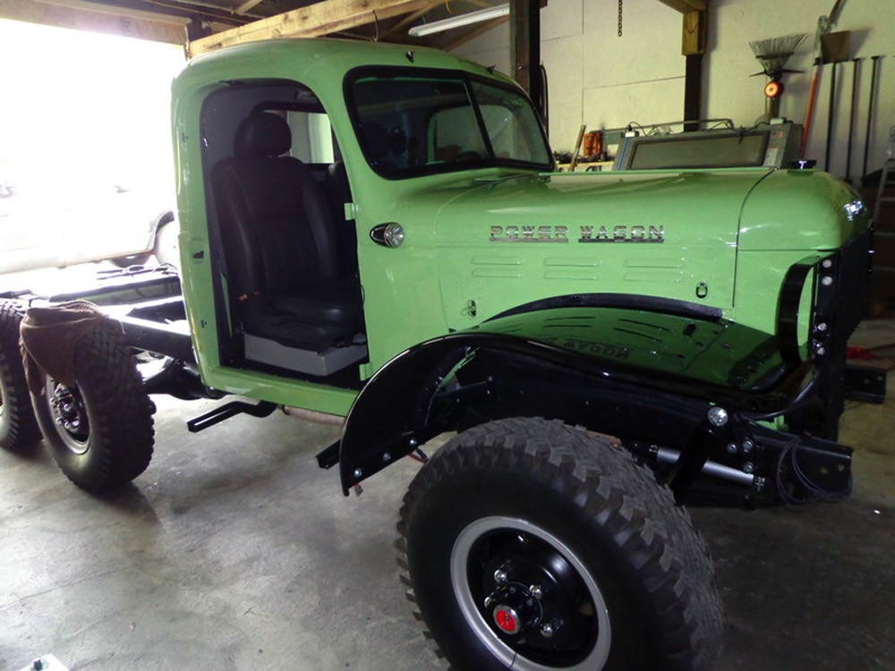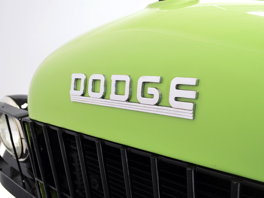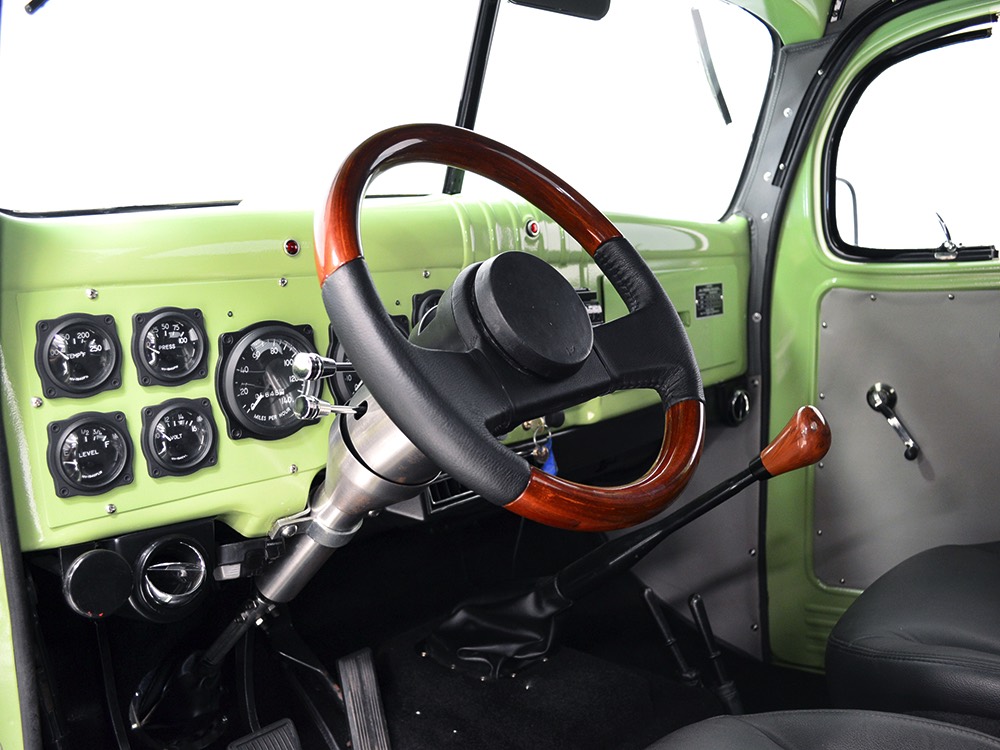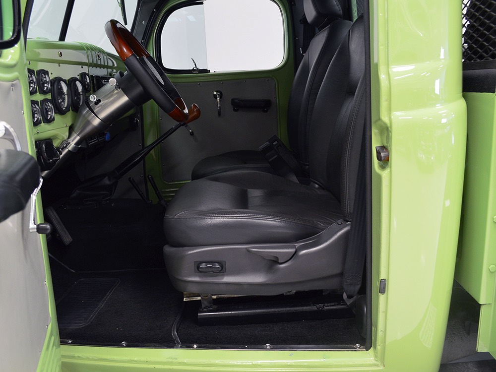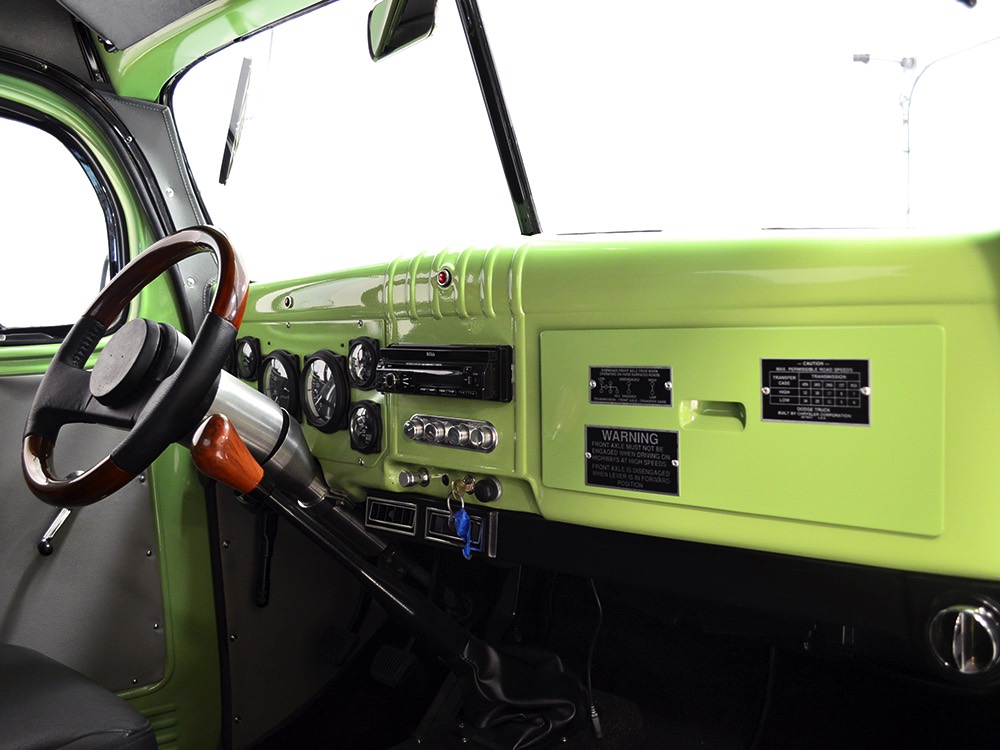The interior also keeps the original Power Wagon spirit alive while adding modern creature comforts. A pair of charcoal gray leather buckets replace the original vinyl bench, and while the upgrade makes this Power Wagon strictly a 2-seater, the improvement in comfort is tangible. Other smart changes include a tilt steering column with a pretty wood-rimmed wheel, powerful Vintage Air A/C that’s neatly integrated into the dash, and a touch-screen AM/FM/satellite/iPod/Bluetooth stereo system that folds out of the center of the dash. Those handsome gauges have a vaguely aircraft look to them and monitor all the vitals, including exhaust gas temperature and boost, among others. But the overall shape of the dash will be familiar to any Power Wagon owner and the glove box lid still includes the iconic shift diagrams and warnings about top speed in various gears (all of which are completely moot, by the way). Carpets help control noise and heat and give it a nicely trimmed look, and simple door panels and a standard fiberboard headliner keep the look 100% Dodge. There’s space enough for a six-footer behind the wheel and the commanding view means you’re eye to eye with semi-truck drivers. Nothing stands taller in traffic than this bright green Dodge.