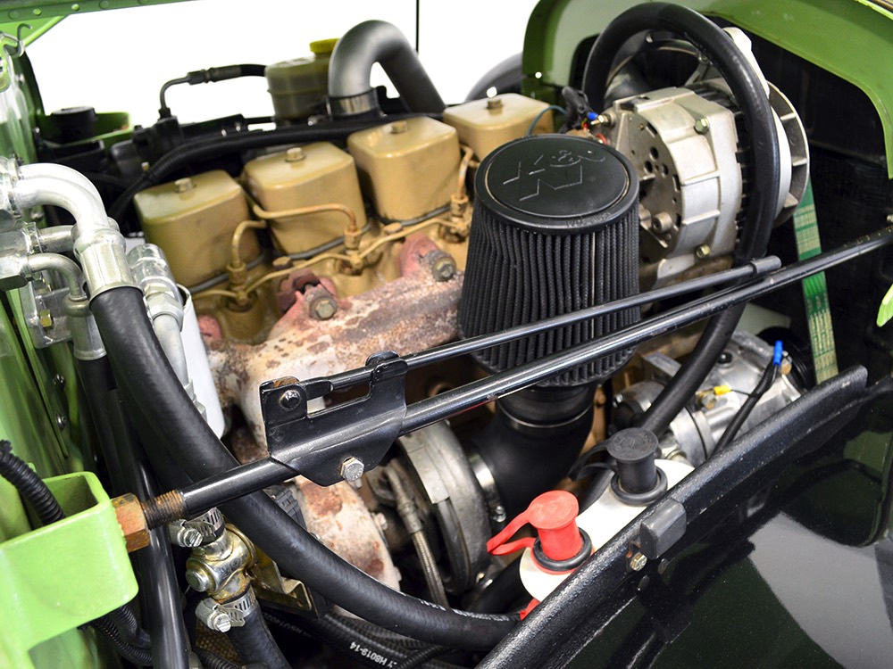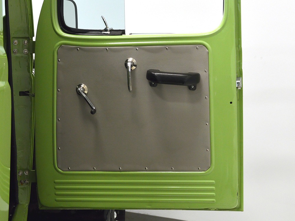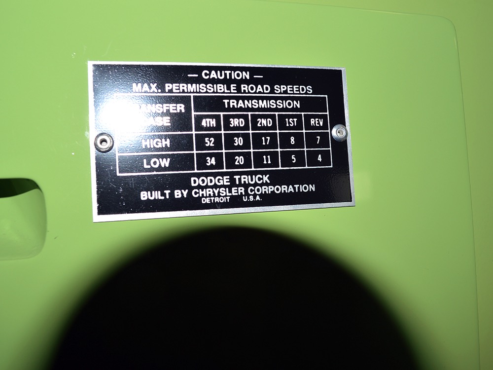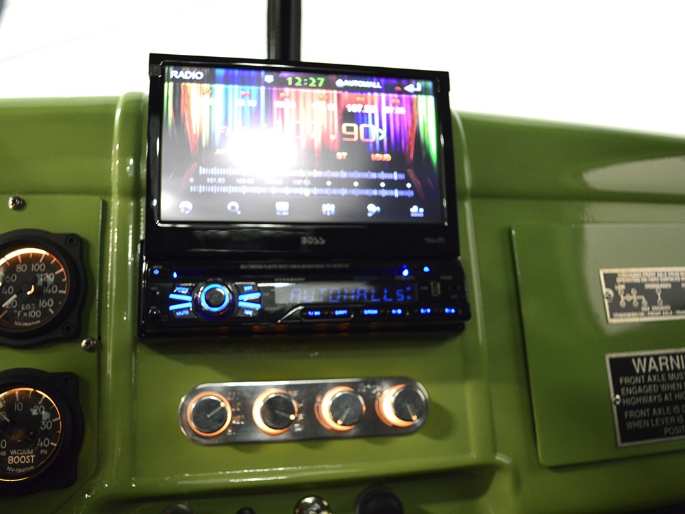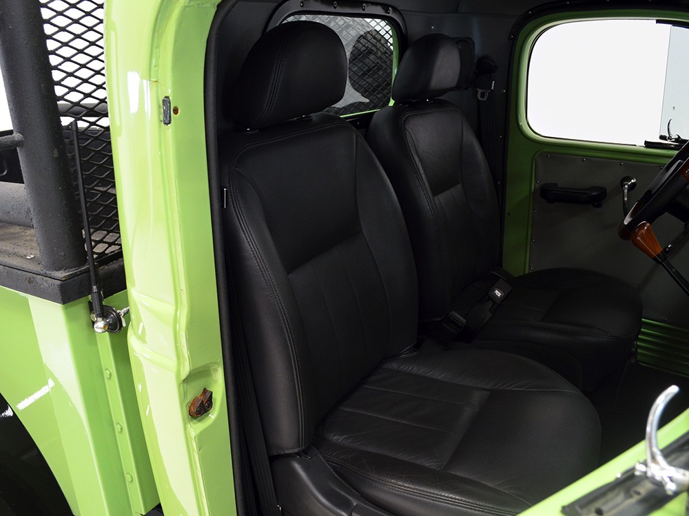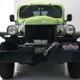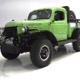 The interior also keeps the original Power Wagon spirit alive while adding modern creature comforts. A pair of charcoal gray leather buckets replace the original vinyl bench, and while the upgrade makes this Power Wagon strictly a 2-seater, the improvement in comfort is tangible. Other smart changes include a tilt steering column with a pretty wood-rimmed wheel, powerful Vintage Air A/C that’s neatly integrated into the dash, and a touch-screen AM/FM/satellite/iPod/Bluetooth stereo system that folds out of the center of the dash. Those handsome gauges have a vaguely aircraft look to them and monitor all the vitals, including exhaust gas temperature and boost, among others. But the overall shape of the dash will be familiar to any Power Wagon owner and the glove box lid still includes the iconic shift diagrams and warnings about top speed in various gears (all of which are completely moot, by the way). Carpets help control noise and heat and give it a nicely trimmed look, and simple door panels and a standard fiberboard headliner keep the look 100% Dodge. There’s space enough for a six-footer behind the wheel and the commanding view means you’re eye to eye with semi-truck drivers. Nothing stands taller in traffic than this bright green Dodge.