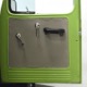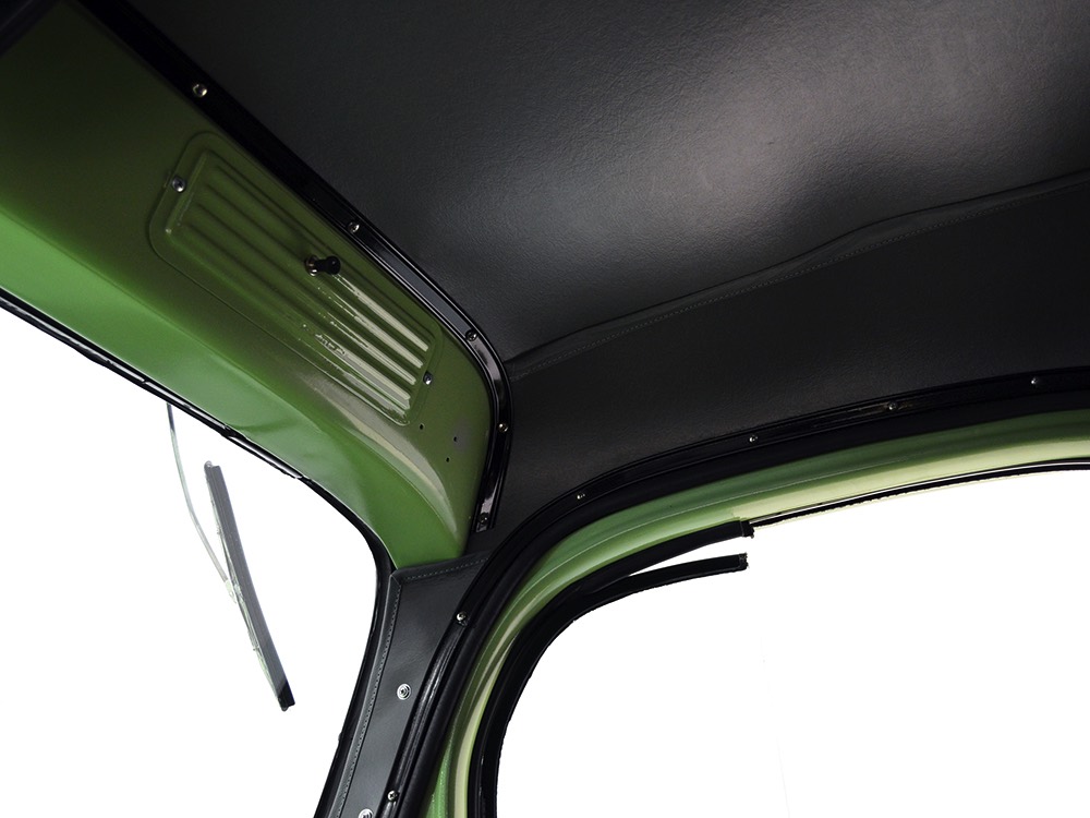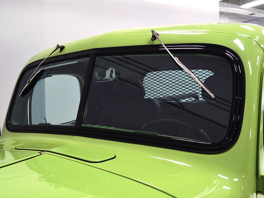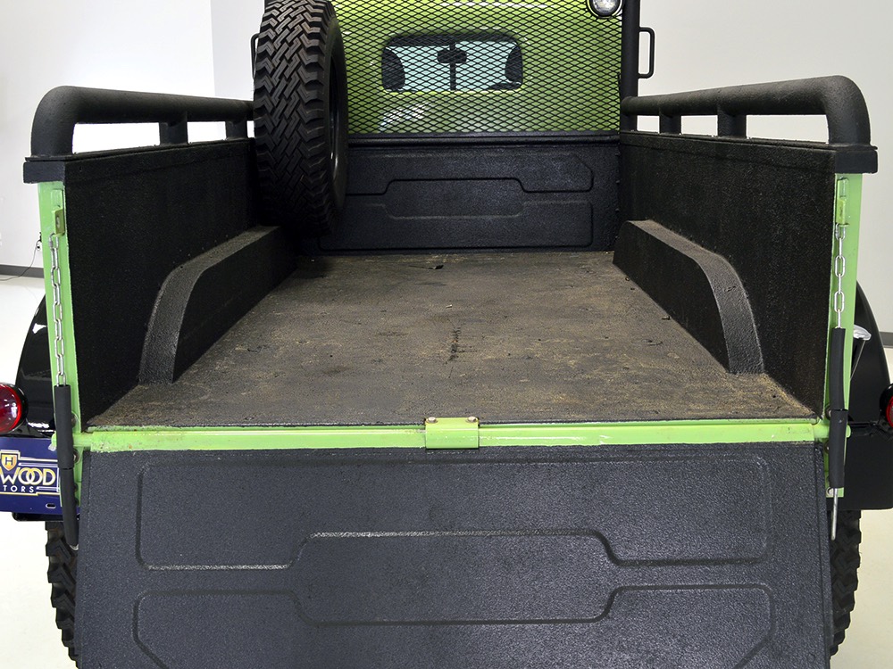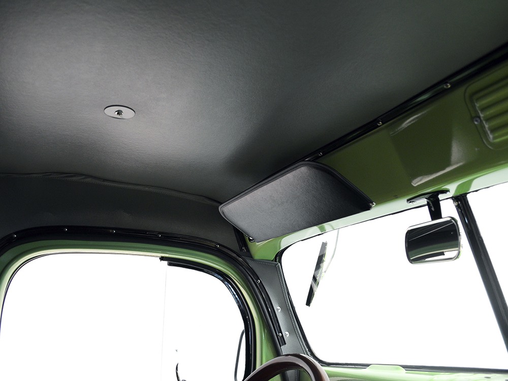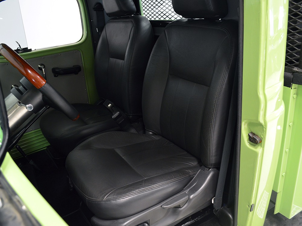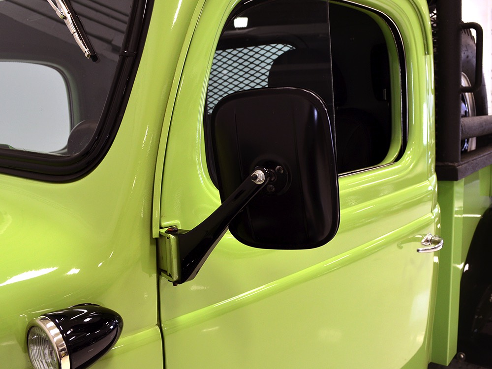 The interior also keeps the original Power Wagon spirit alive while adding modern creature comforts. A pair of charcoal gray leather buckets replace the original vinyl bench, and while the upgrade makes this Power Wagon strictly a 2-seater, the improvement in comfort is tangible. Other smart changes include a tilt steering column with a pretty wood-rimmed wheel, powerful Vintage Air A/C that’s neatly integrated into the dash, and a touch-screen AM/FM/satellite/iPod/Bluetooth stereo system that folds out of the center of the dash. Those handsome gauges have a vaguely aircraft look to them and monitor all the vitals, including exhaust gas temperature and boost, among others. But the overall shape of the dash will be familiar to any Power Wagon owner and the glove box lid still includes the iconic shift diagrams and warnings about top speed in various gears (all of which are completely moot, by the way). Carpets help control noise and heat and give it a nicely trimmed look, and simple door panels and a standard fiberboard headliner keep the look 100% Dodge. There’s space enough for a six-footer behind the wheel and the commanding view means you’re eye to eye with semi-truck drivers. Nothing stands taller in traffic than this bright green Dodge.