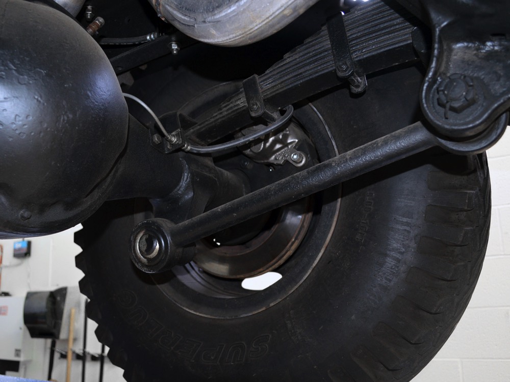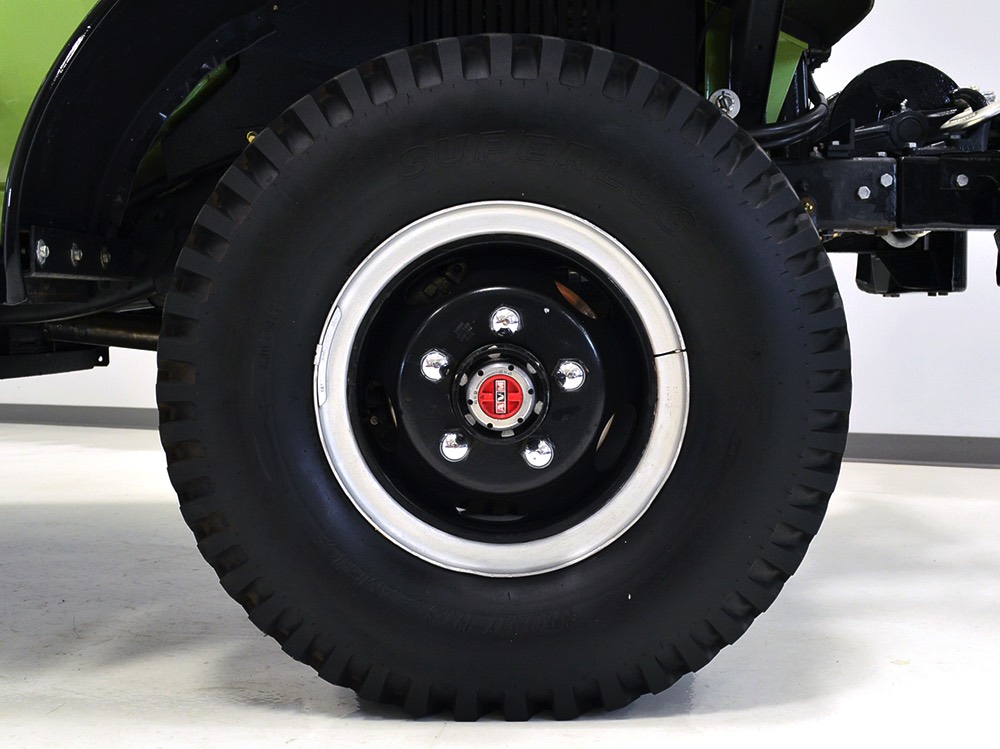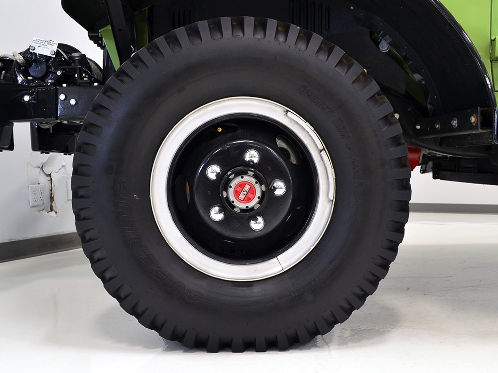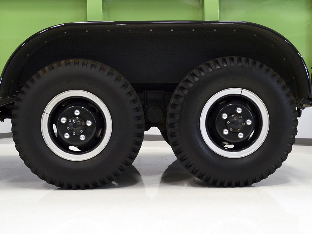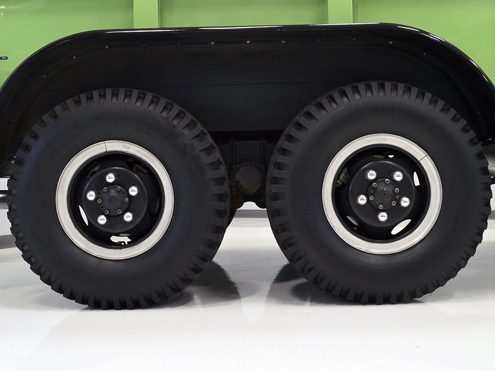 This one is surprisingly smooth and driving is easy, and after a few miles, you’ll feel like you’re at the wheel of a much more contemporary machine. Thanks to a ZF6 5-speed manual transmission, it cruises effortlessly at 65-70 MPH in overdrive, and there’s a low first gear that idles at a walking pace but we’ve found that for ordinary driving, it’s easier to just start in 2nd. Of course, there’s also a remarkable 2-speed transfer case that has three output shafts, one for each axle, and in regular driving, only the two rear axles are powered. It’s actually pretty impressive to glance under this truck and see the details that went into that articulating rear suspension and because of it, the rear of this truck just hovers over bumps, giving it a better than expected ride. There are "high speed" 4.89 gears in the pumpkins, so it’s plenty powerful around town and we’ve learned that most drivers are surprised that this big, ancient 4x4 is also so quick. Fortunately, you also have a giant disc brake behind each wheel—six of them!—so braking power is beyond impressive, especially with Hydro-Boost power assist. A custom exhaust system fits neatly underneath and doesn’t compromise ground clearance and gives it a bit of a big rig sound, especially with the blow-off valve on the turbo doing its thing. Stock Power Wagon wheels are really the right choice on a build like this, and they’re wrapped in a set of giant 11.00x16 Superlug off-road tires which, remarkably, ride pretty well.