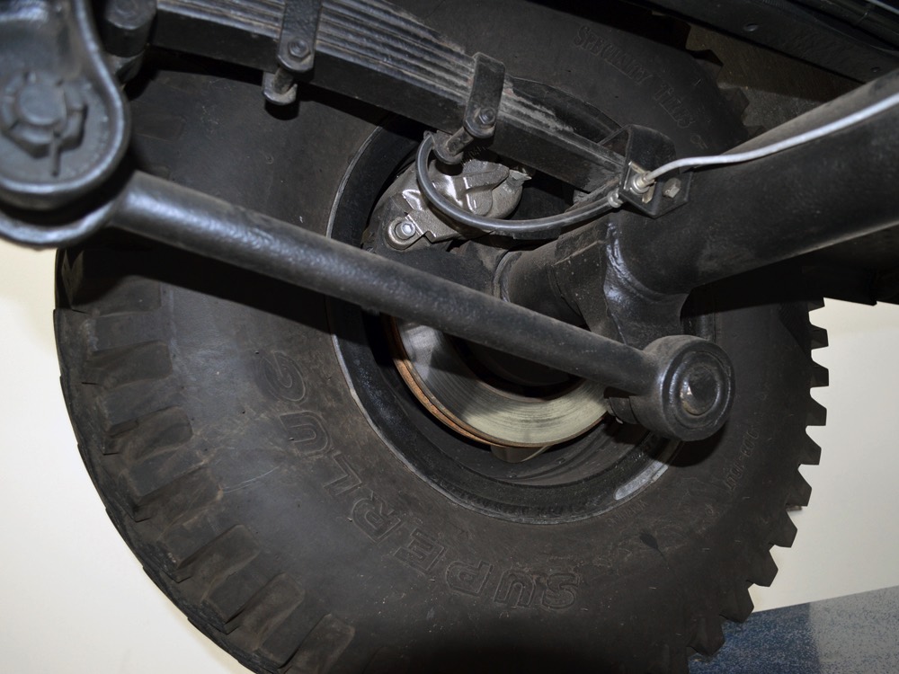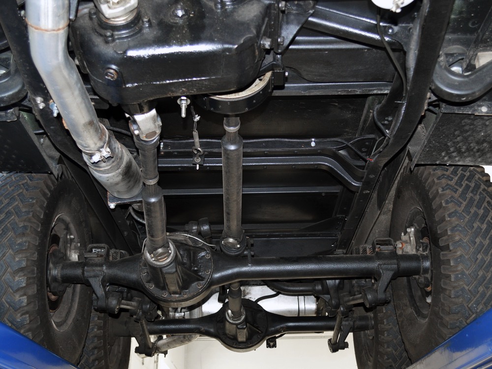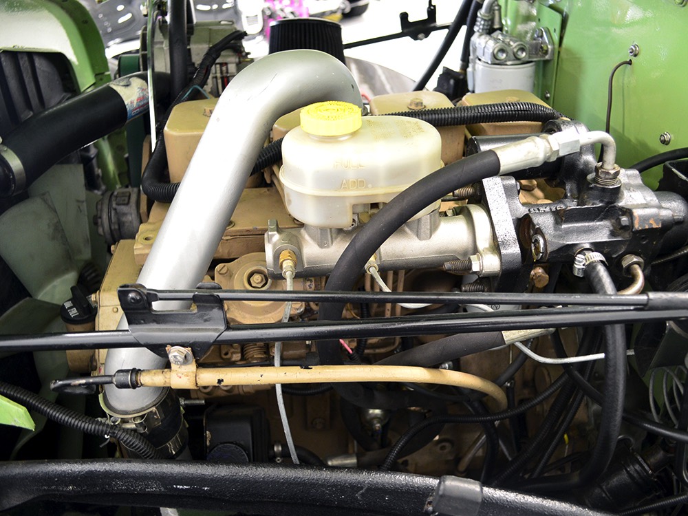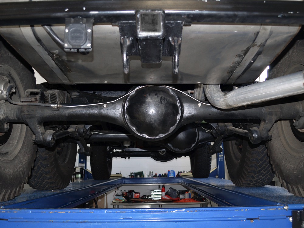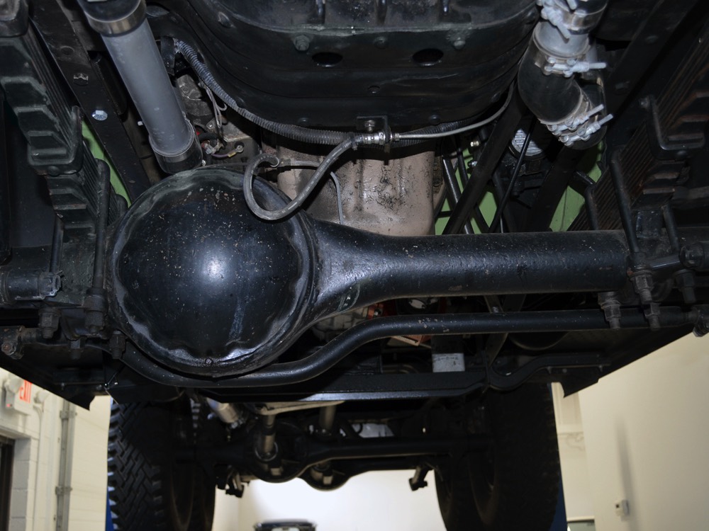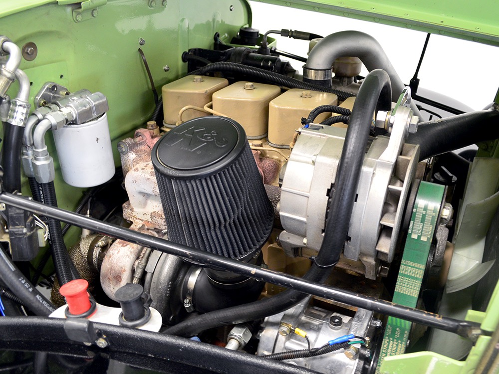 This one is surprisingly smooth and driving is easy, and after a few miles, you’ll feel like you’re at the wheel of a much more contemporary machine. Thanks to a ZF6 5-speed manual transmission, it cruises effortlessly at 65-70 MPH in overdrive, and there’s a low first gear that idles at a walking pace but we’ve found that for ordinary driving, it’s easier to just start in 2nd. Of course, there’s also a remarkable 2-speed transfer case that has three output shafts, one for each axle, and in regular driving, only the two rear axles are powered. It’s actually pretty impressive to glance under this truck and see the details that went into that articulating rear suspension and because of it, the rear of this truck just hovers over bumps, giving it a better than expected ride. There are "high speed" 4.89 gears in the pumpkins, so it’s plenty powerful around town and we’ve learned that most drivers are surprised that this big, ancient 4x4 is also so quick. Fortunately, you also have a giant disc brake behind each wheel—six of them!—so braking power is beyond impressive, especially with Hydro-Boost power assist. A custom exhaust system fits neatly underneath and doesn’t compromise ground clearance and gives it a bit of a big rig sound, especially with the blow-off valve on the turbo doing its thing. Stock Power Wagon wheels are really the right choice on a build like this, and they’re wrapped in a set of giant 11.00x16 Superlug off-road tires which, remarkably, ride pretty well.