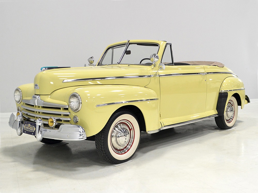 Some of our favorite cars are the 1940s Ford convertibles, which seem to combine everything that we love about these machines: great road manners, attractive styling, and they’re big enough for the whole family to be comfortable on road trips. They handle, brake, and cruise with modern traffic and they’re quite comfortable. This 1948 Ford Super Deluxe convertible, for example, offers a wonderful color combination and a nice older restoration that still presents extremely well. Ford called the color “Maize Yellow” and it’s a cheerful alternative to all the maroon and dark blue Fords you see at shows. It’s not a bright yellow, but a creamy soft yellow that looks great and attracts a lot of attention whenever it’s out in public. Paint and bodywork are quite good and there are no signs that this was ever a rusty car. The doors open and close properly and you’ll note that the gaps are quite tight all around. The ’47 and ’48 cars are almost identical, as there was an all-new ’49 model in the works, and this ’48 sports all its correct dress-up parts, including the beautiful hood ornament with a blue Plexiglas insert and accessory bumper ends that make it look imposing. All the chrome was refinished, including the bumpers and door handles, but the good news is that most the trim is stainless steel, so it can always be polished up to look almost new (not that it needs it). Other accessories include twin side mirrors that are cleverly integrated into the side trim, twin fog lamps up front, and a pair of spot lights on the windshield posts.